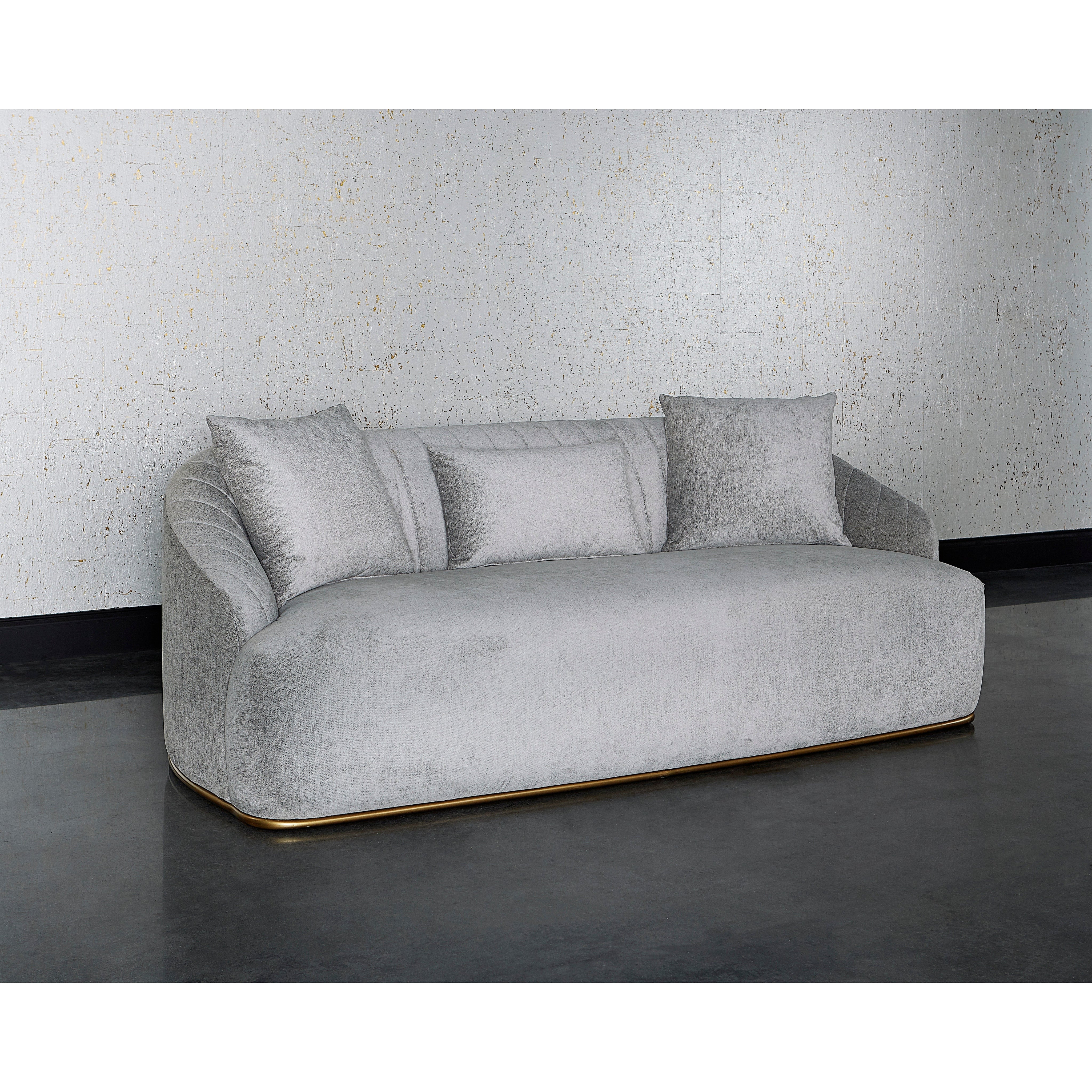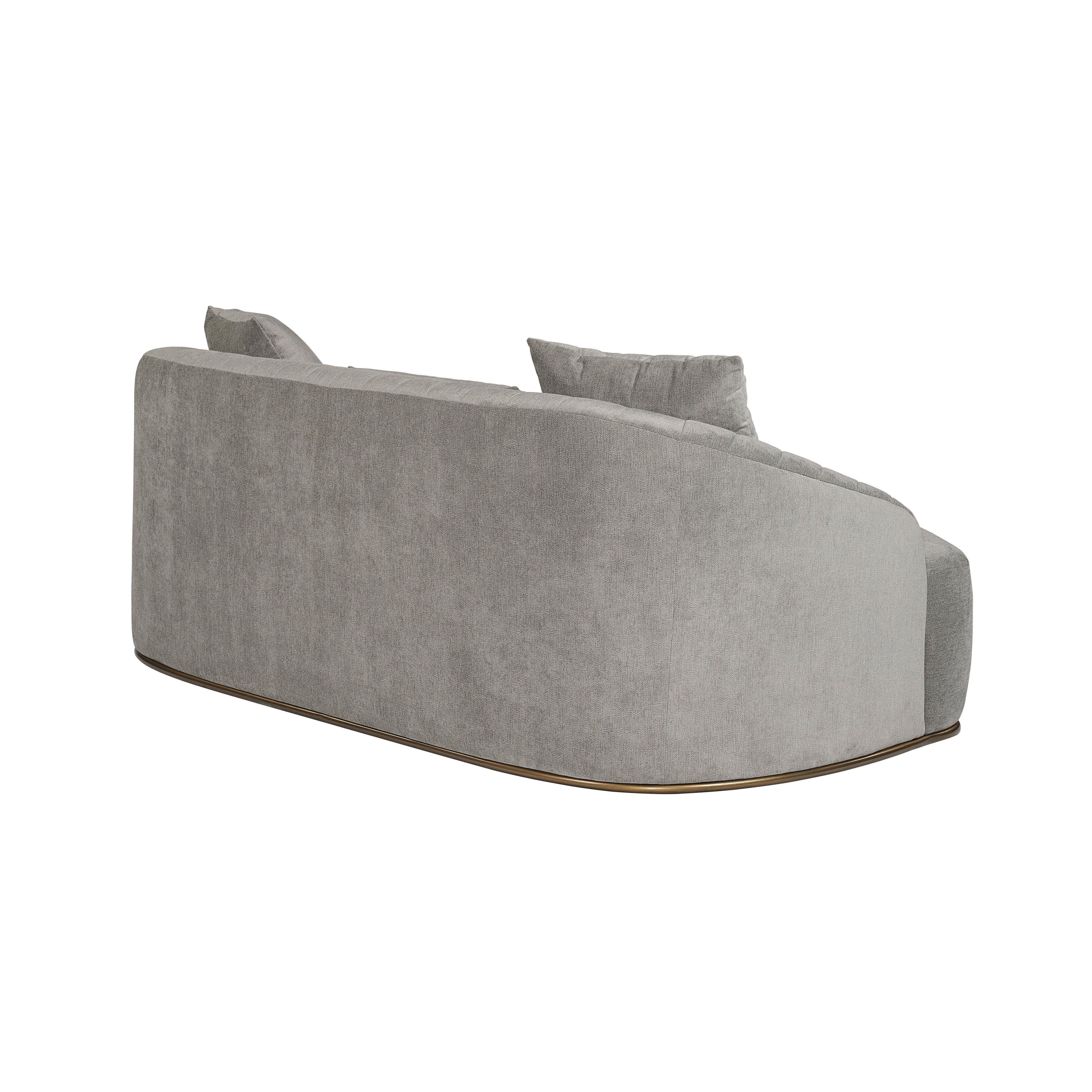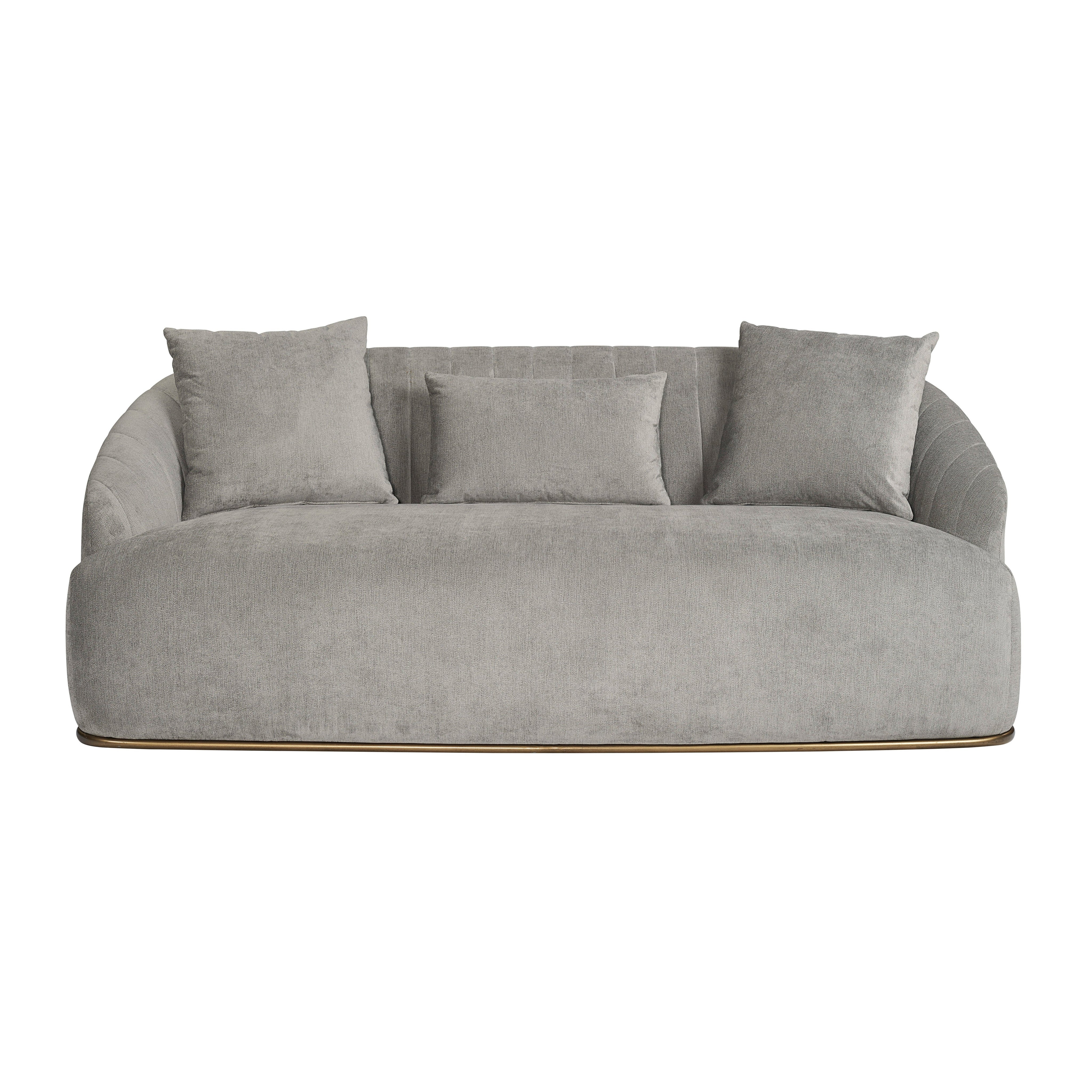 The beautiful lines of this sofa will make a bold and comfortable statement in any space. Features a curved seatback with channel tufting in polo club stone performance fabric. Finished with an antique brass steel frame. Three cushions included. Performance fabric is moisture repellent, durable and easy to clean.