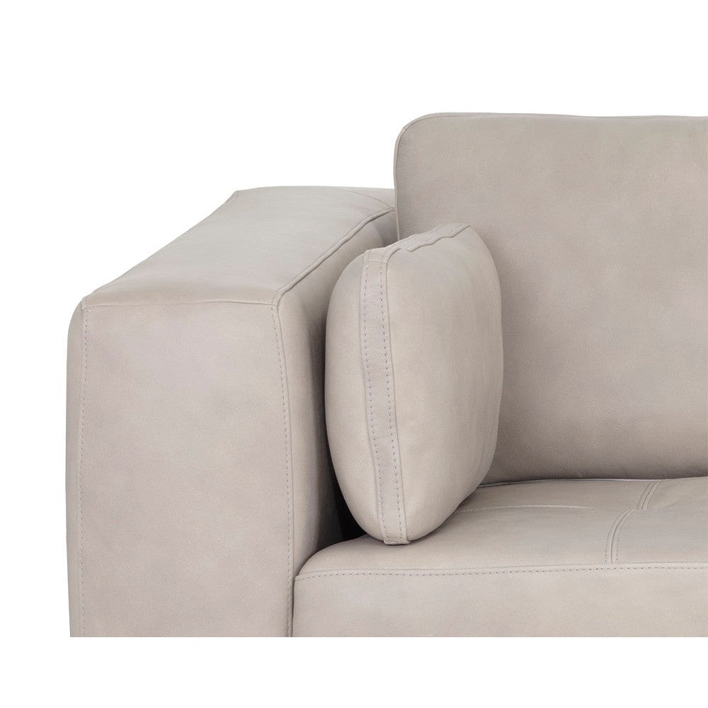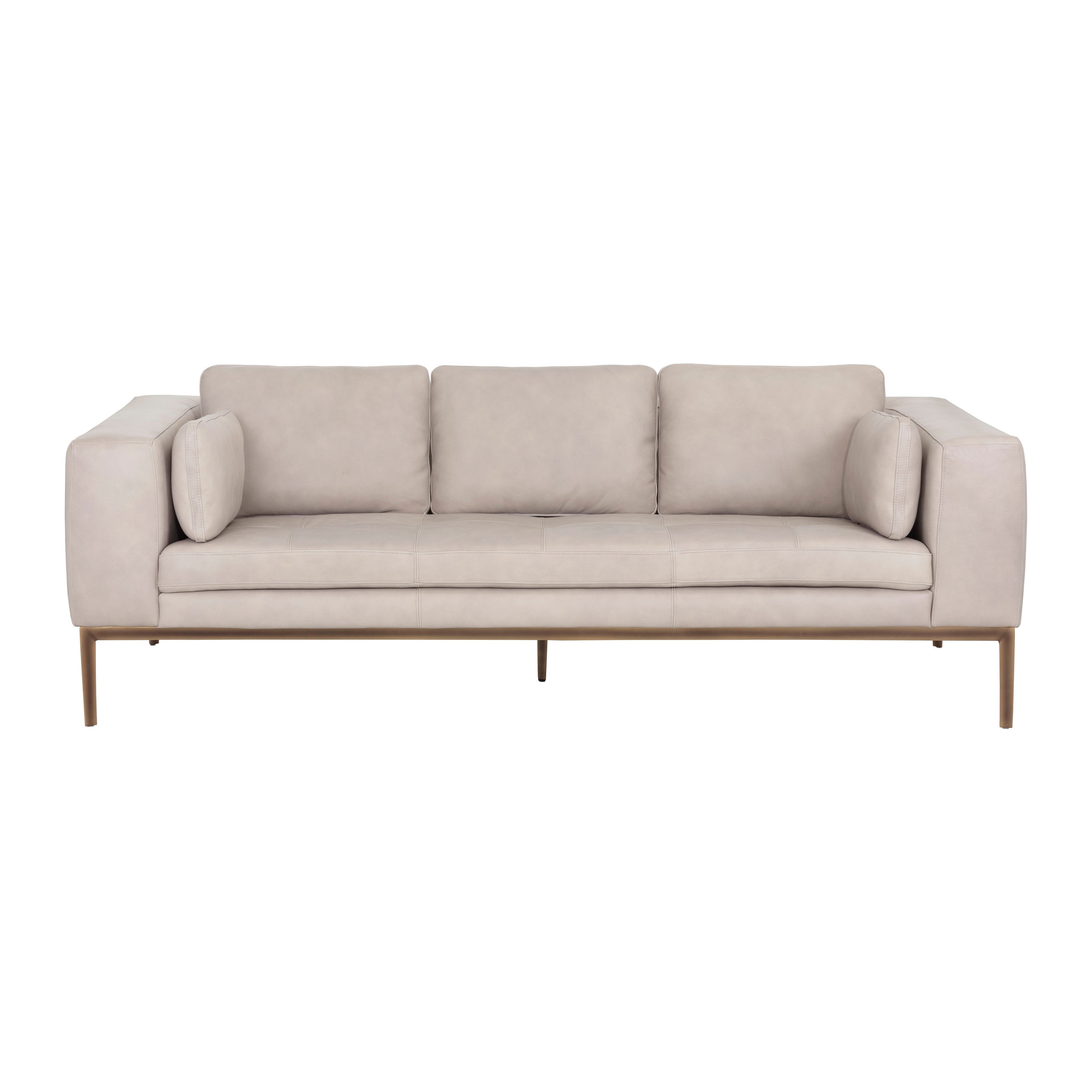 A masculine sofa with a modern design. Features an oversized seat and armrests with antique brass feet. Stocked in bali bone leather. Can be paired with coordinating armchair. Handle with Care: This design has been crafted with leather. Leather is a natural material; as such markings, wrinkles, grooves and light scratches are acceptable and appreciated characteristics. No two pieces are alike. Visit our Product Care page for more information on how to ensure the lasting beauty of this piece.