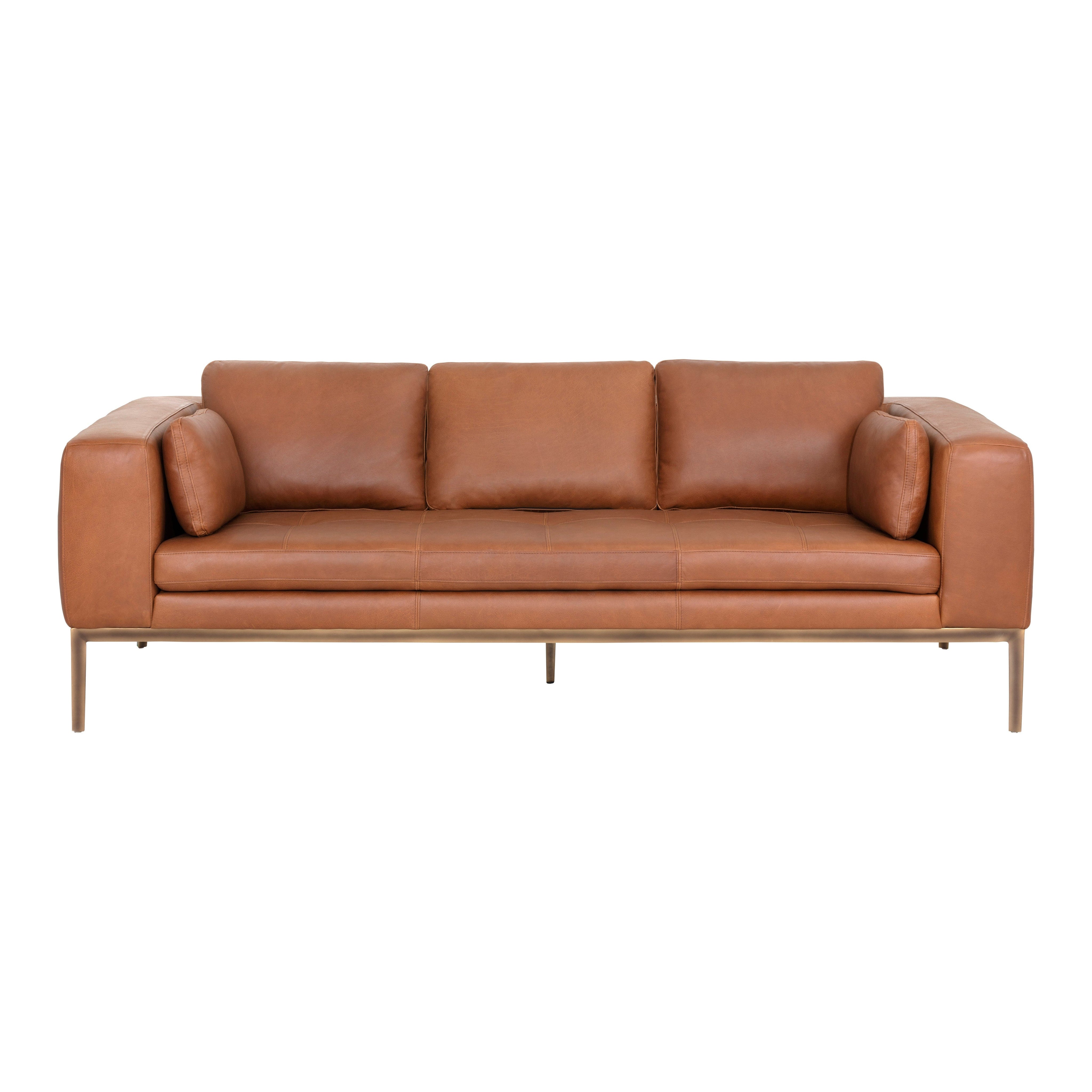 A masculine sofa with a modern design. Features an oversized seat and armrests with antique brass feet. Stocked in behike saddle leather. Can be paired with coordinating armchair. Handle with Care: This design has been crafted with leather. Leather is a natural material; as such markings, wrinkles, grooves and light scratches are acceptable and appreciated characteristics. No two pieces are alike. Visit our Product Care page for more information on how to ensure the lasting beauty of this piece.