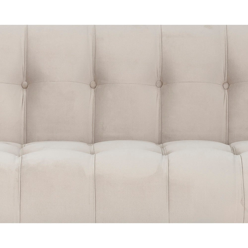 The streamlined design of this sofa is bold yet refined. Features beautiful deep button tufting, piping, and an exposed rustic bronze steel frame. Stocked in piccolo prosecco performance fabric. Perfect for residential and commercial settings. Performance fabric is moisture repellent, durable and easy to clean.