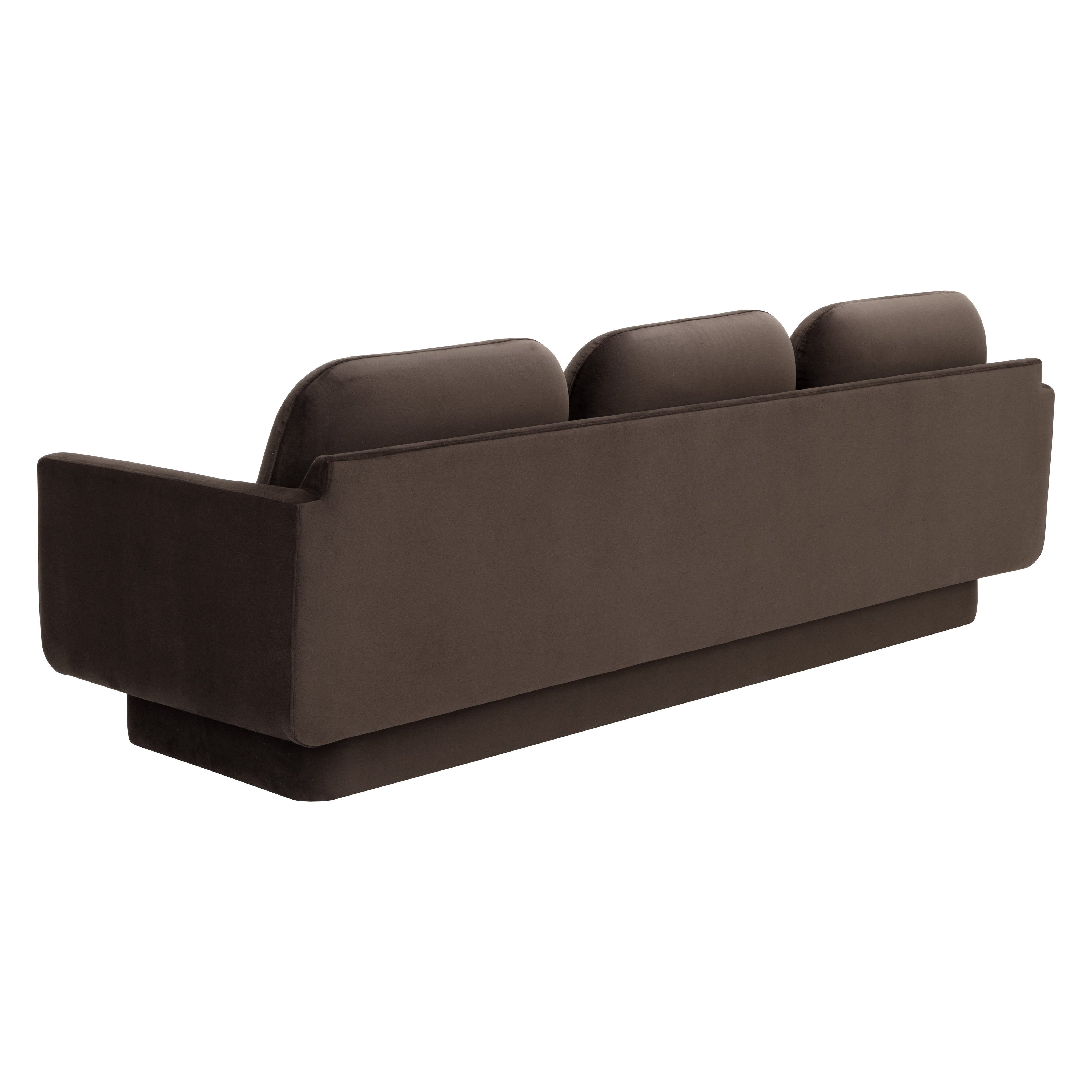 The Everton Sofa exudes classic comfort. Featuring a low profile with loose back cushions and rounded edges for a retro feel. This sofa is fully upholstered in smooth meg dark brown fabric for an inviting design that will captivate in any setting.