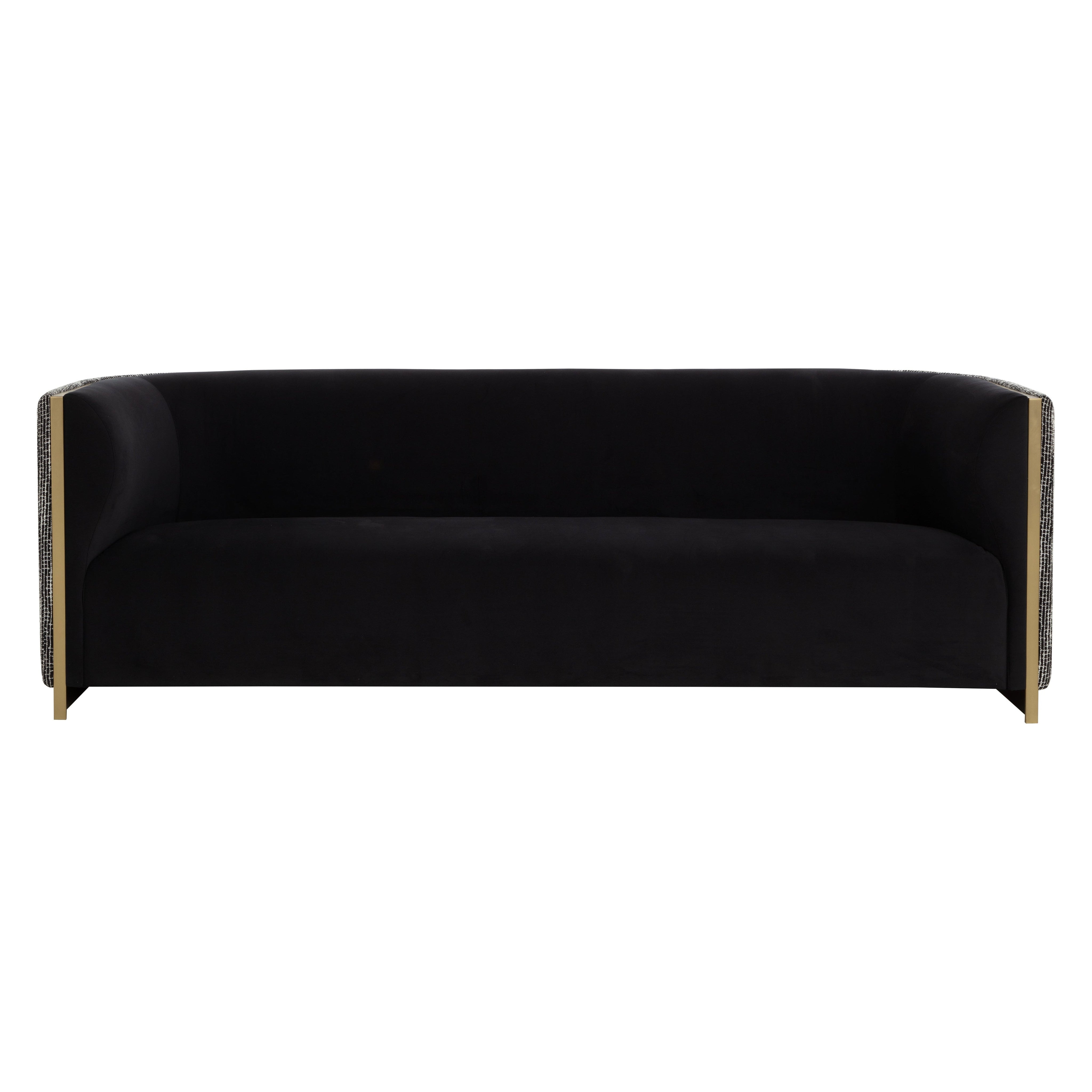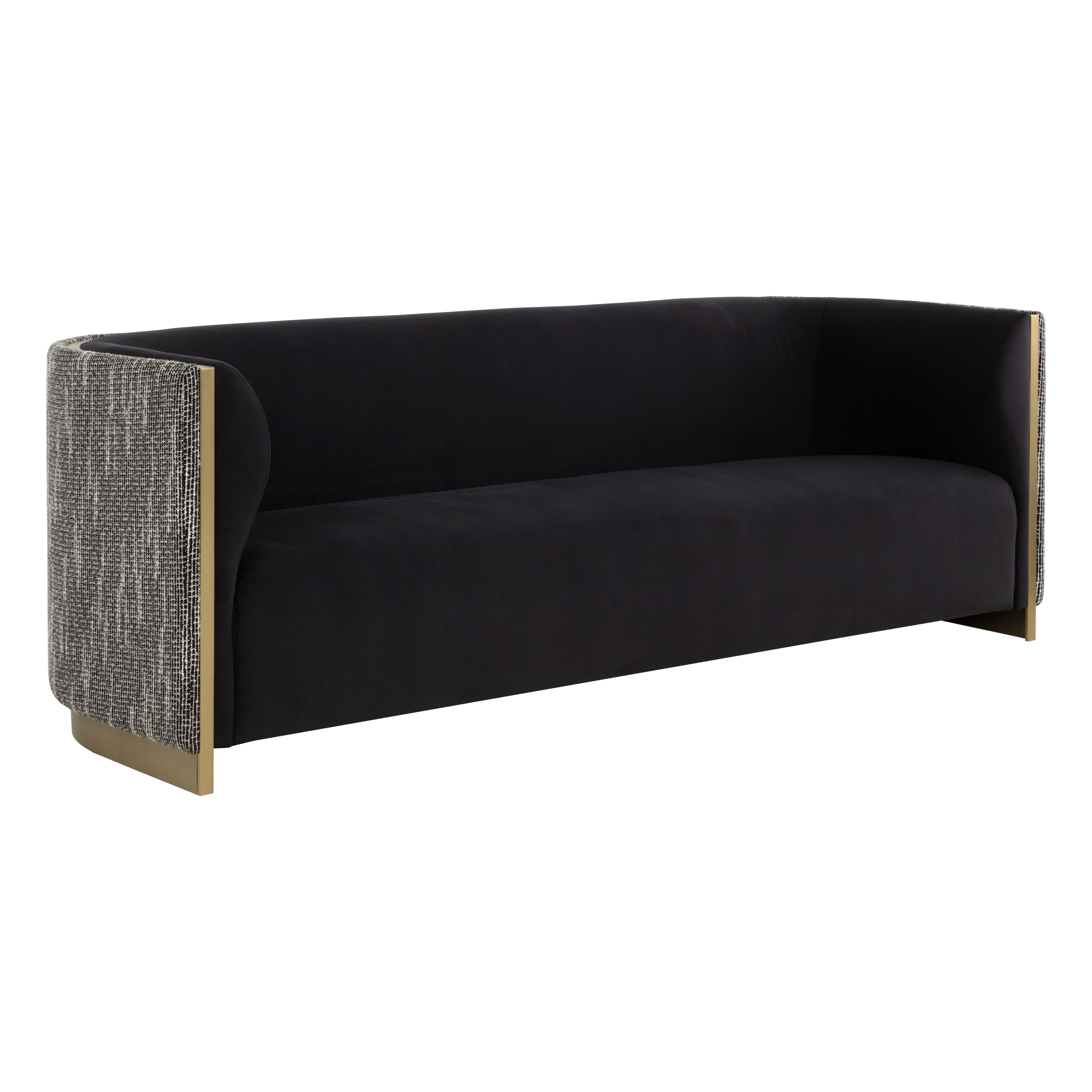 The Larron Sofa balances mixed materials to bring this contemporary design to life. Expertly upholstered in a two-tone combination of abbington black and hobbes night fabrics for a mix of contrasting textures. Gold stainless steel metal inlay and padded curves accentuate the chair's curved silhouette.