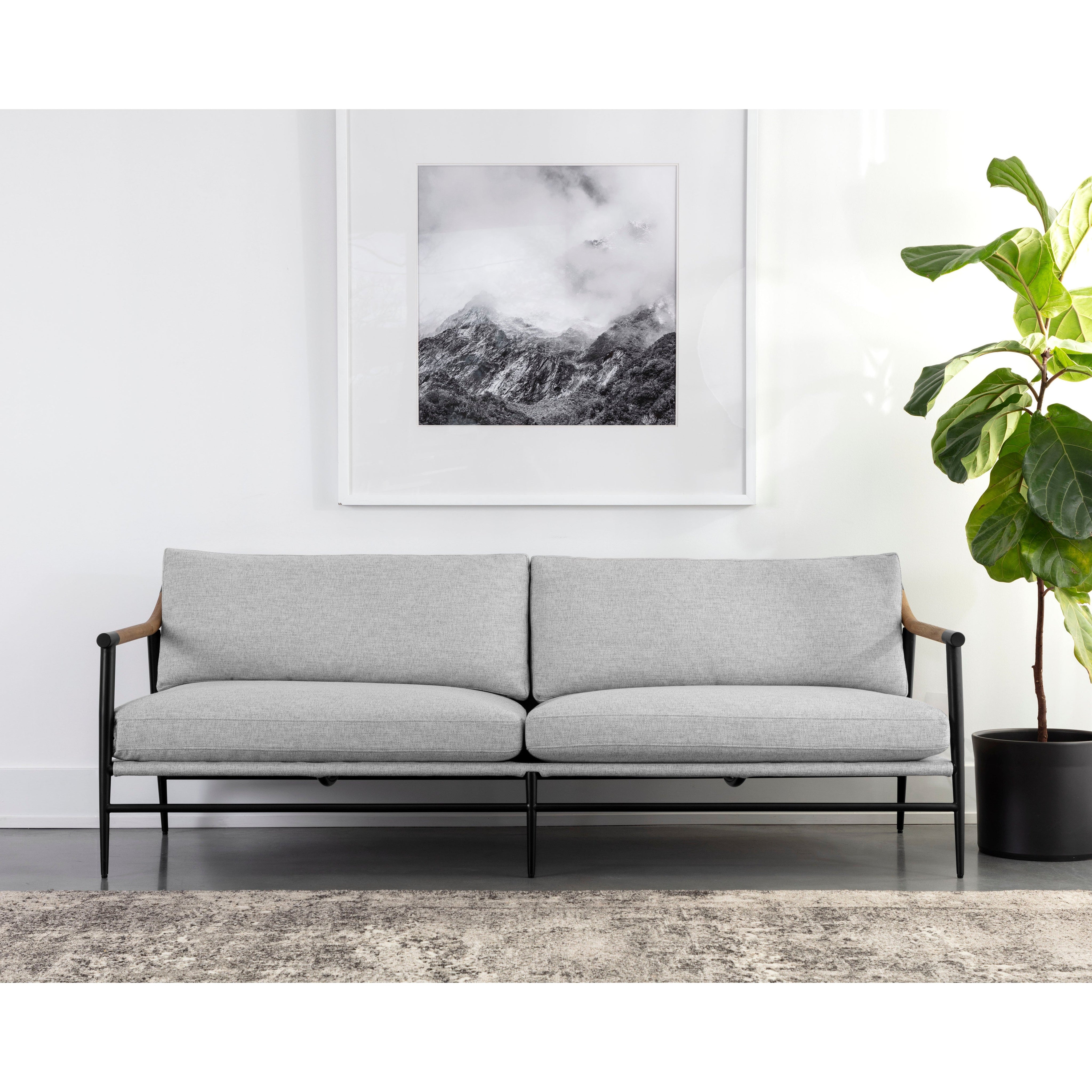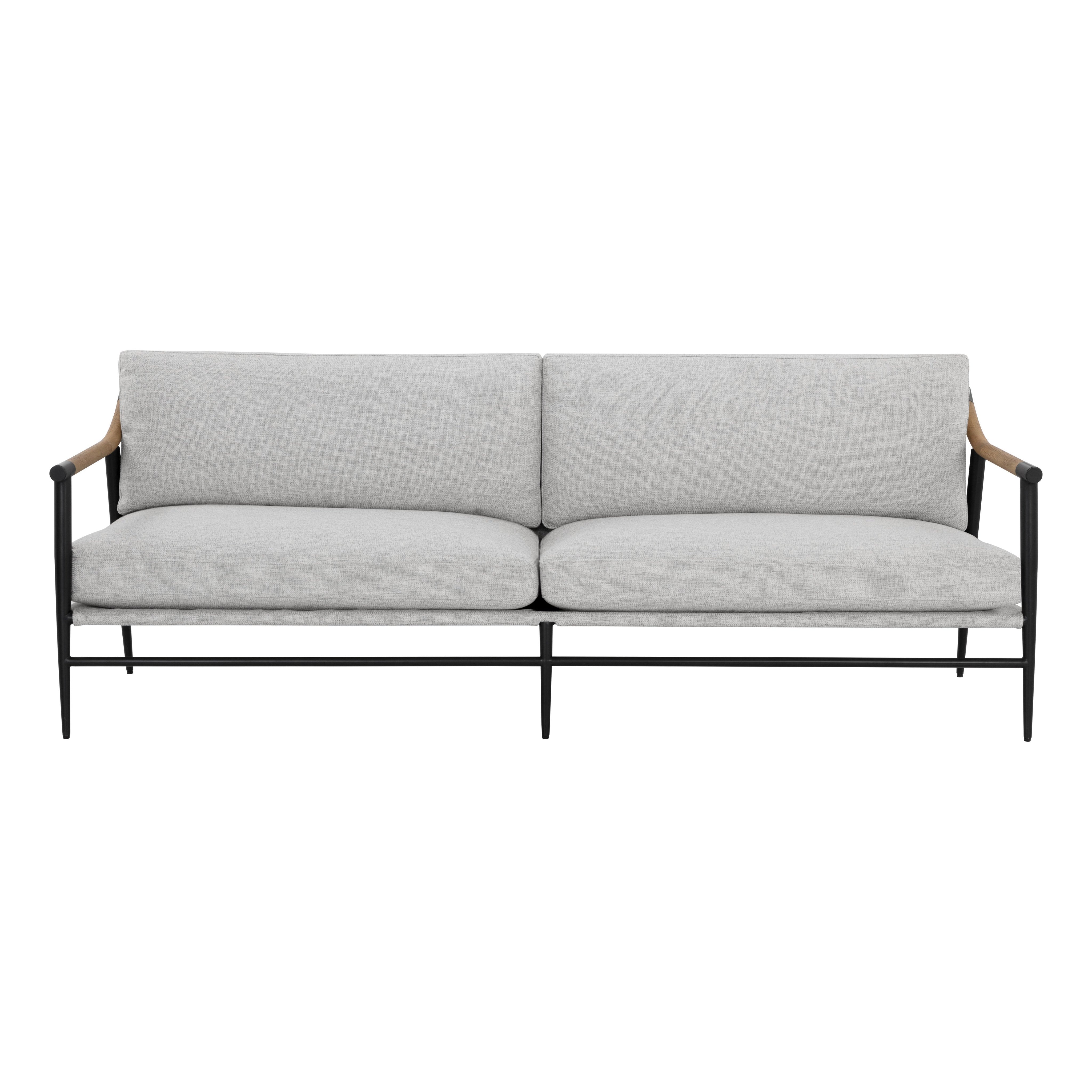 Functional with a timeless design, this mid-century style sofa offers a clean silhouette that will suit any space. Stocked in vault fog fabric with solid oak wood armrests. Completed with a black iron frame. Also available in a counter stool and dining armchair version. Performance fabric is moisture repellent, durable and easy to clean. As wood is an organic, porous material, these pieces will contain natural variations of texture and may also exhibit fine indentations and cracks. Wood pieces will also display a disparity of colour and grain, and visible knots and burls that add to the character of each piece.