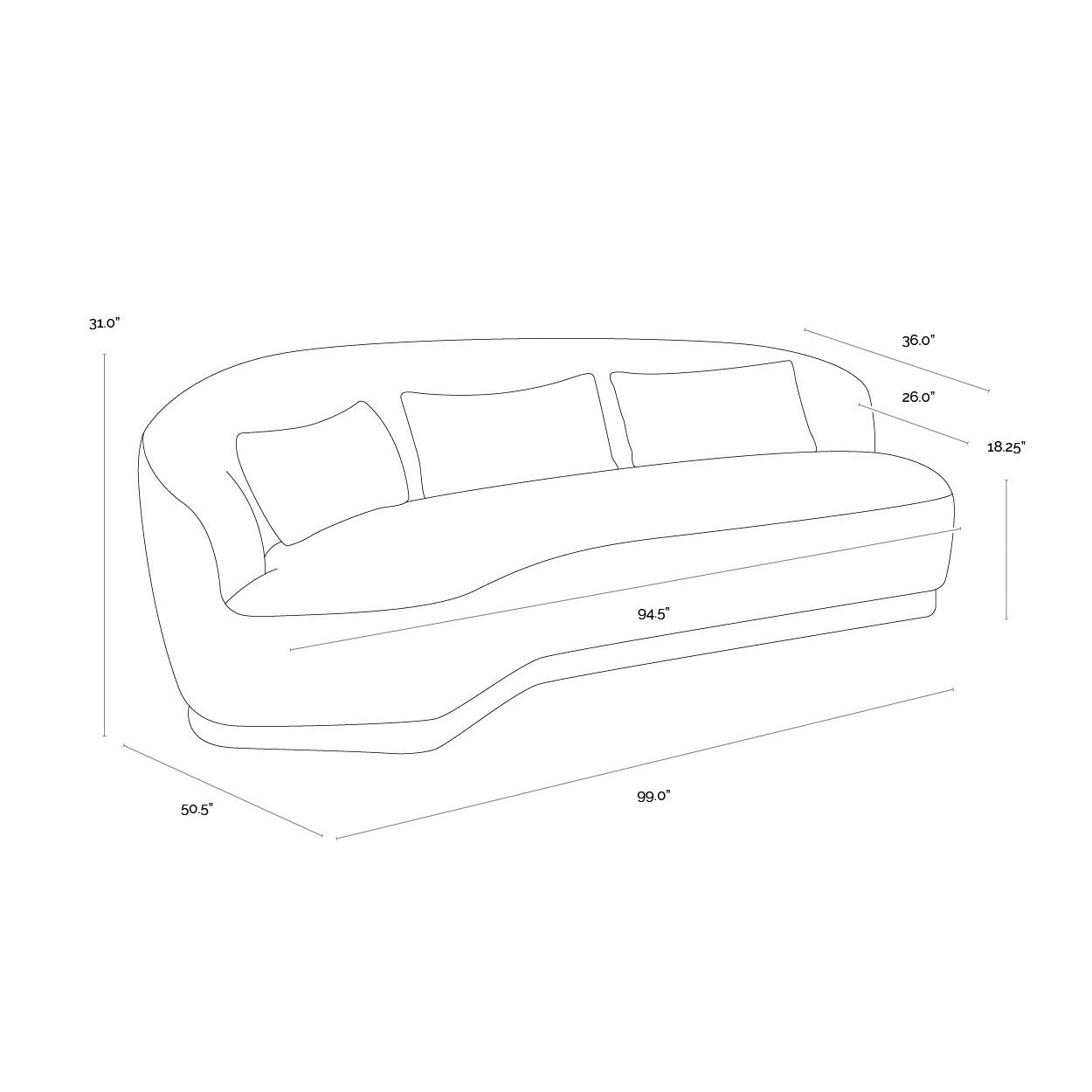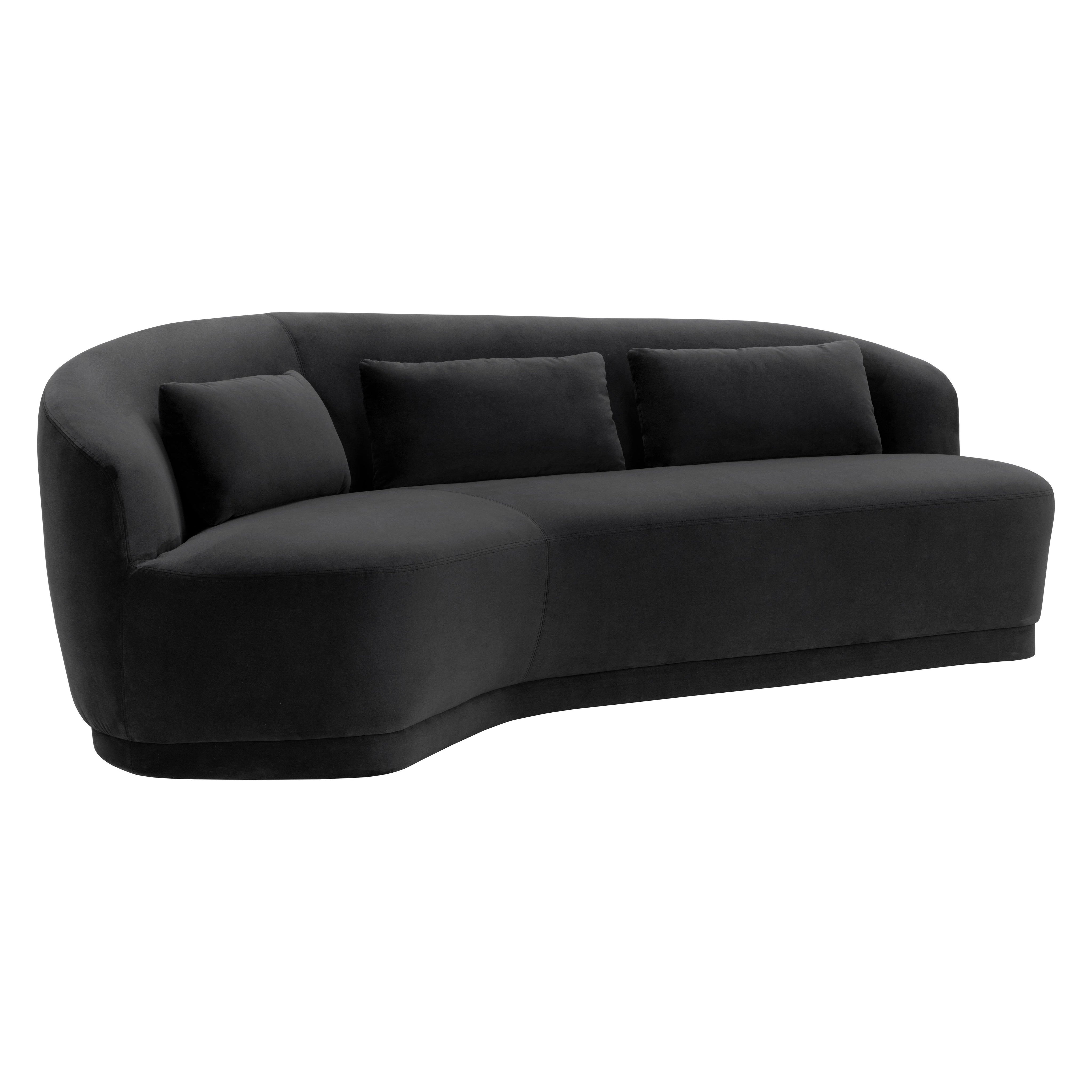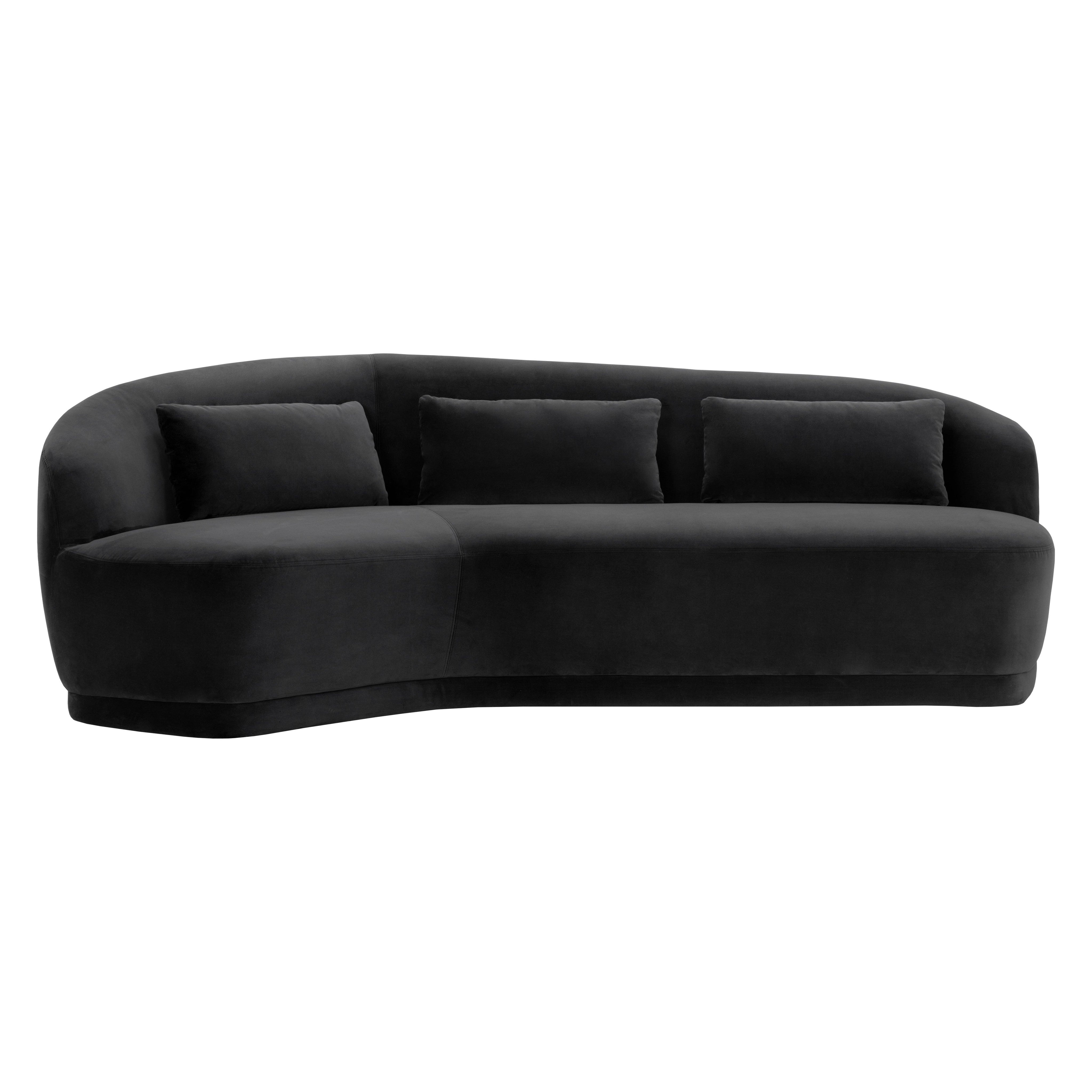 Boasting a design that is all about that curve appeal, this marvelous sofa will add shape to any space. Stocked in shadow grey fabric and completed with a wooden frame. Includes three pillows.