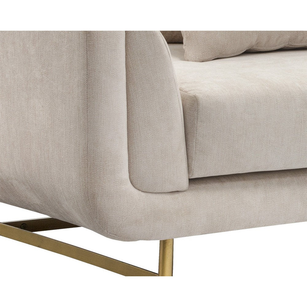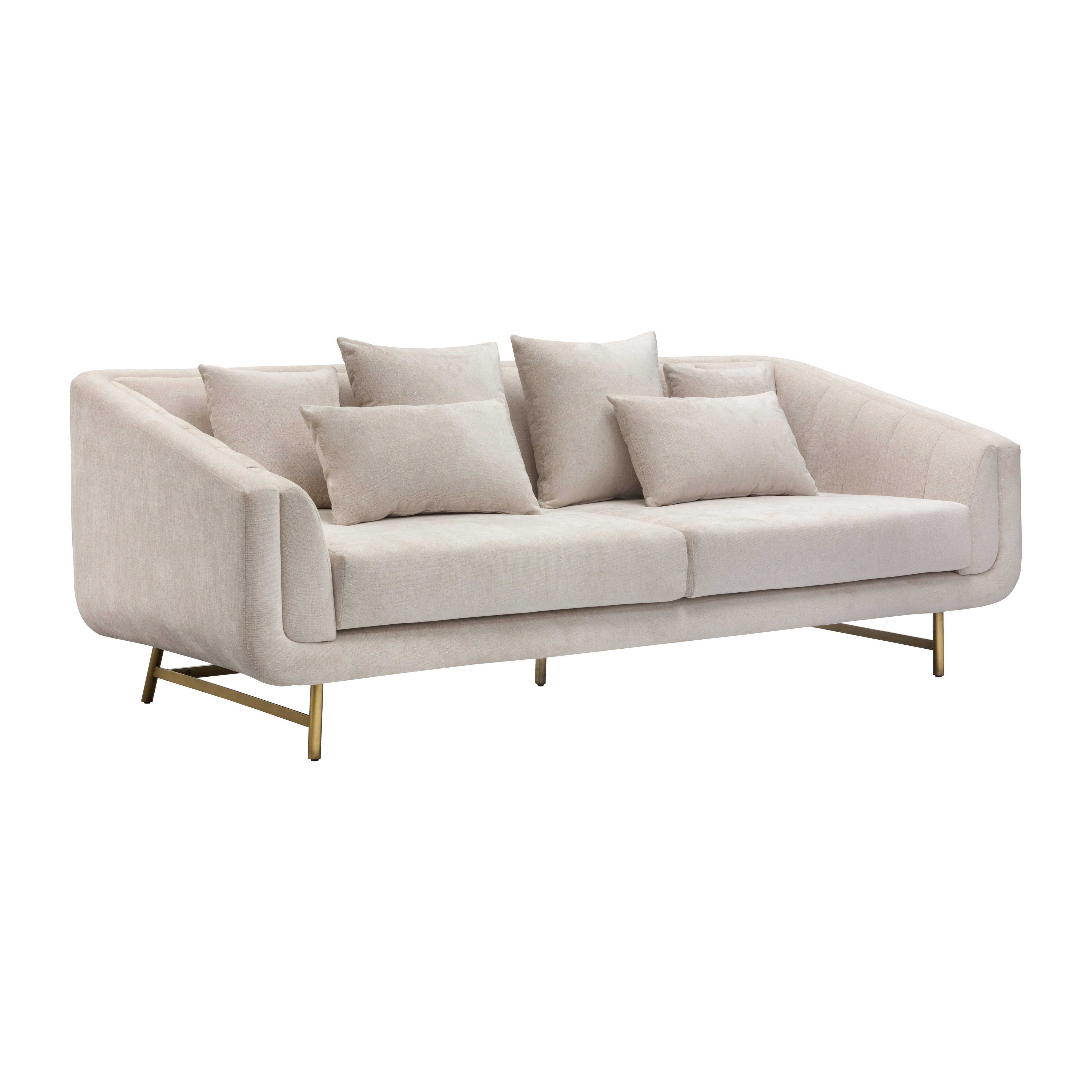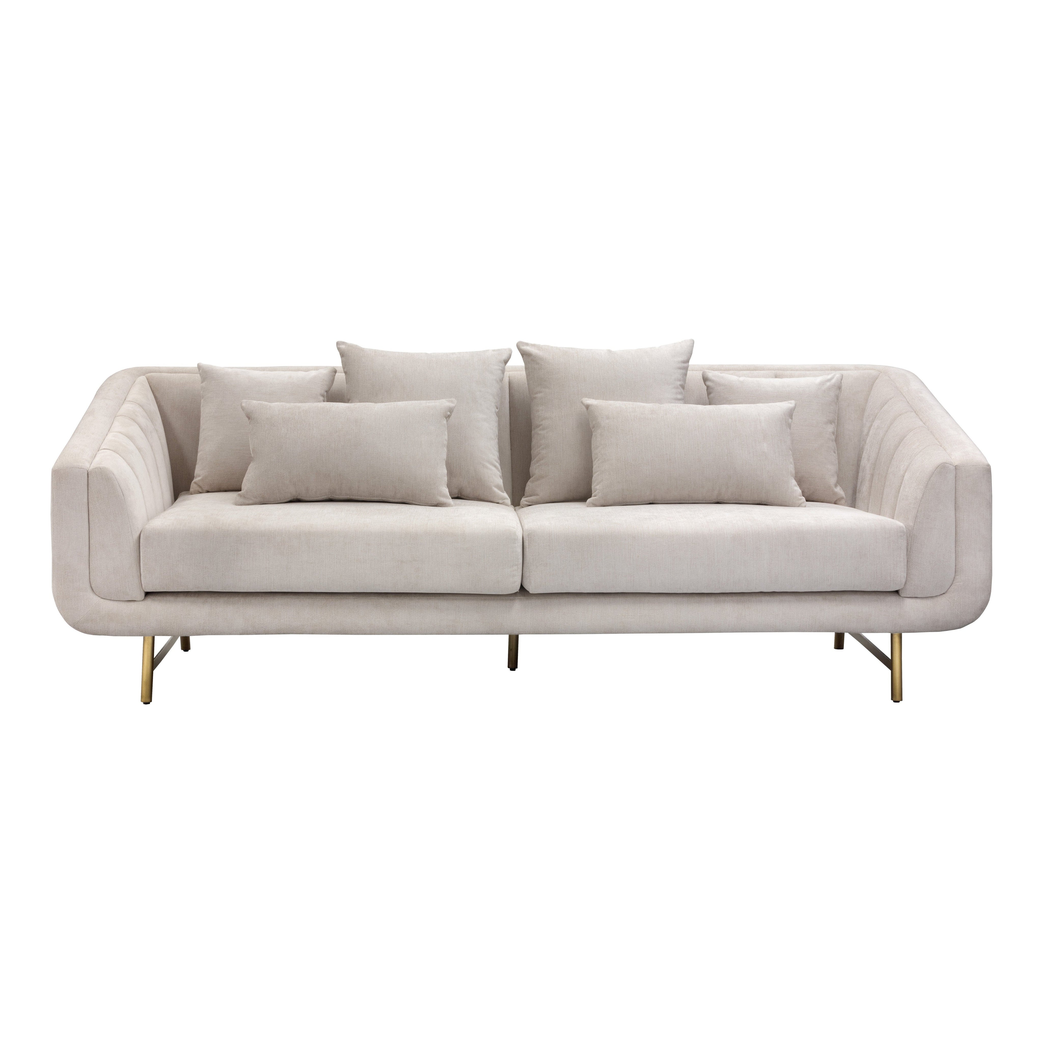 A beautiful sofa that exudes luxurious mid-century modern style. Designed with channel tufting on the seatback in polo club muslin performance fabric and finished with antique brass metal feet. Comes with 6 cushions for added comfort. Performance fabric is moisture repellent, durable and easy to clean.