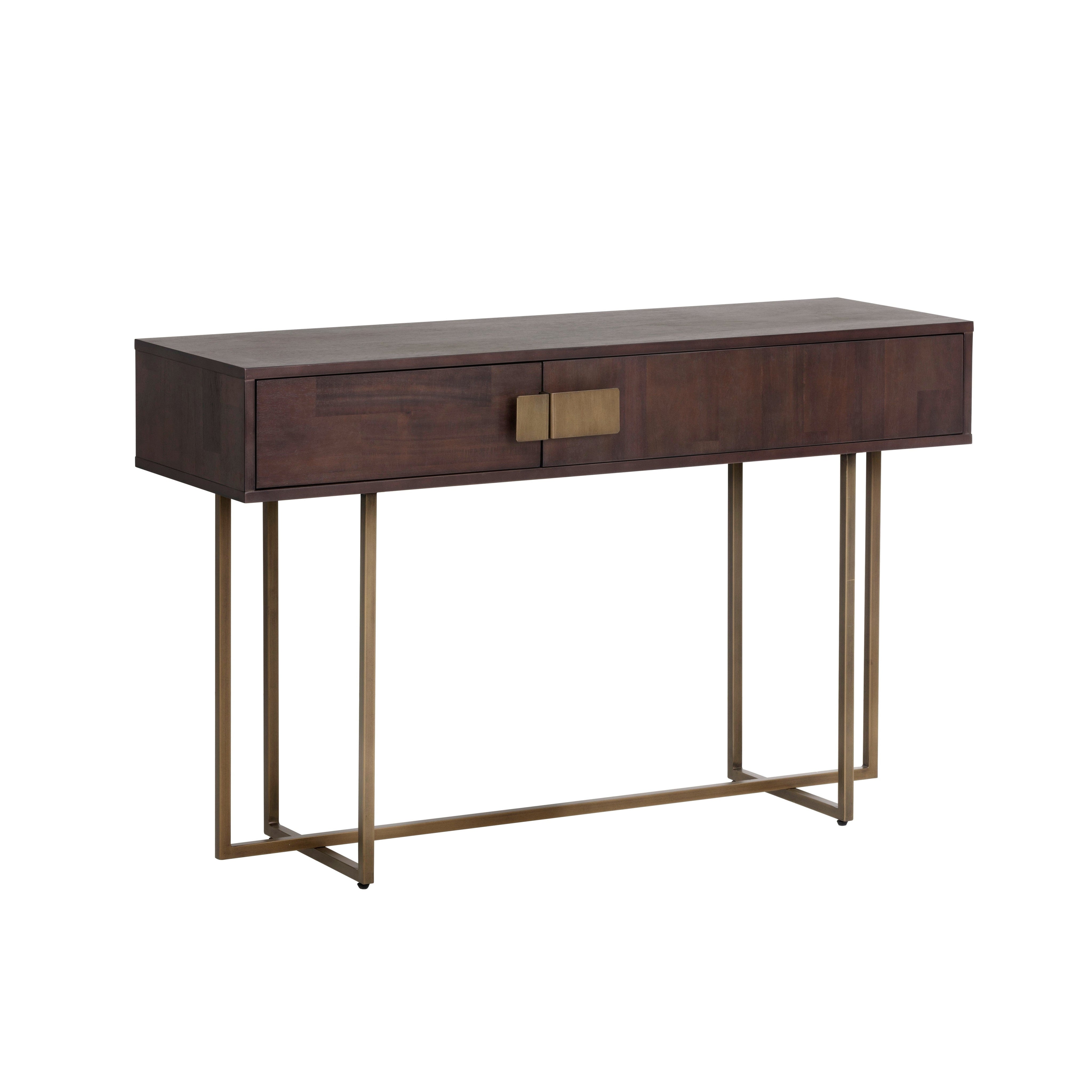 This uniquely crafted console table will add transitional allure to any foyer, living or dining space. Made from acacia wood veneer with two drawers. Alternating wood grain patterns on the drawer fronts and antique brass hardware complete the look. Suitable for residential and contract settings.