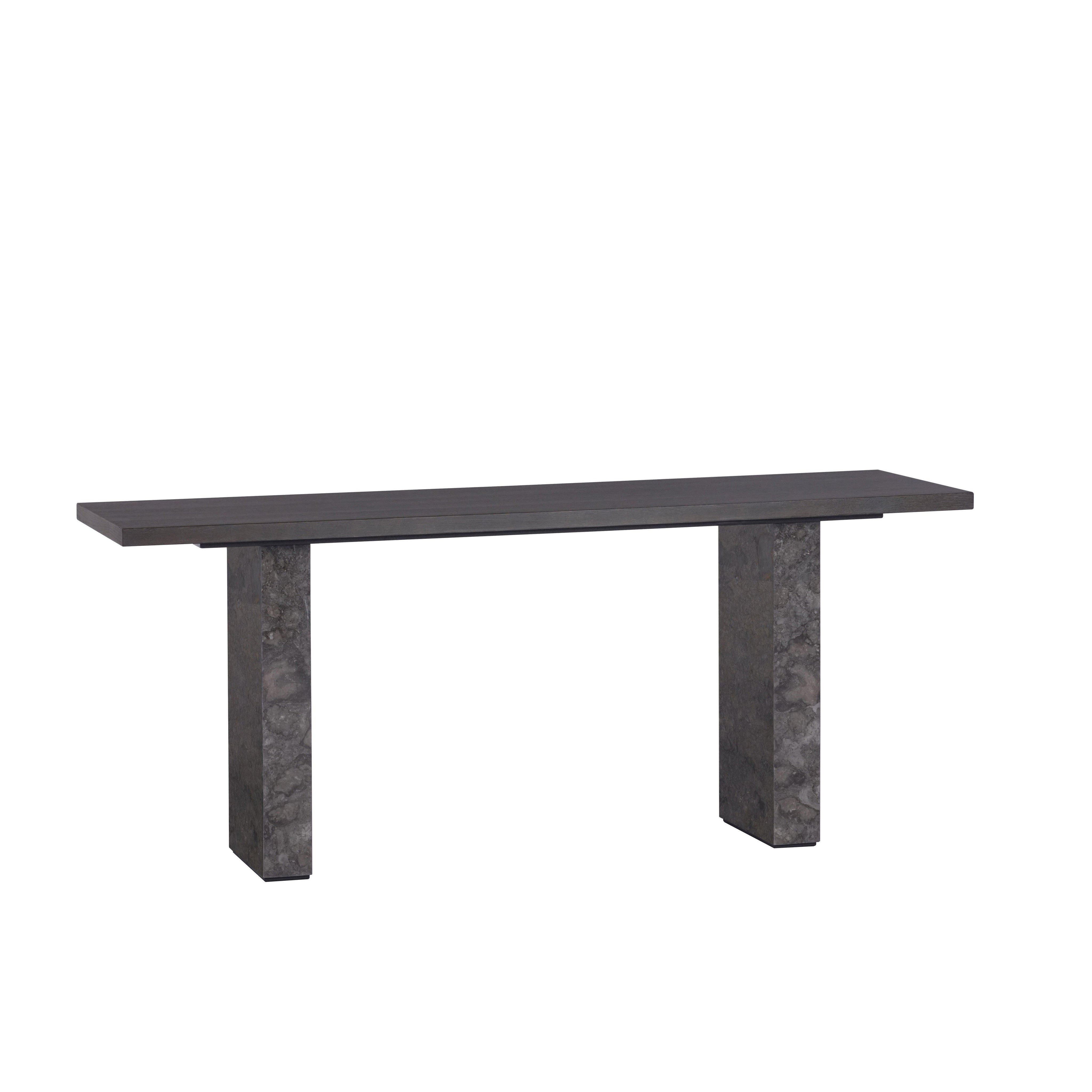 A modern console table designed to add a minimalist touch to living and lounge spaces. Crafted with a charcoal grey oak wood veneer top and a grey marble veneer base. As marble is a natural material, unique veining, pitting, fissures, micro-cracks and colour variations are all characteristics that add to the uniqueness and beauty of each piece. As wood is an organic, porous material, these pieces will contain natural variation of texture and may also exhibit fine indentations and cracks. Wood pieces will also display a disparity of colour and grain, and visible knots and burls that add to the character of each piece.