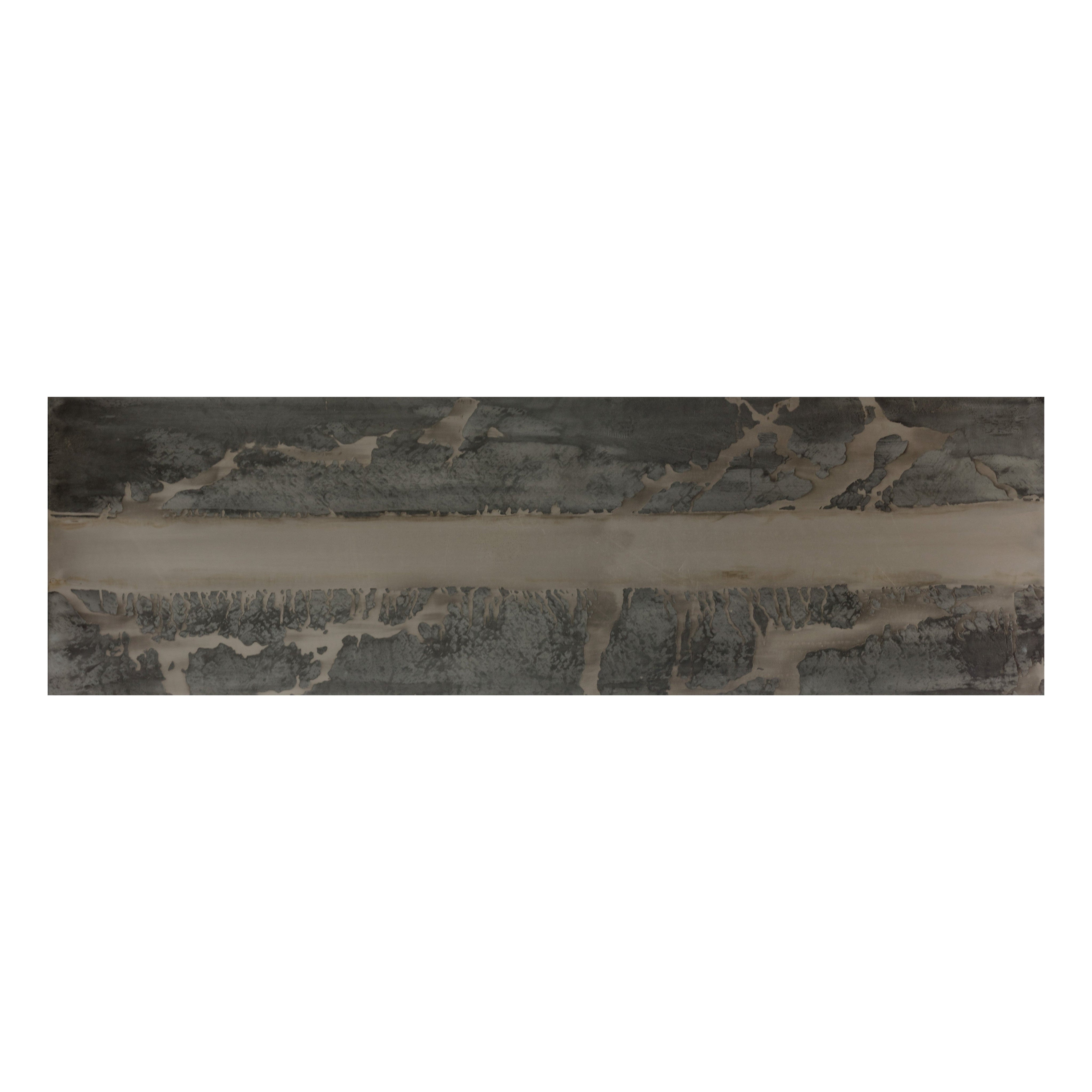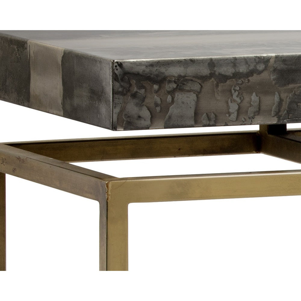 A traditional design comes to life with elements inspired by global travels. This console table is crafted with an iron top featuring a supernatural patina finish with an antique brass base. Made in India. With refined craftsmanship, this design was brought to life by skilled local artisans. By nature, these materials develop unique imperfections such as markings and colour variations for a truly one-of-a-kind piece.