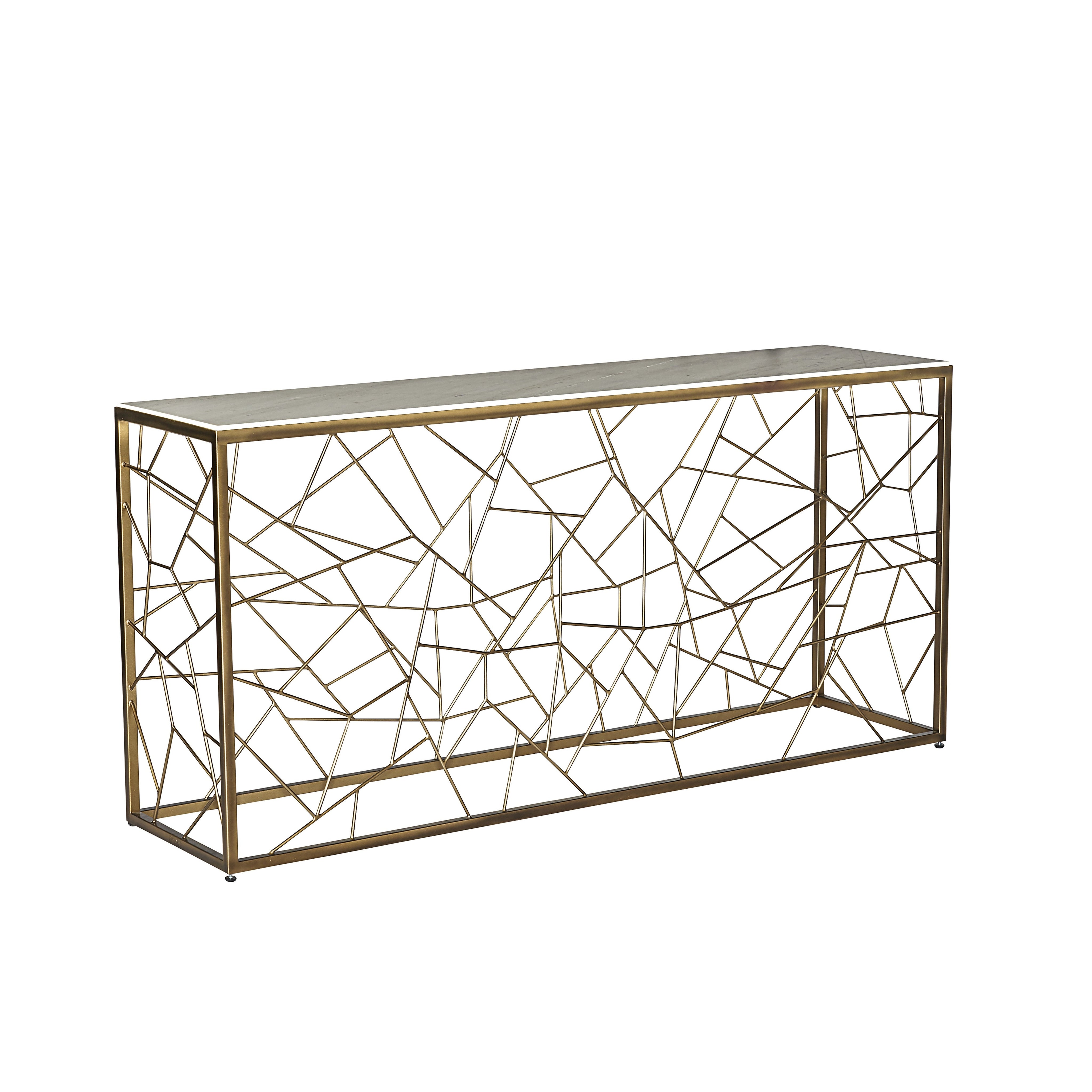 This large and dramatic console table is sure to be the center of attention in any room. A white Volakas marble top is beautifully paired with a powder-coated rustic bronze steel frame in an intriguing webbed pattern. Suitable for lounge and living spaces in residential and commercial environments. As marble is a natural material, unique veining, pitting, fissures, micro-cracks and colour variations are all characteristics that add to the uniqueness and beauty of each piece.