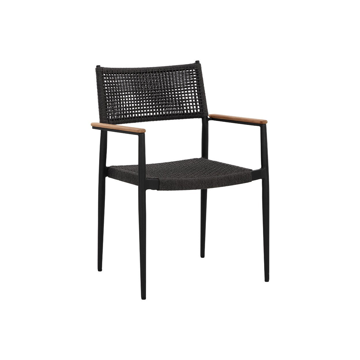 The Nava Stackable Dining Armchair boasts a light and airy design that will resonate in any space. Features solid teak wood detailing on the armrests paired with a black powder-coated aluminum frame. Completed with a dark greymix rope weave on the seat and backrest. Suitable for indoor and covered outdoor spaces.