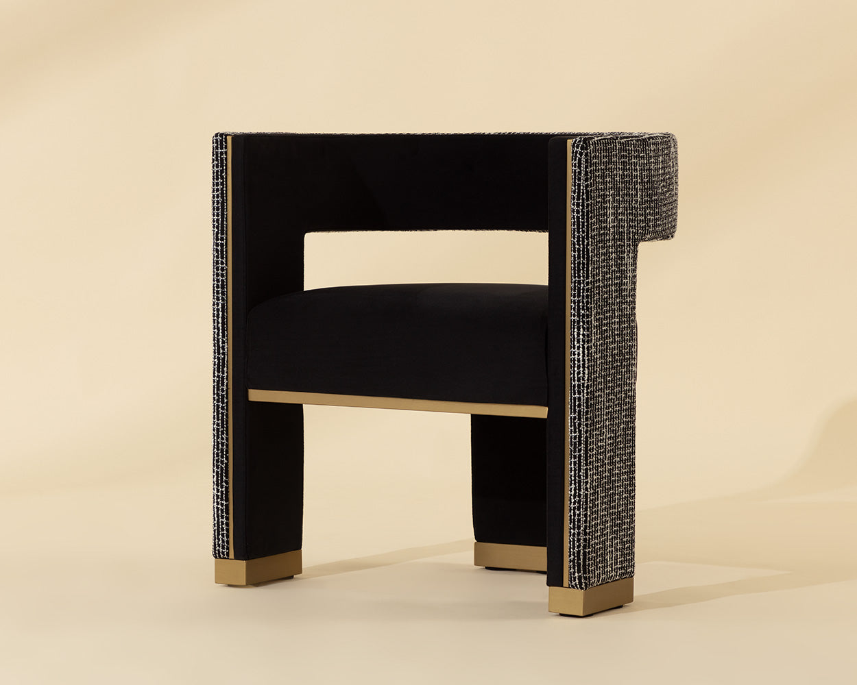 Perfectly poised with a distinct three-legged design, the Adamina Dining Armchair will leave a lasting impression. Powder-coated gold metal detailing enhances the varying textures of fabrics for a stylish seating solution.