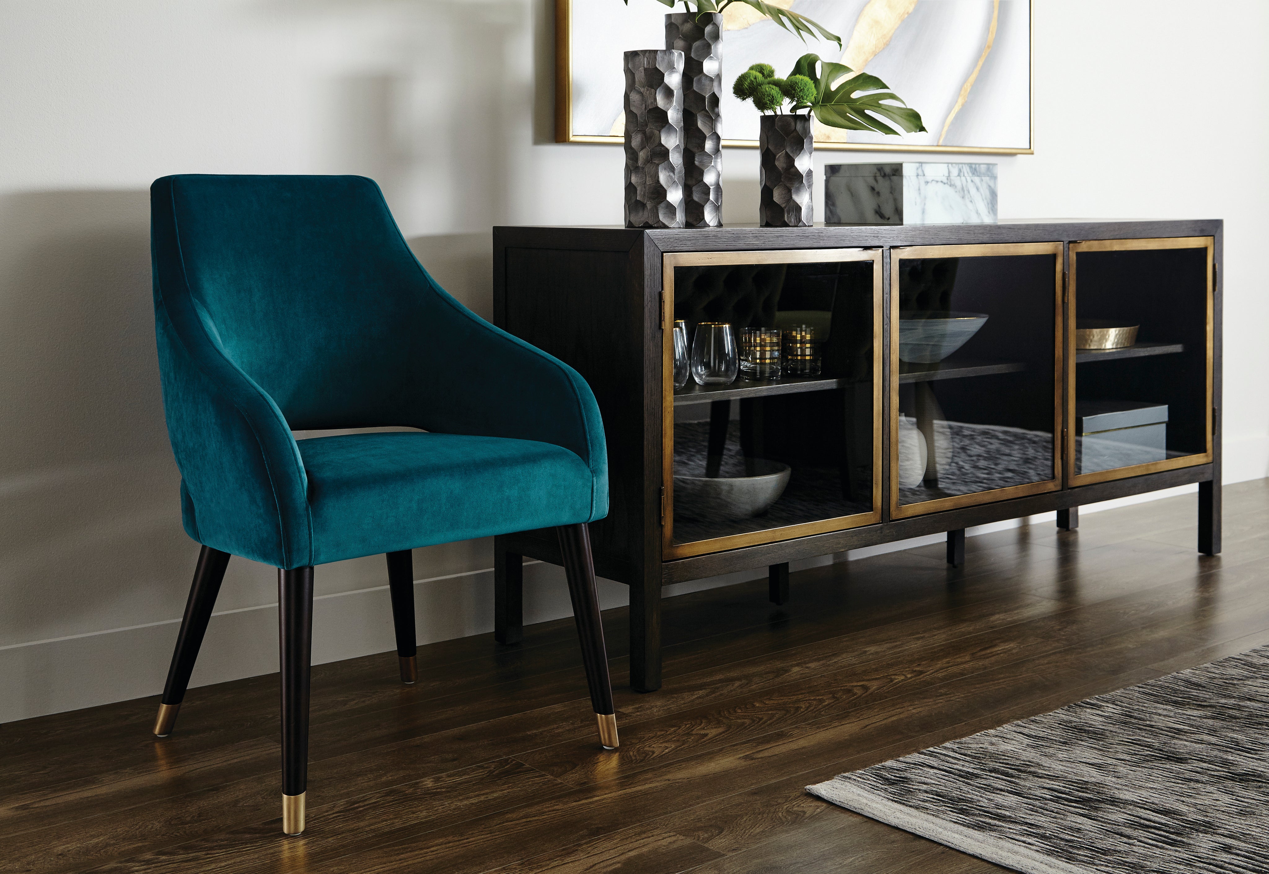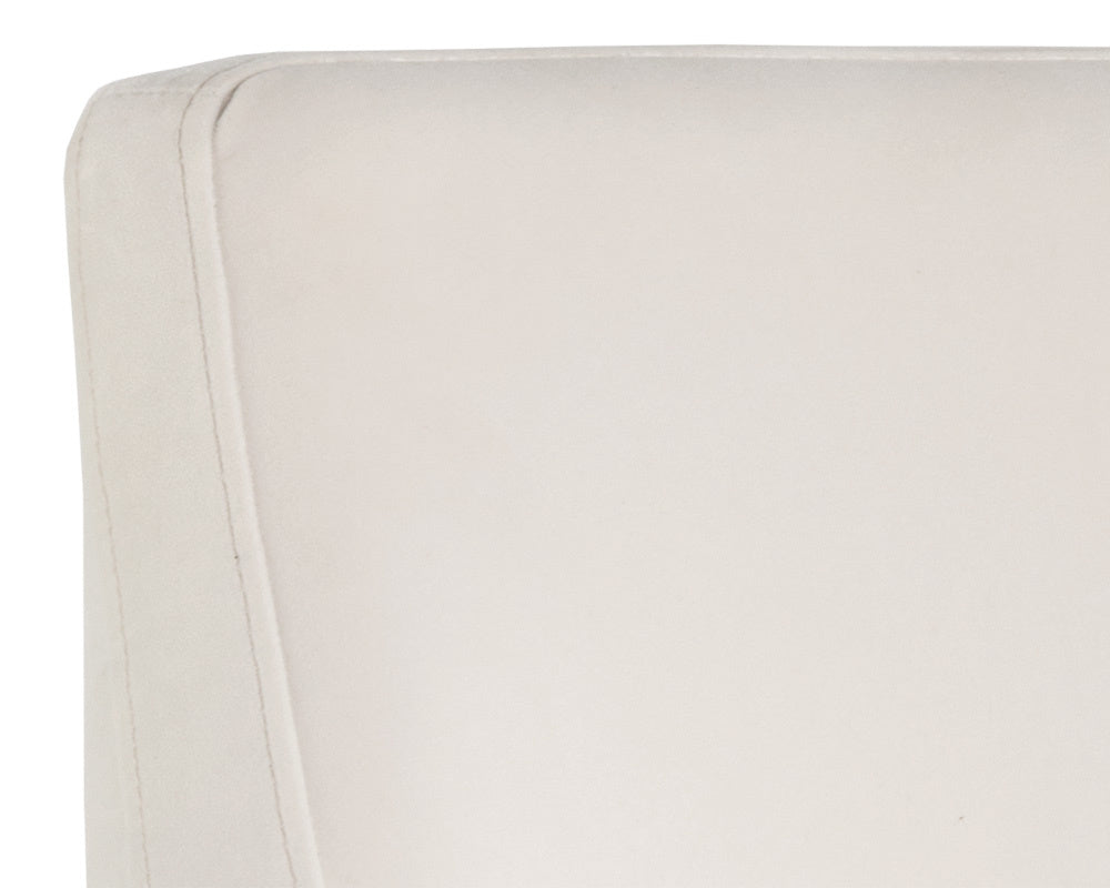 A beautiful and comfortable dining armchair featuring a narrow cutout in the seatback and sloping track arms. Finished with poplar wood legs and antique brass caps.