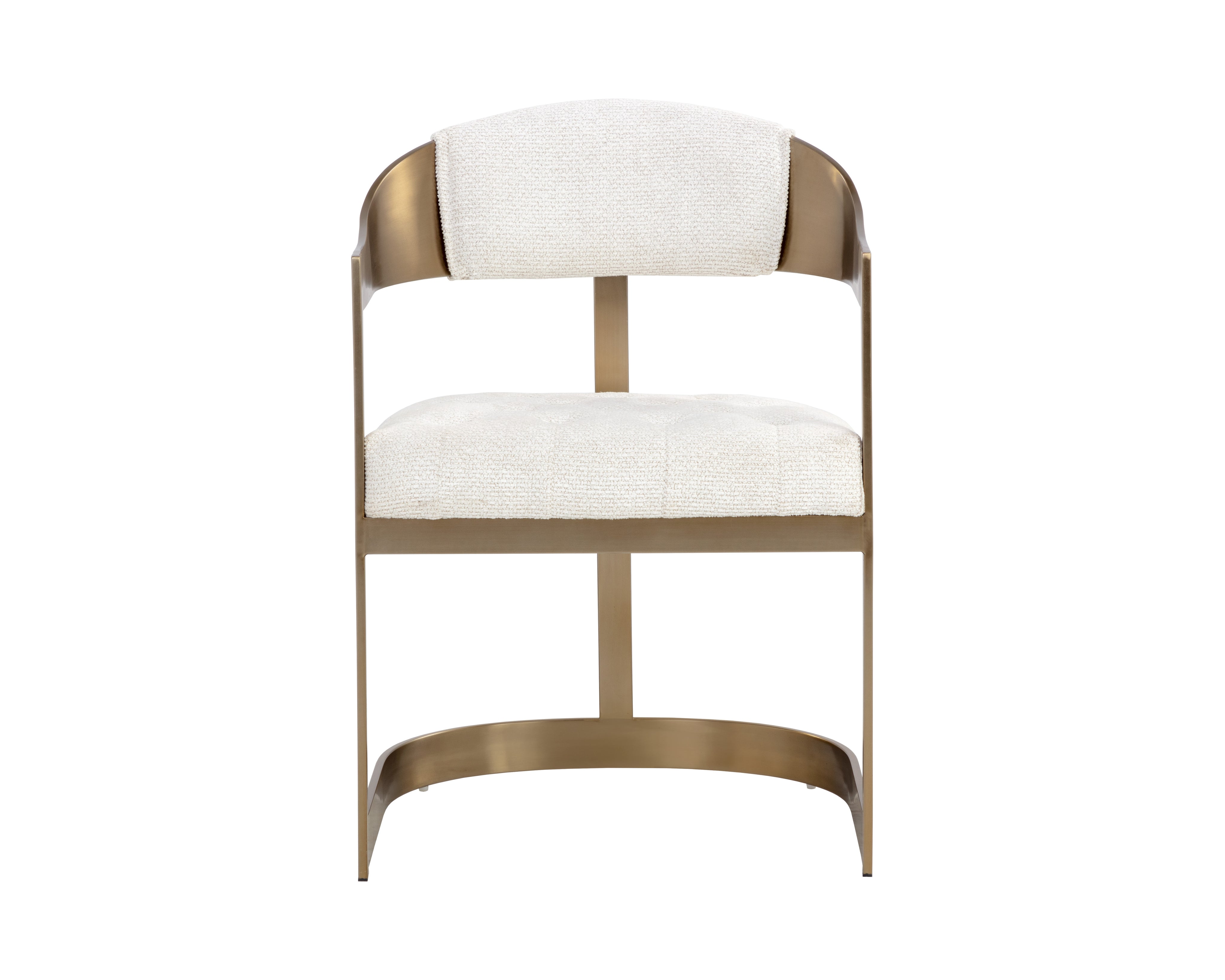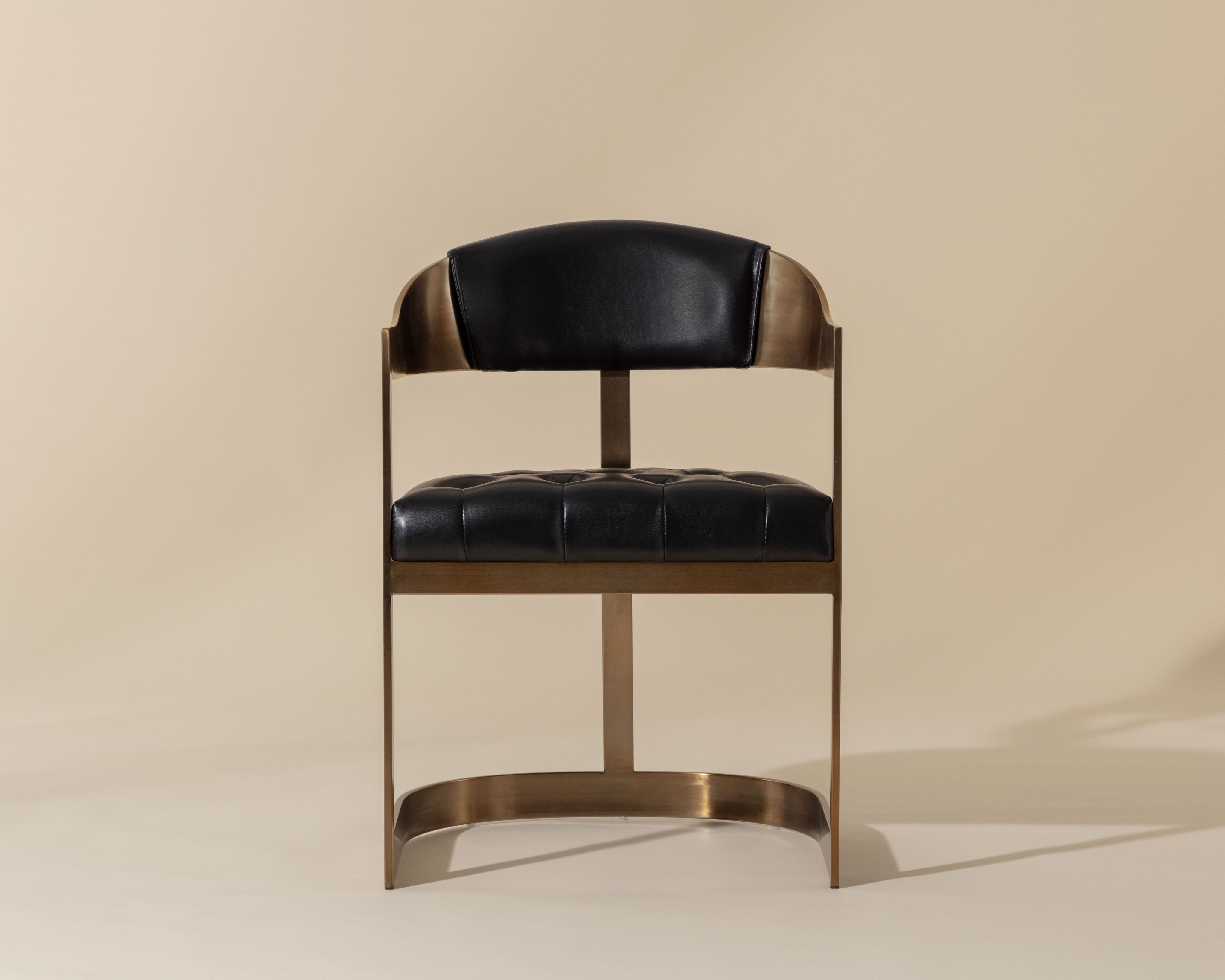 This ultra contemporary dining chair features a T-shaped back, tapered arms and an antique brass crown base. Stocked in cantina black bonded leather. Perfectly suited for various dining, kitchen and bar spaces of all sizes in either commercial or residential settings. Handle with Care: This design has been crafted with bonded leather. Bonded leather is a blend of reconstituted leather and synthetic materials crafted to reflect the natural characteristics of leather; as such, colour variations, markings, wrinkles, grooves and light scratches are acceptable and appreciated characteristics. No two pieces are alike. Visit our Product Care page for more information on how to ensure the lasting beauty of this piece.