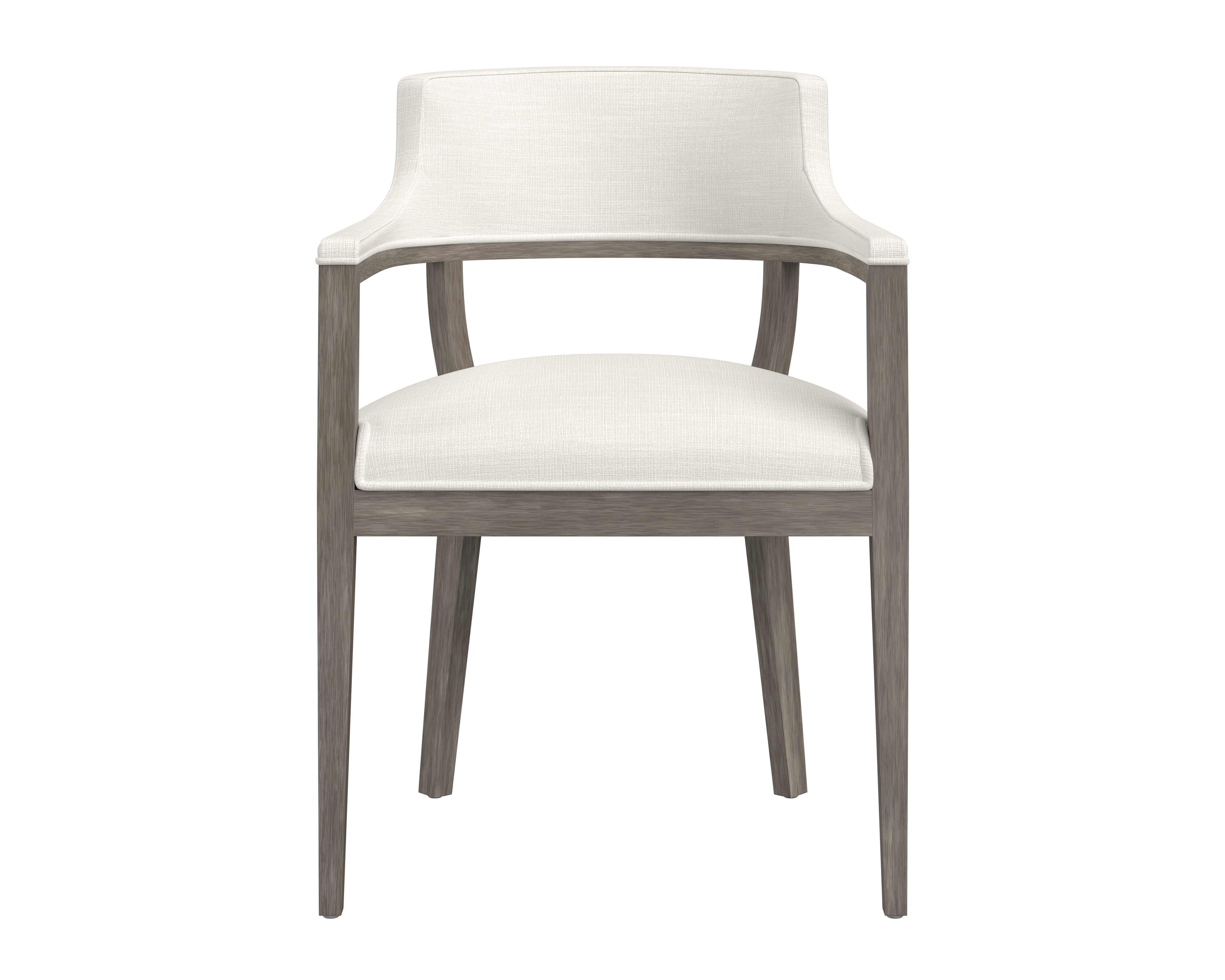 A mid-century modern dining armchair chair with an open back design. Stocked in linoso ivory performance fabric with an exposed ash grey solid oak wood frame. Performance fabric is moisture repellent, durable and easy to clean. As wood is an organic, porous material, these pieces will contain natural variation of texture and may also exhibit fine indentations and cracks. Wood pieces will also display a disparity of colour and grain, and visible knots and burls that add to the character of each piece.