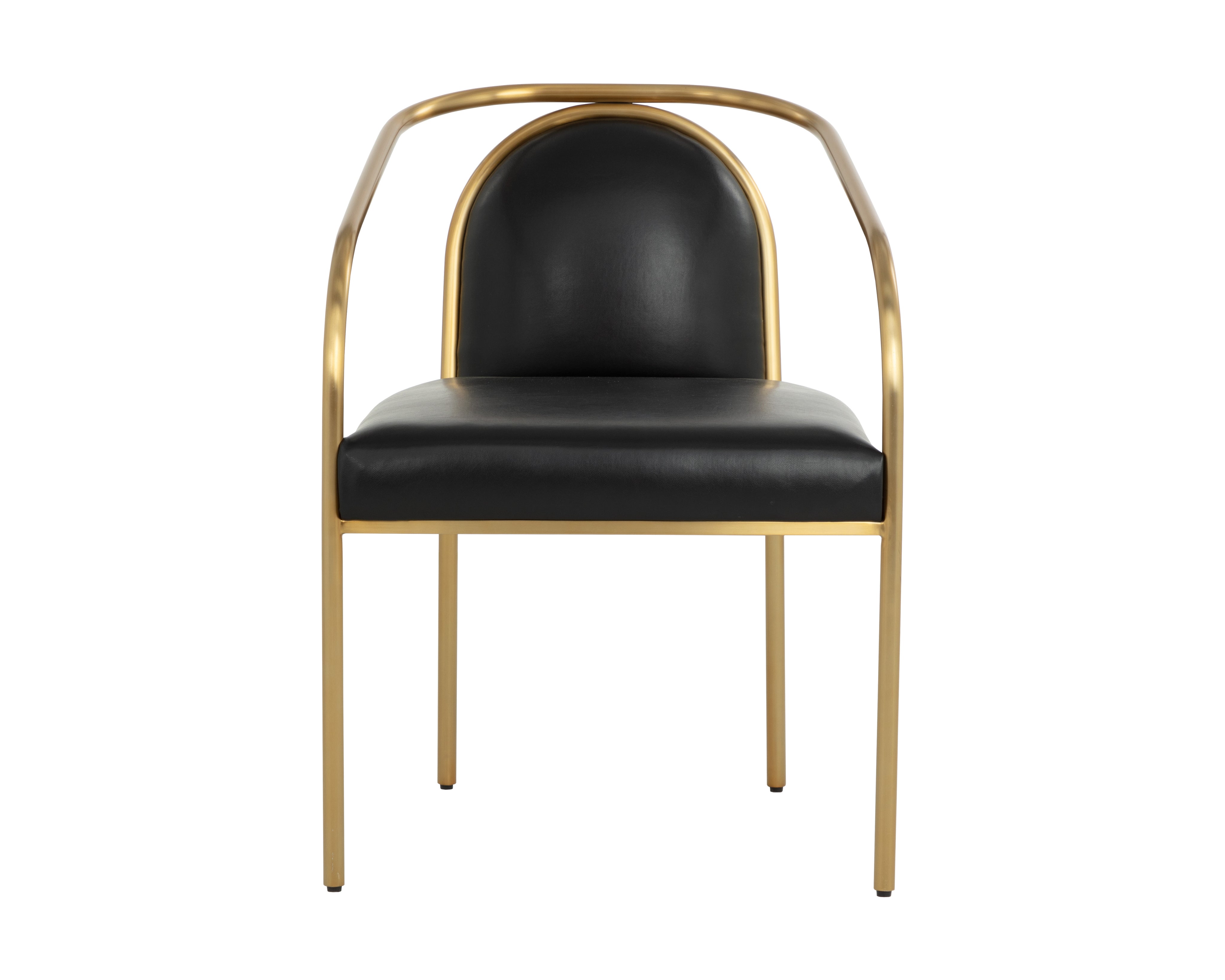 The Cicero Dining Armchair is a lesson in understated elegance. Sleek gold stainless steel paired with the rich black tones of catina black bonded leather creates a captivating look to elevate any dining space.
