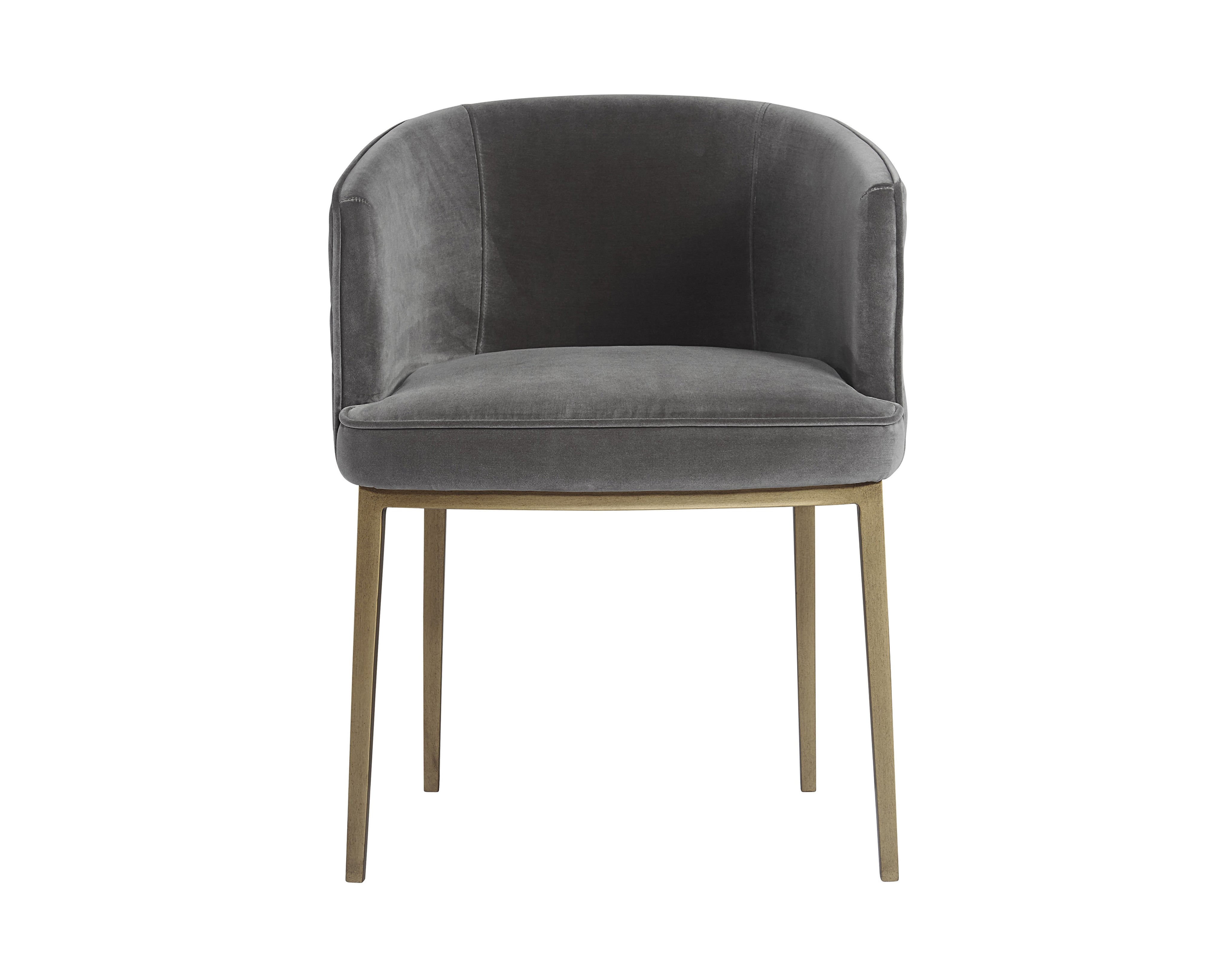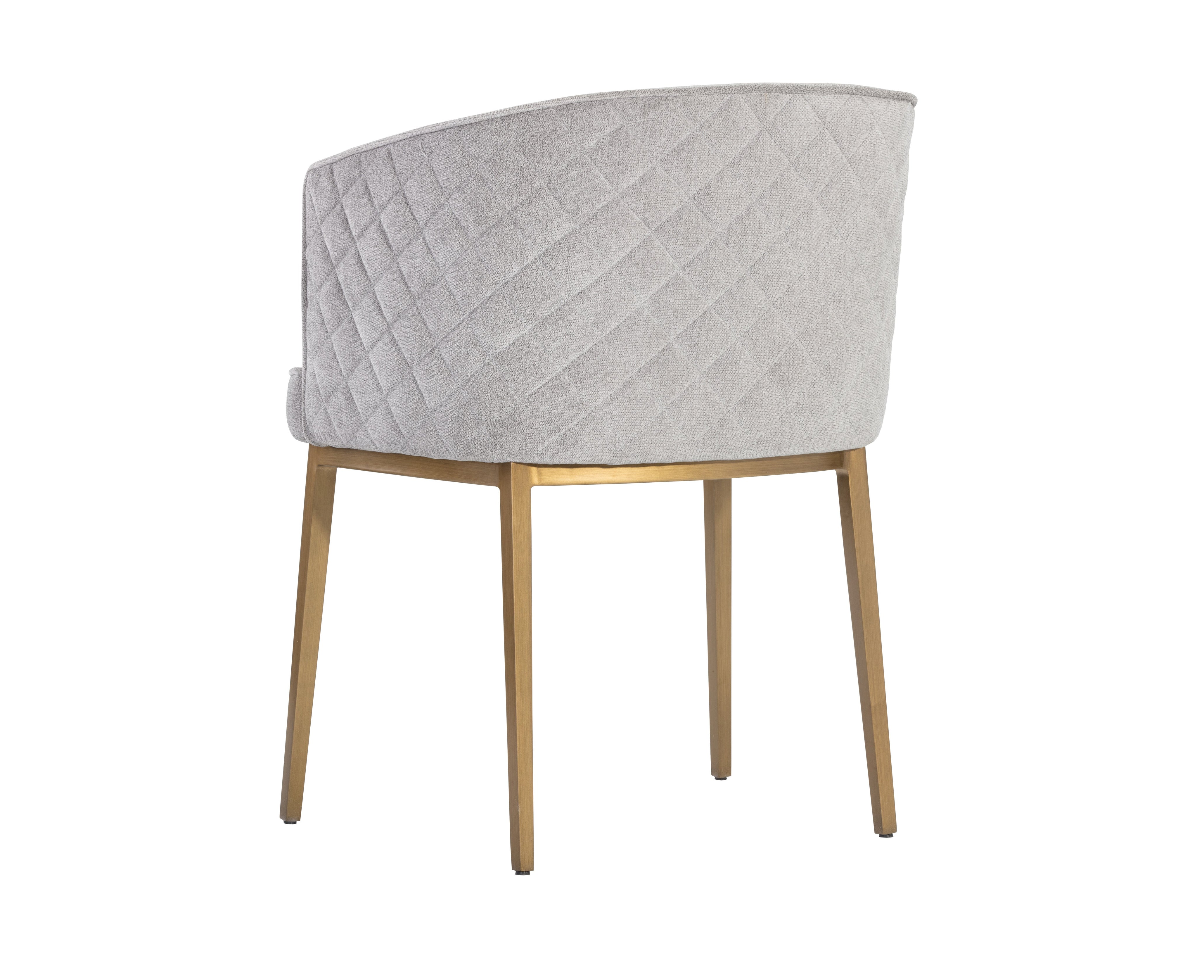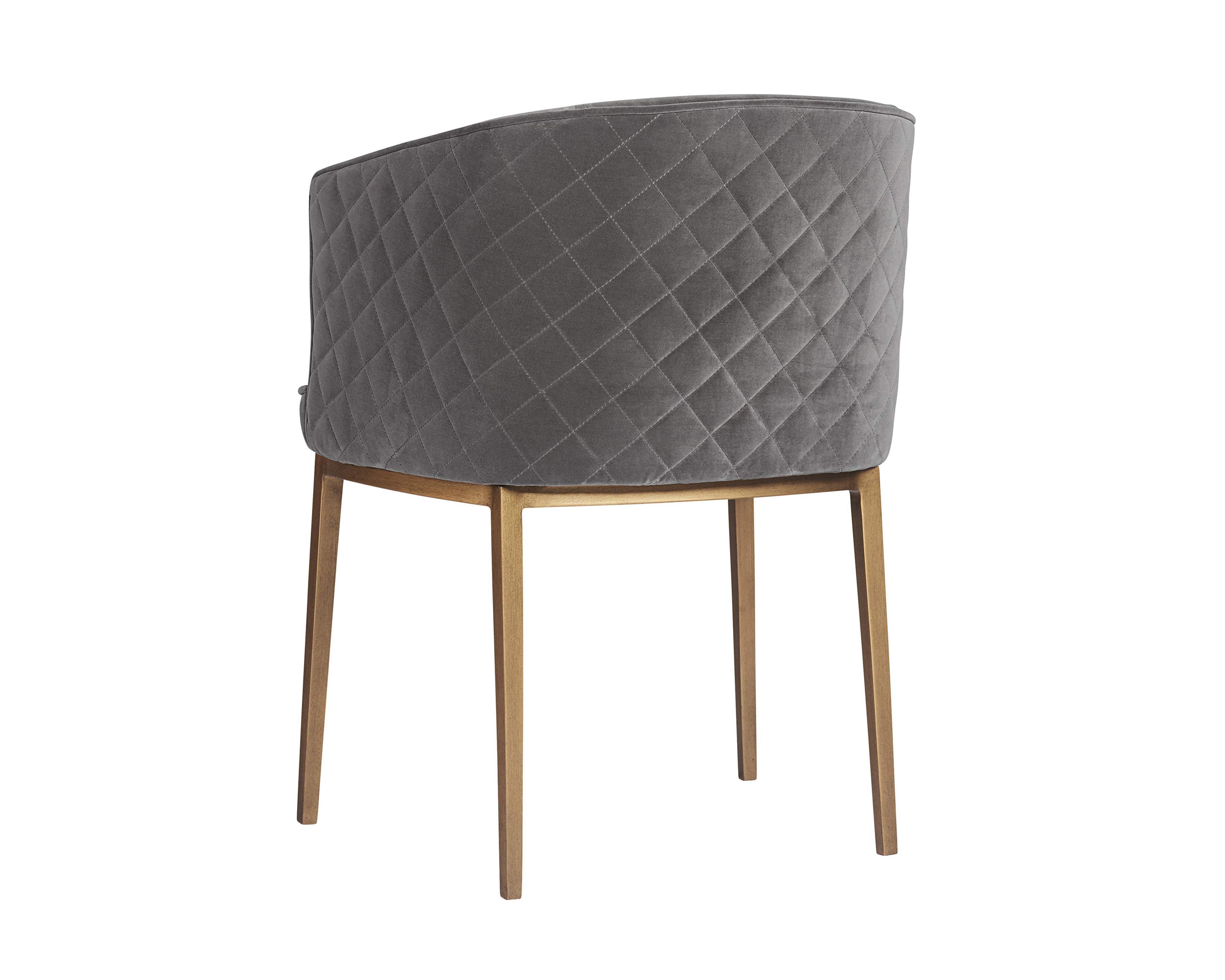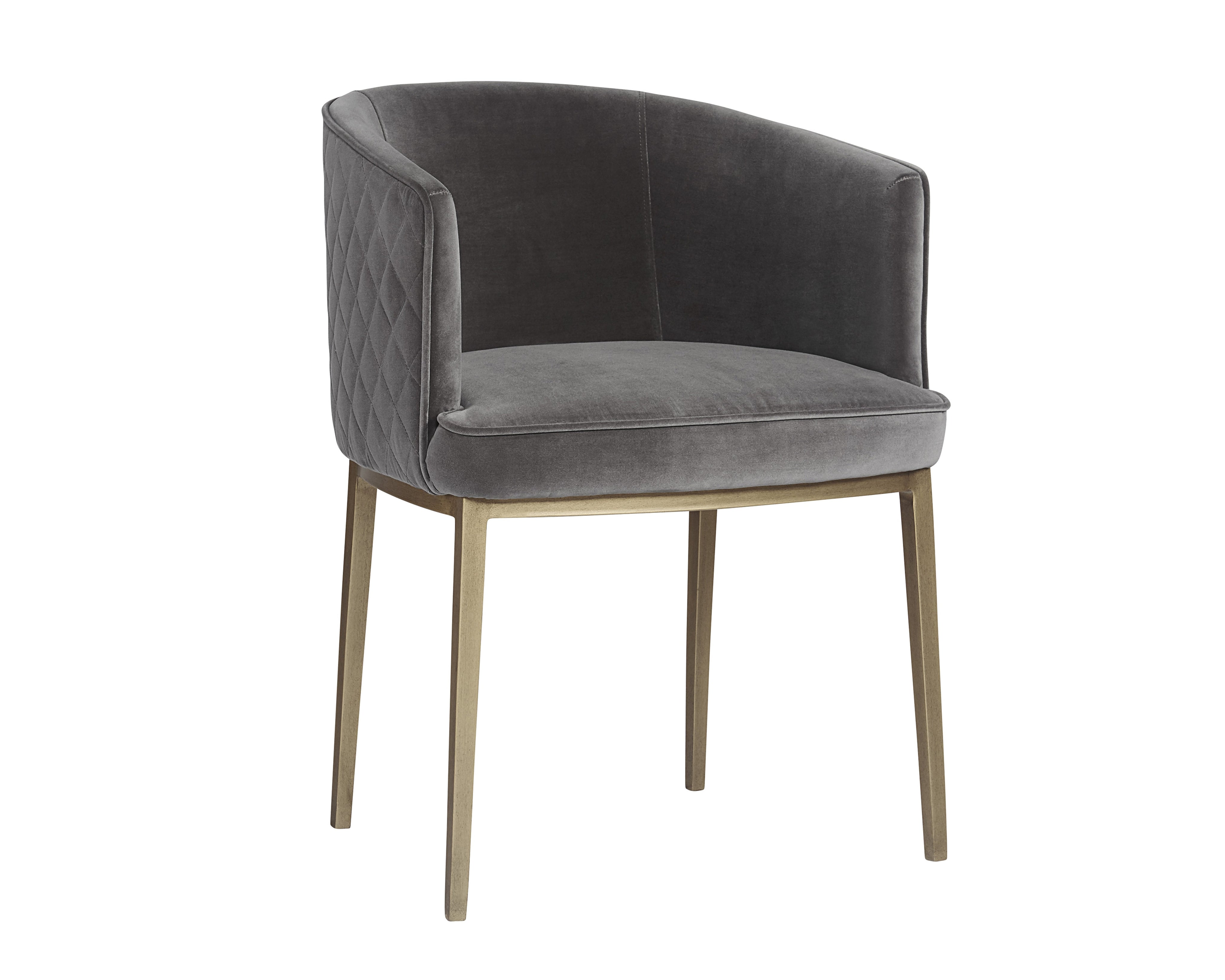 Feminine flair comes to life in this modern dining chair. Stocked in our blush grey fabric with elegant diamond stitching on the exterior seatback. An antique brass steel frame completes the look.