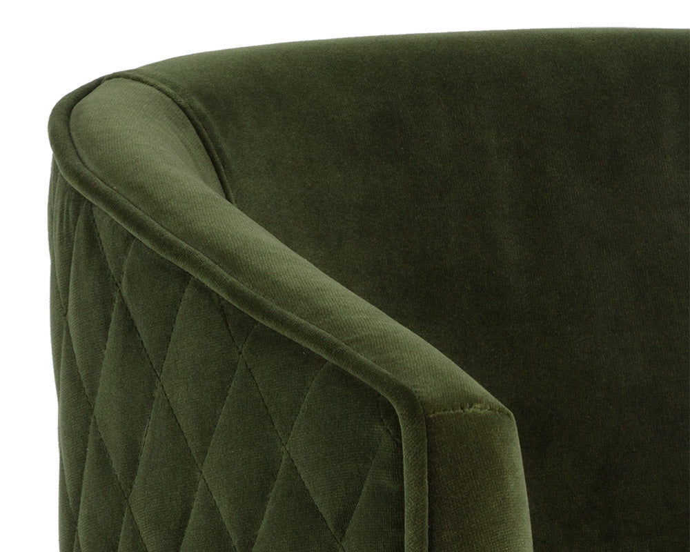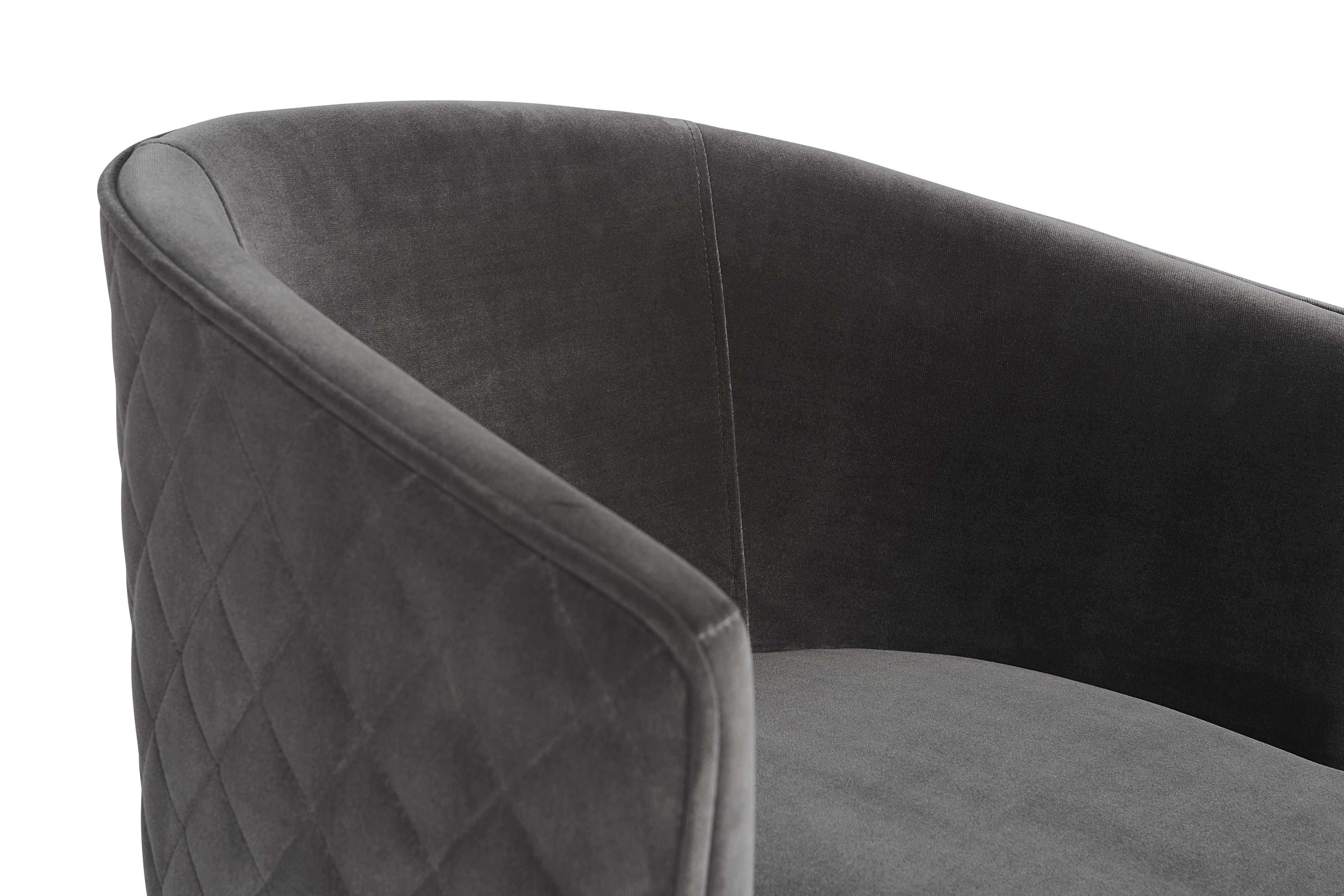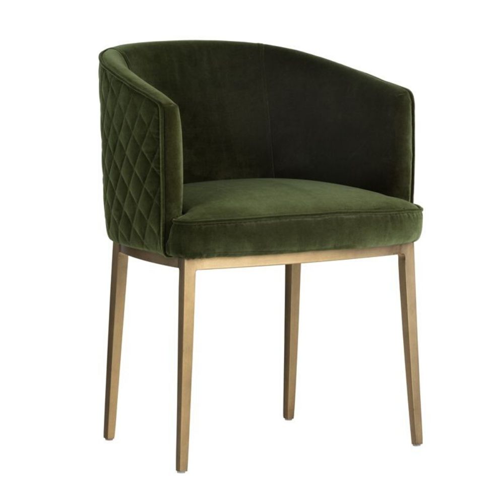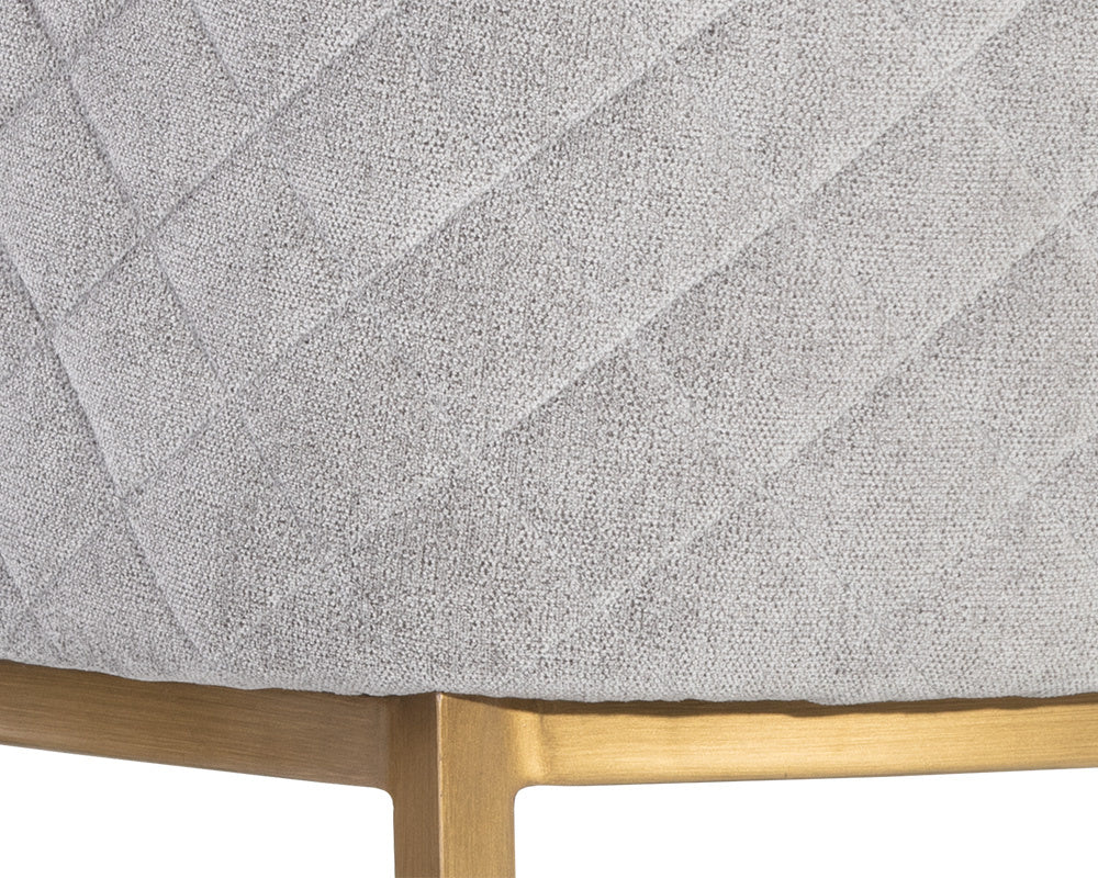 Feminine flair comes to life in this modern dining chair. Stocked in our blush grey fabric with elegant diamond stitching on the exterior seatback. An antique brass steel frame completes the look.