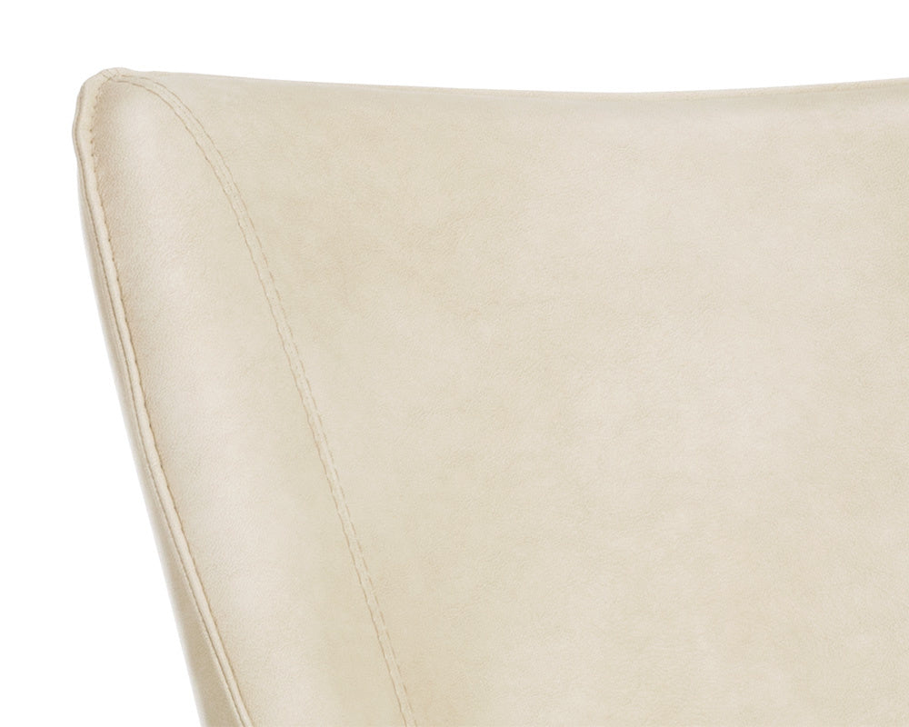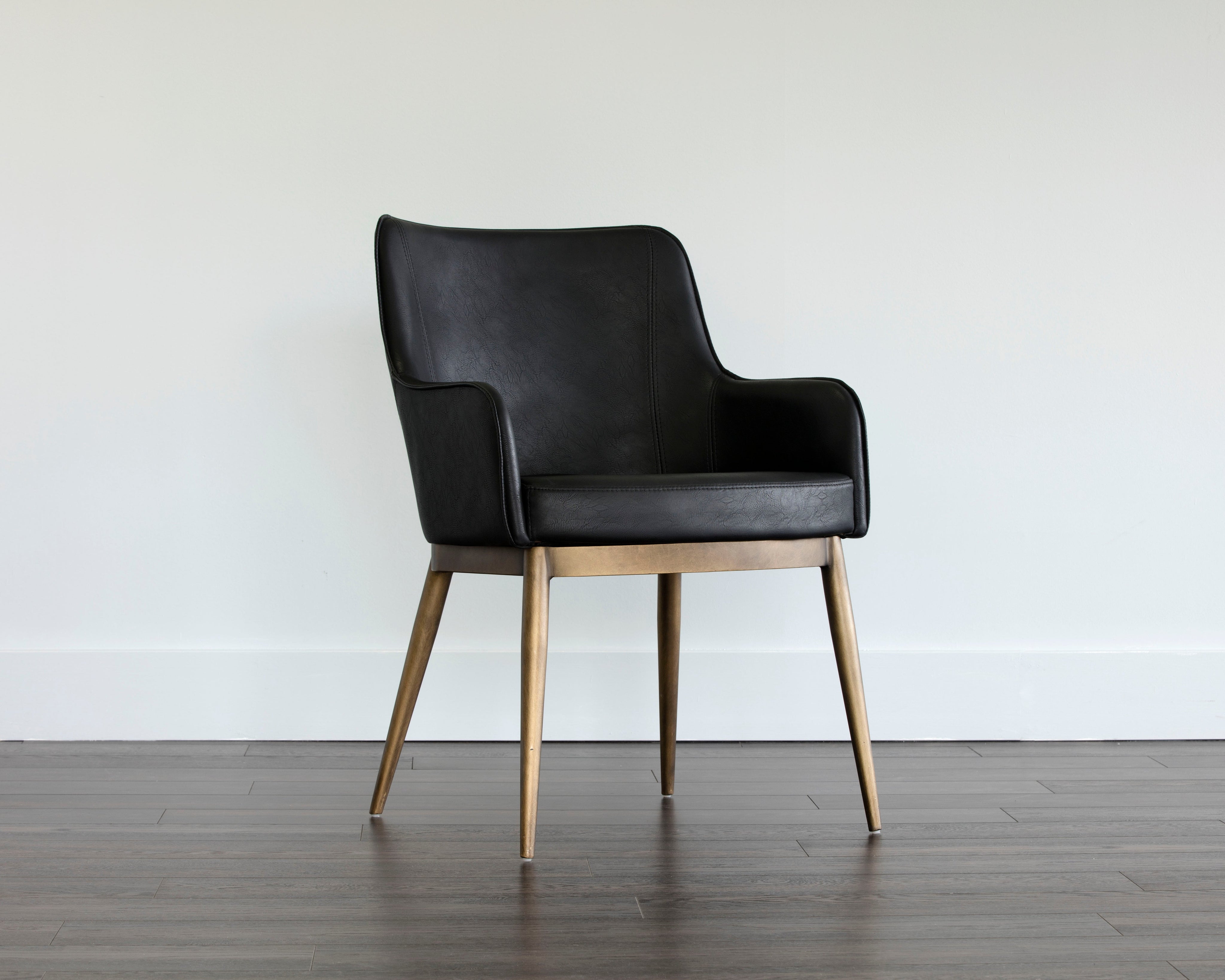 This compact barrel back armchair will add rustic and mid-century modern styling to dining and living spaces. Stocked in our beige linen fabric with antique brass steel frame and legs.