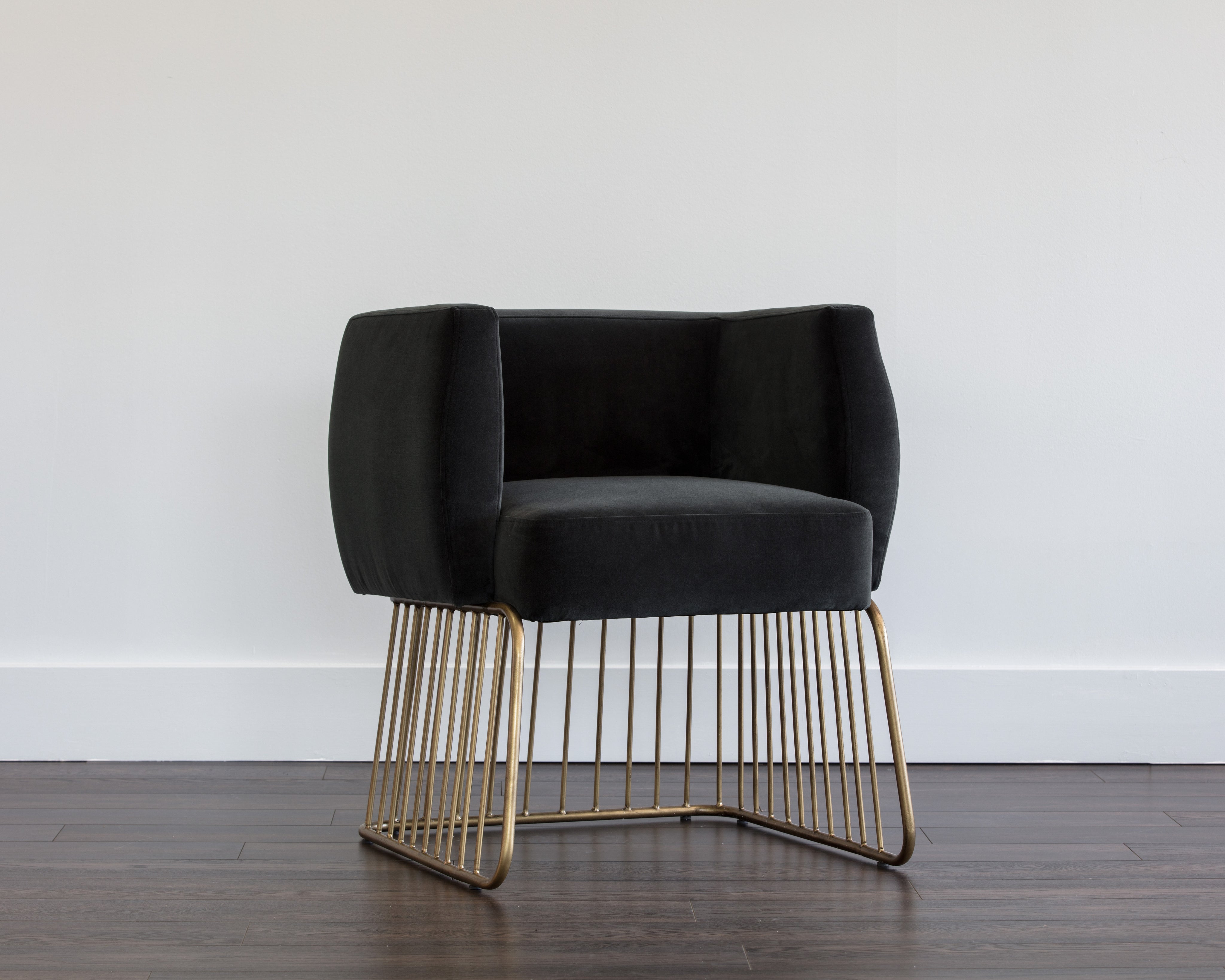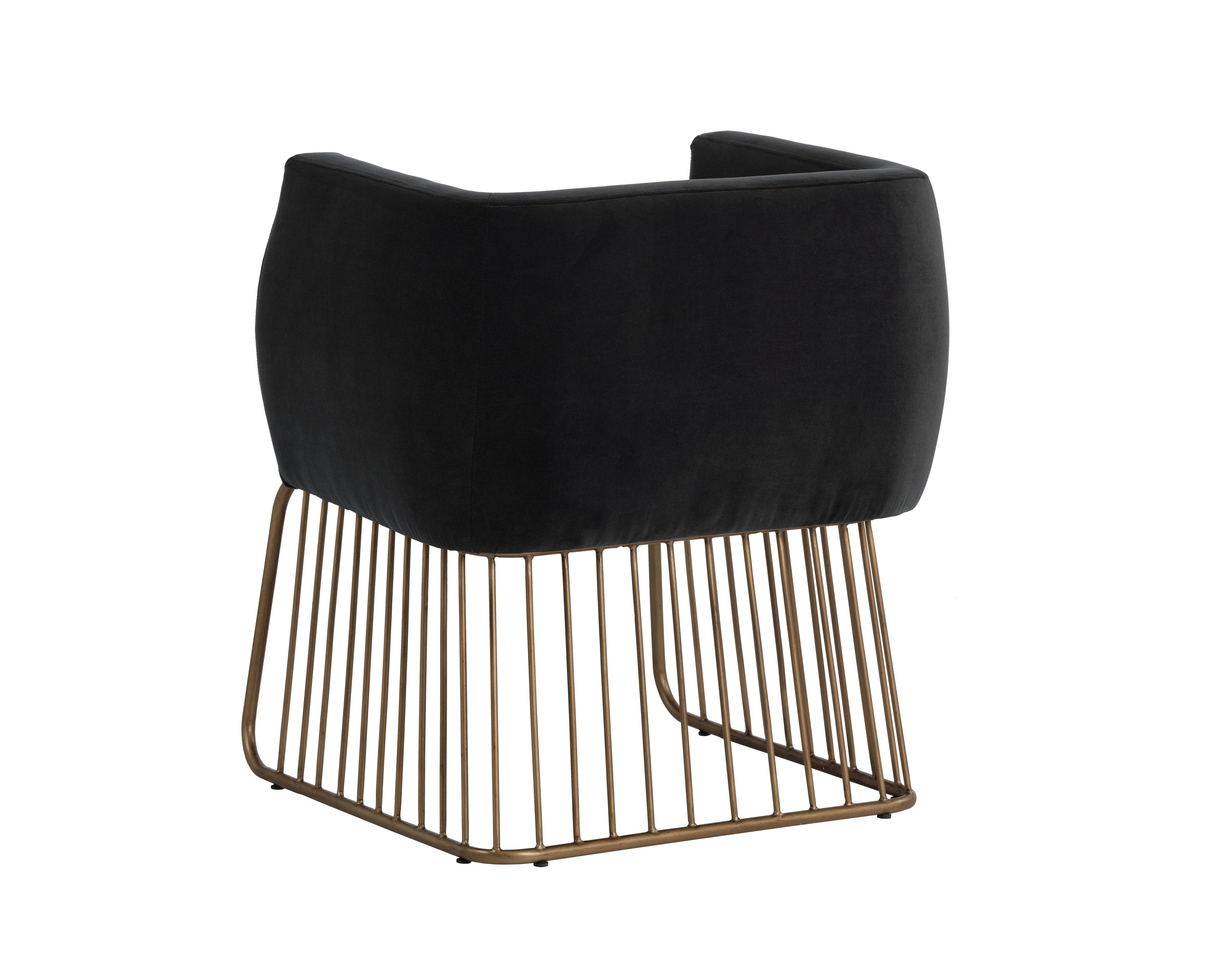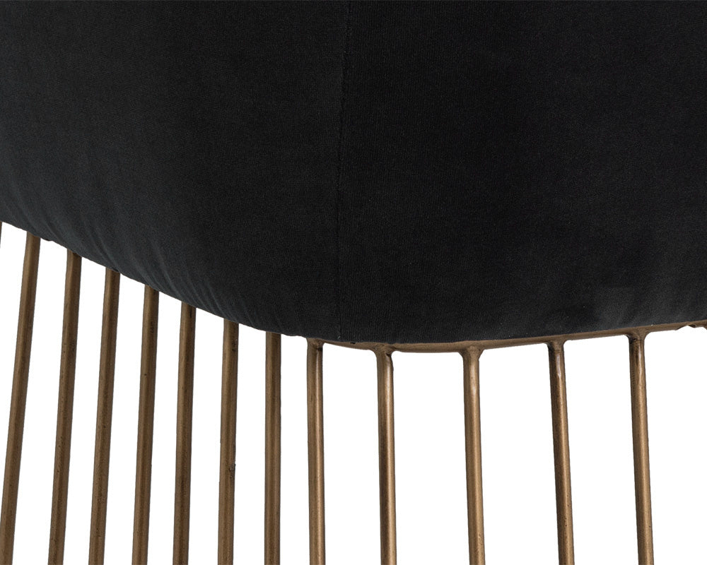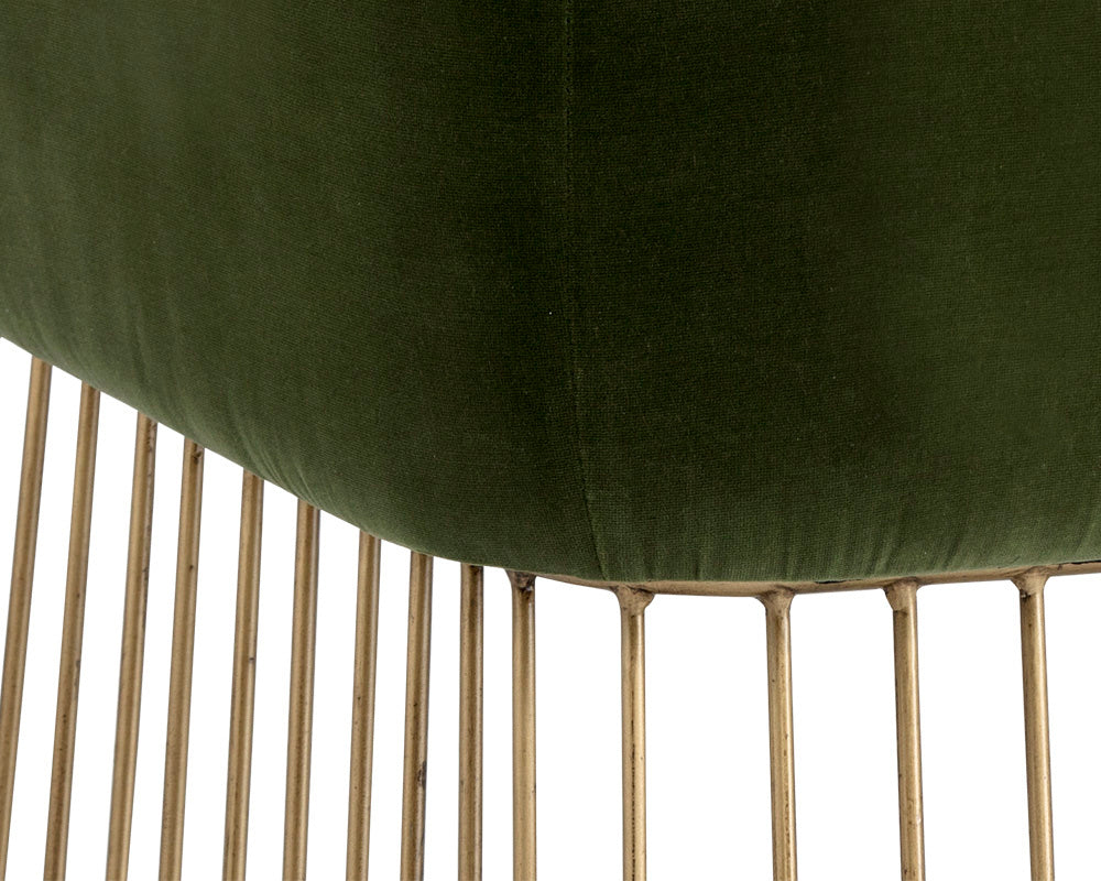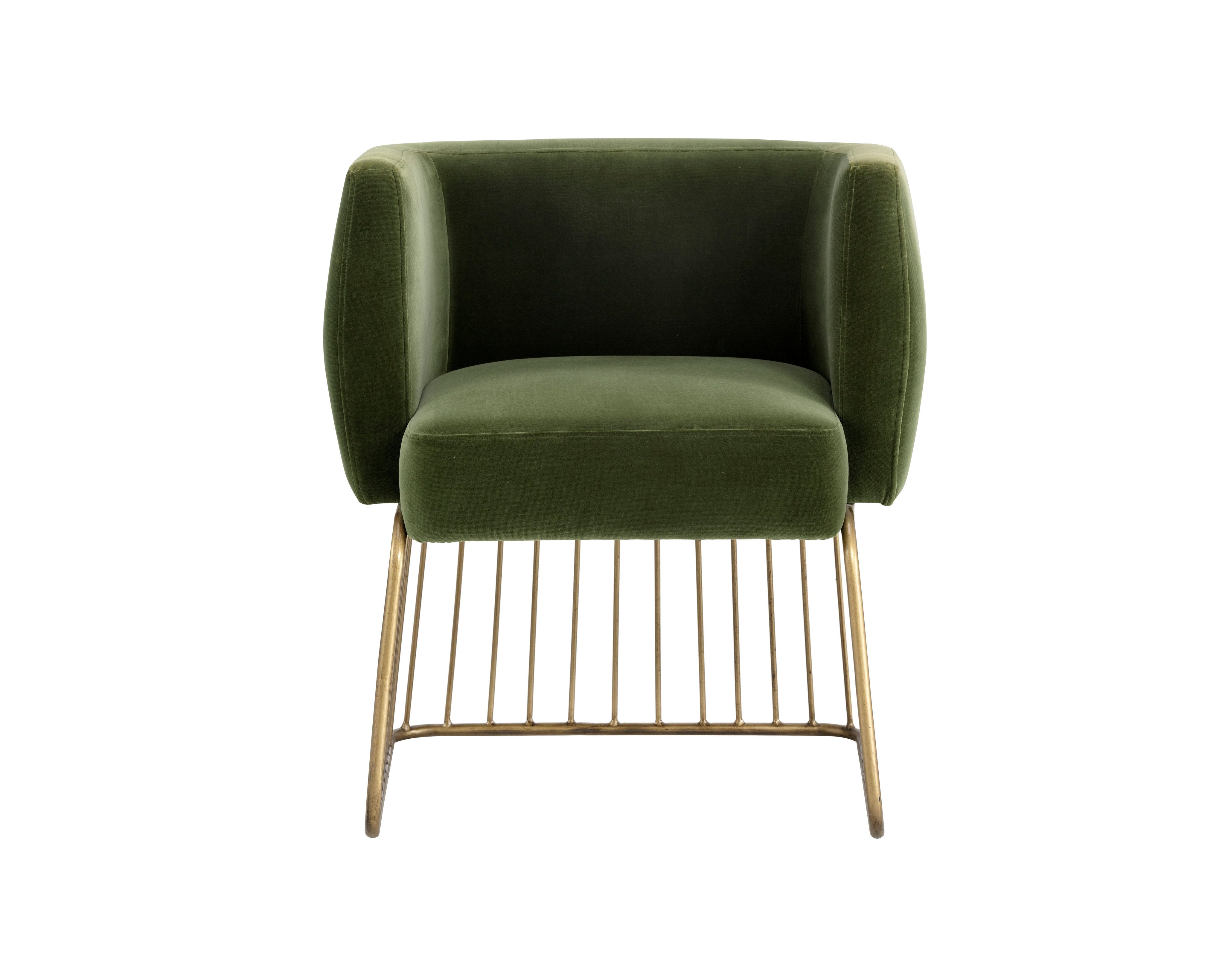 Rustic and modern charm come together in this dining chair. Stocked in our soft forest green fabric with a comfortable seat and unique brushed antique brass cage-style base. Perfect for dining, lounge and office spaces.