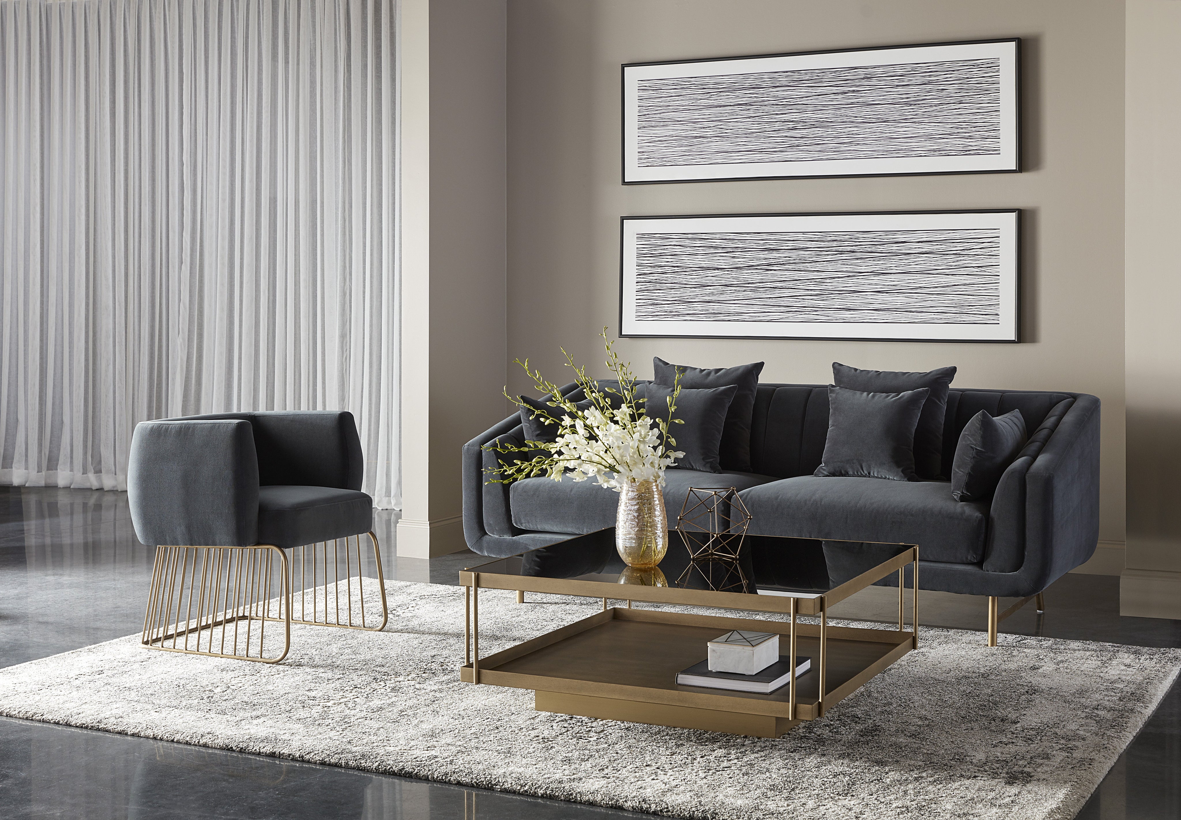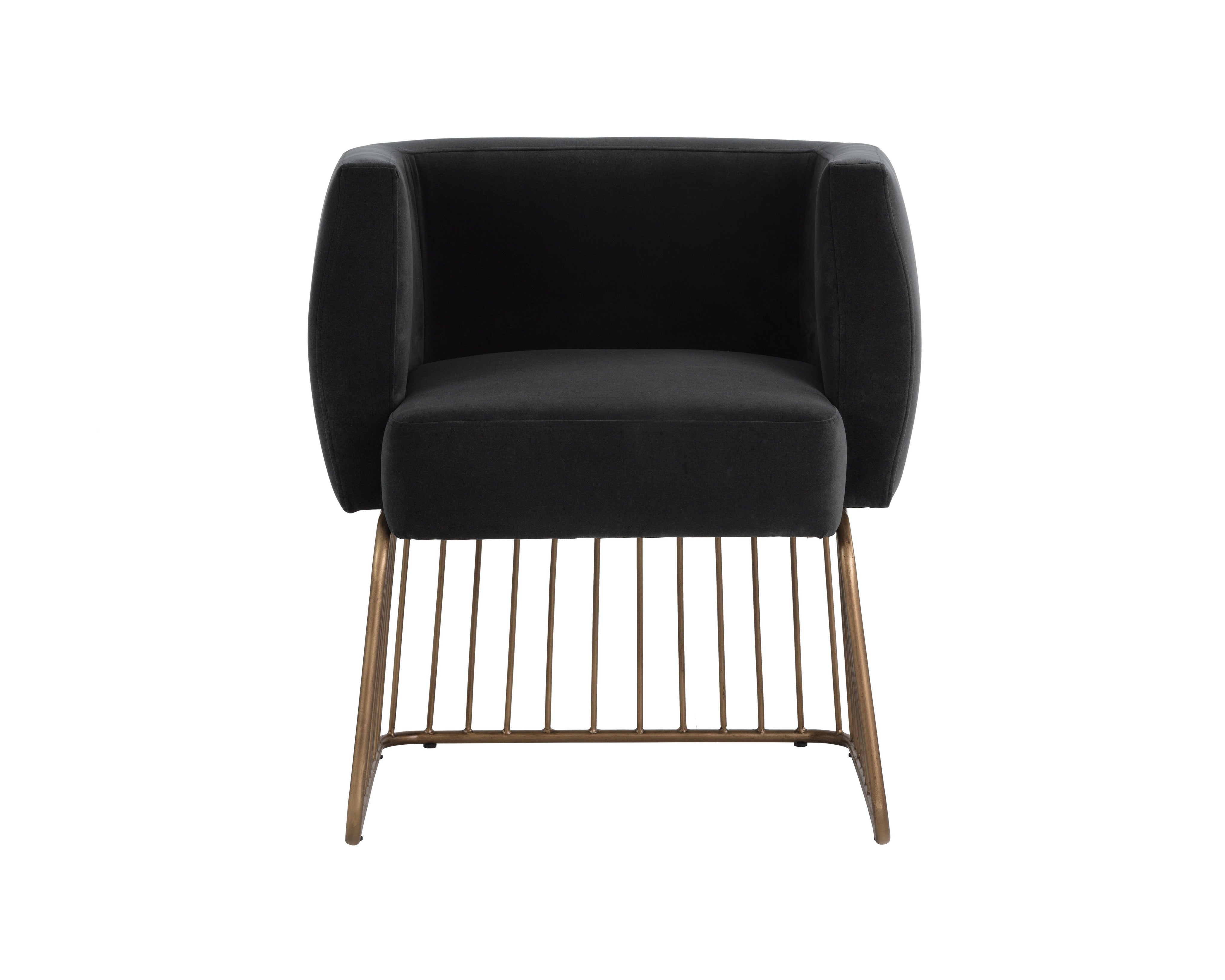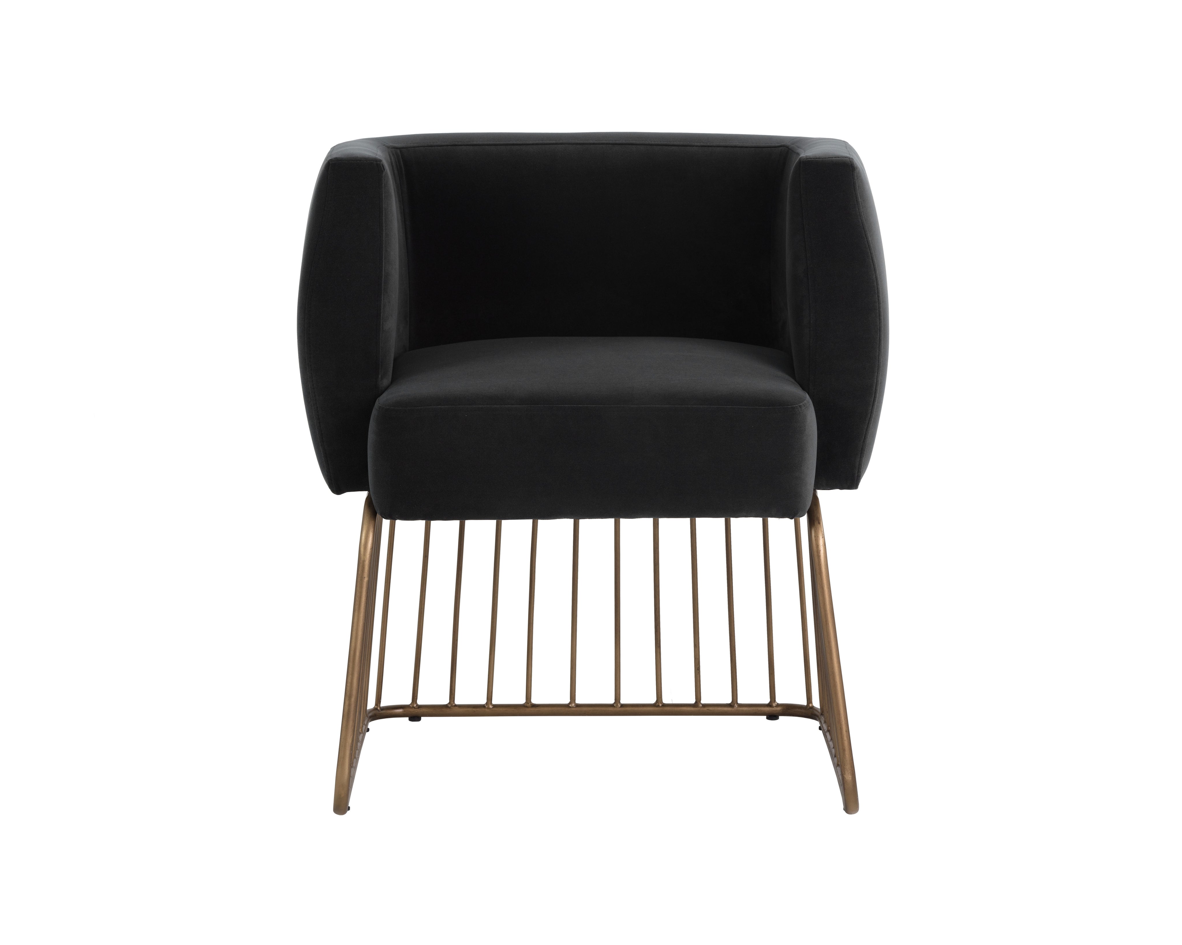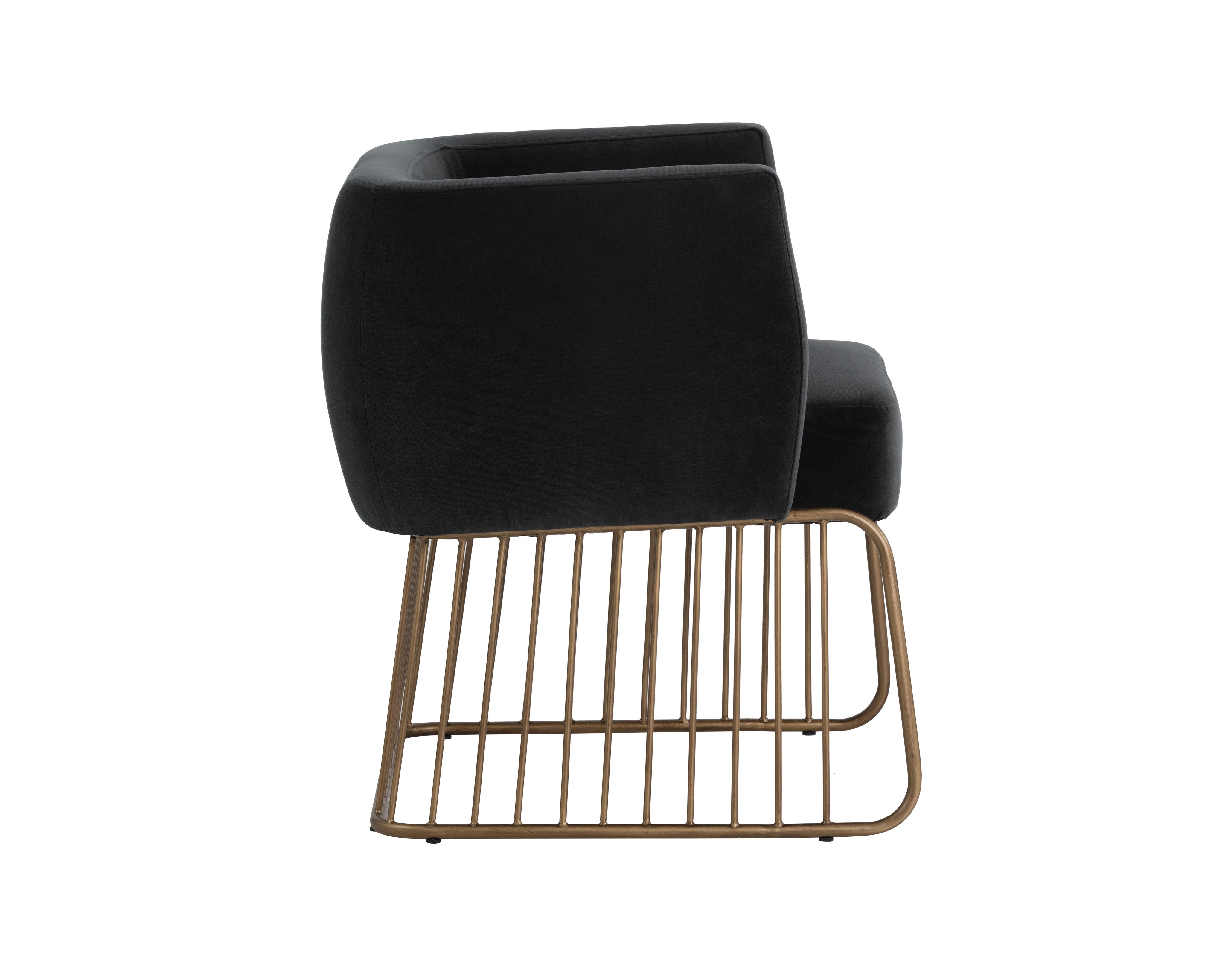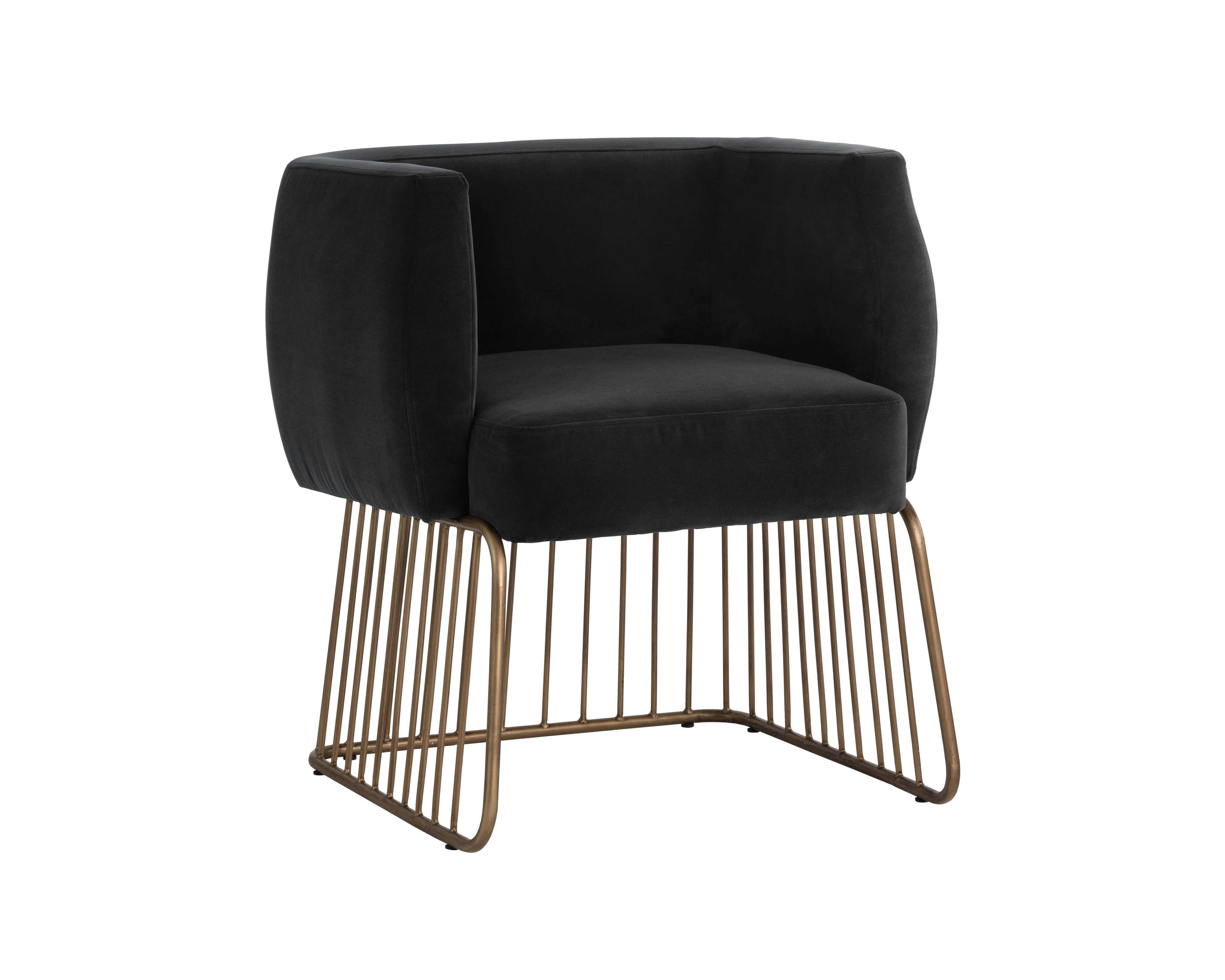 Rustic and modern charm come together in this dining chair. Stocked in our soft forest green fabric with a comfortable seat and unique brushed antique brass cage-style base. Perfect for dining, lounge and office spaces.