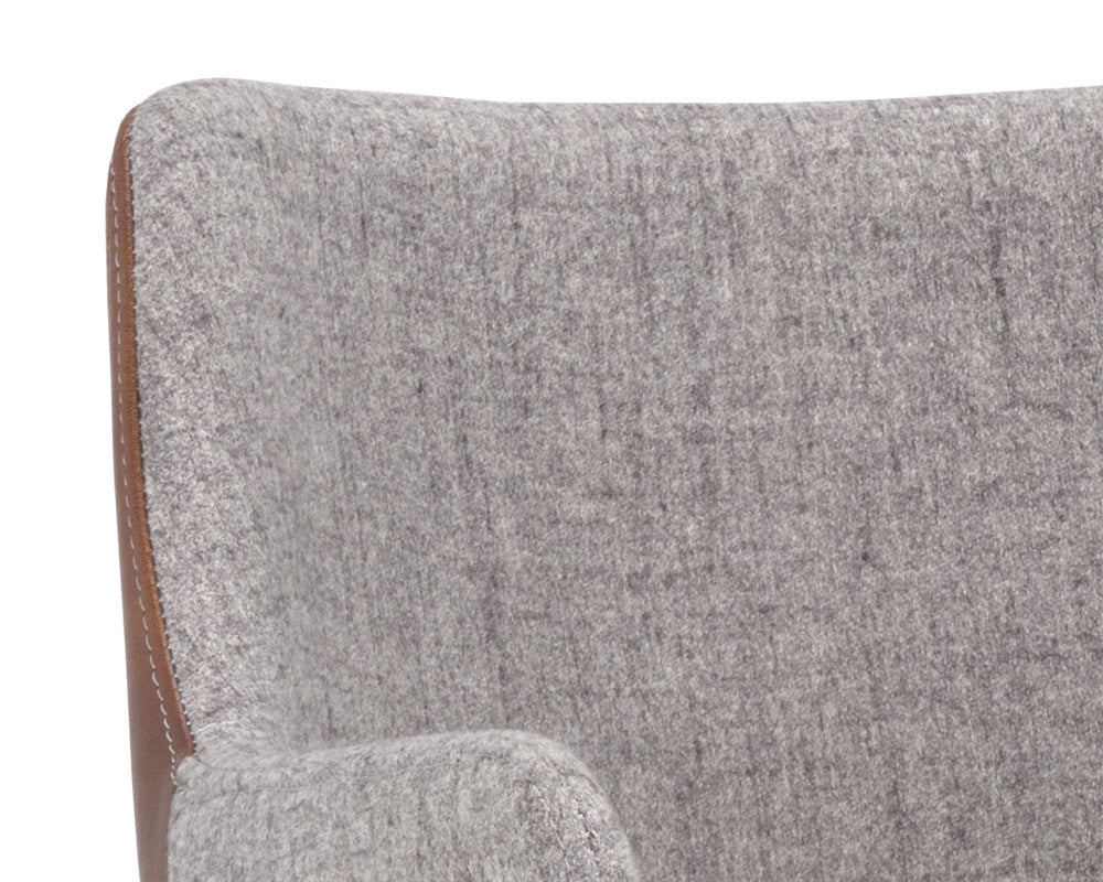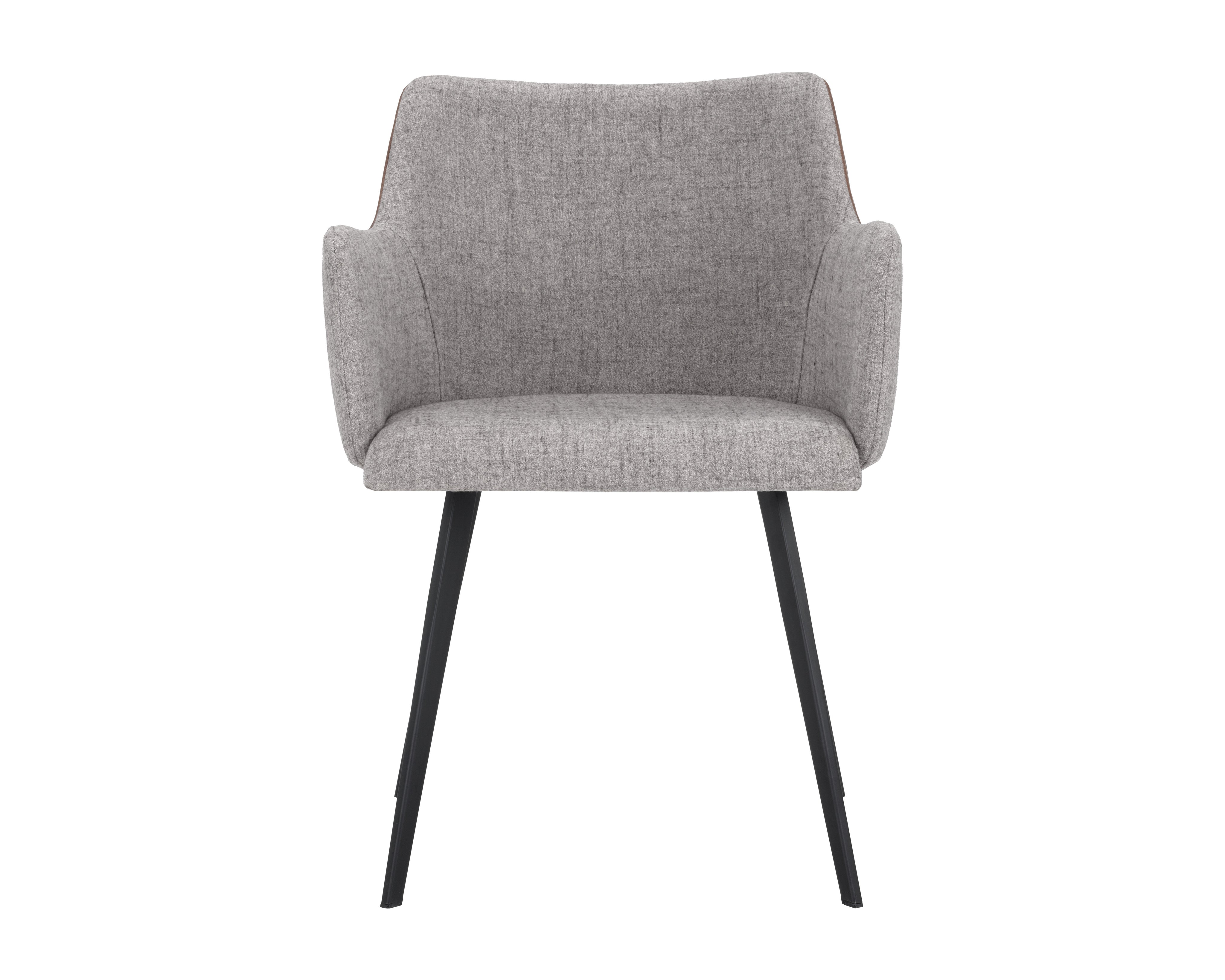 This modern dining armchair will provide comfort and style to any residential or commercial space. Features an interior seat in November grey fabric and a contrasting channel stitched exterior seatback in bravo cognac faux leather. Finished with sturdy black powder-coated iron legs. Handle With Care: This design has been crafted with faux leather. Faux leather is manufactured to reflect the natural characteristics of leather; as such, colour variations, markings, wrinkles, grooves, and light scratches are appreciated characteristics. No two pieces will be alike. Visit our Product Care page for more information on how to ensure the lasting beauty of this piece.