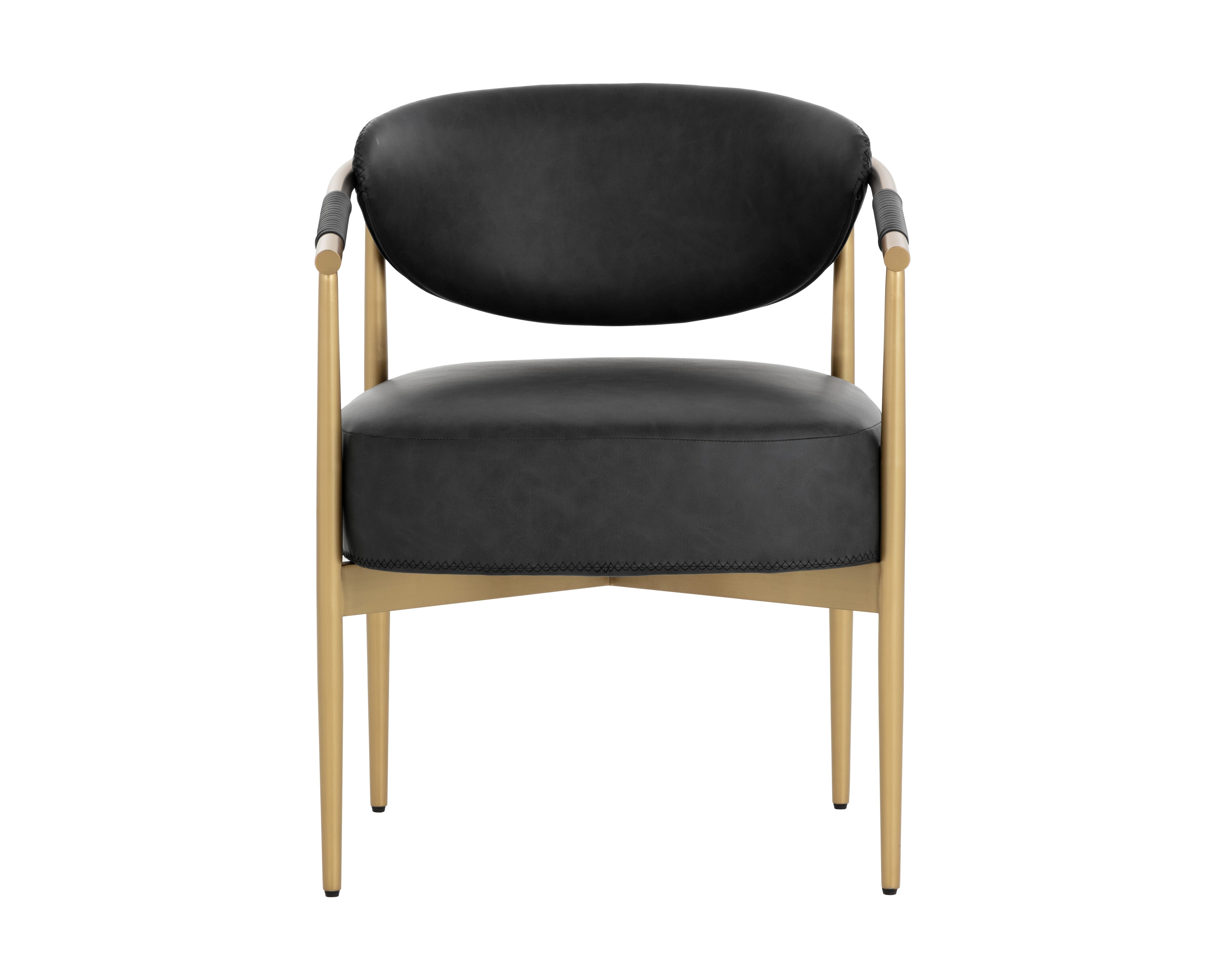 Every detail that makes up the handsome Heloise Dining Armchair is designed with purpose. Bravo black faux leather upholstery and rope detailing is paired with powder-coated gold stainless steel for optimal style and comfort. Visible stitching on the seat and backrest accentuates the chair's smooth contours. This elegant dining chair will perfectly complement any dining space. Handle With Care: This design has been crafted with faux leather. Faux leather is manufactured to reflect the natural characteristics of leather; as such, colour variations, markings, wrinkles, grooves, and light scratches are appreciated characteristics. No two pieces will be alike. Visit our Product Care page for more information on how to ensure the lasting beauty of this piece.