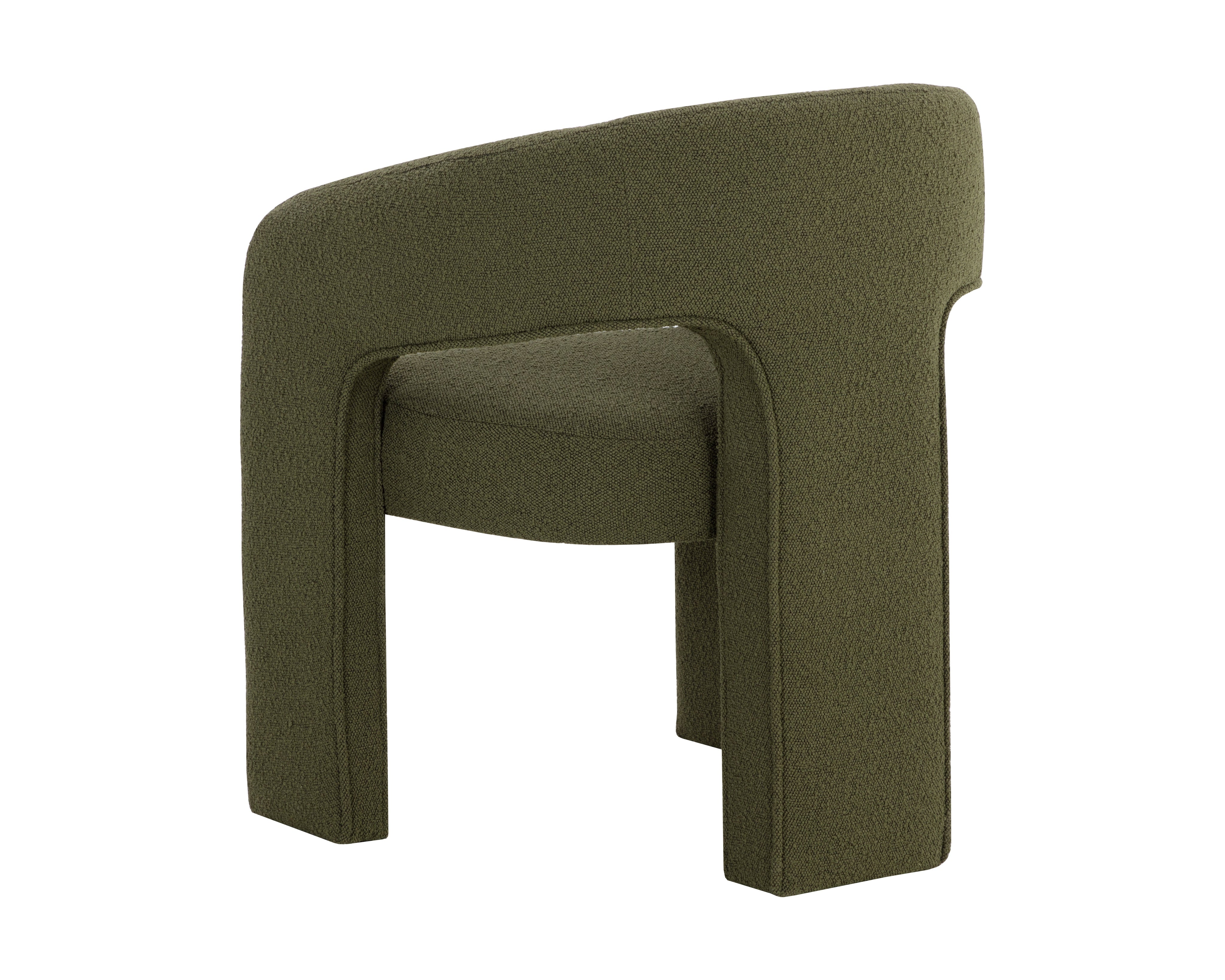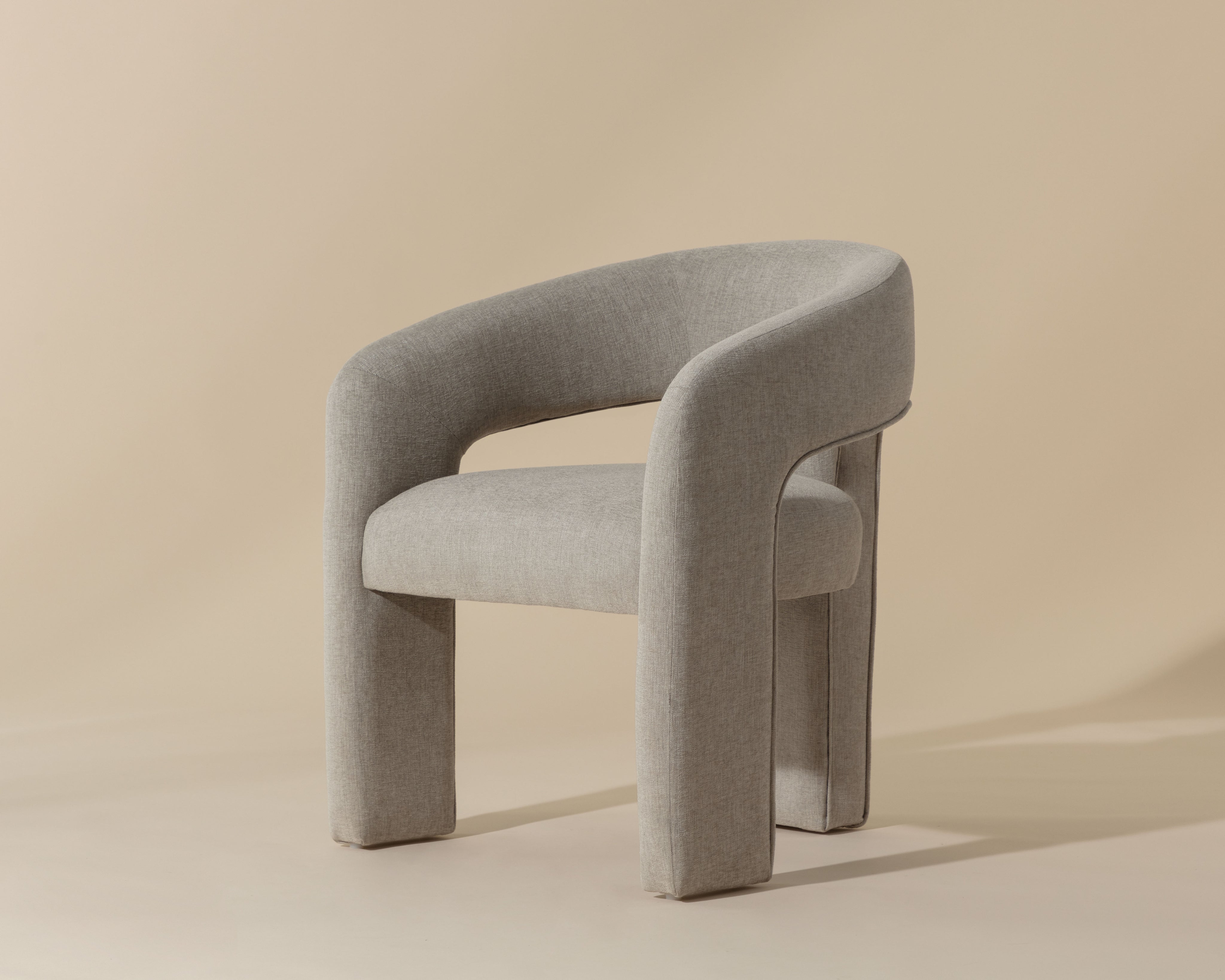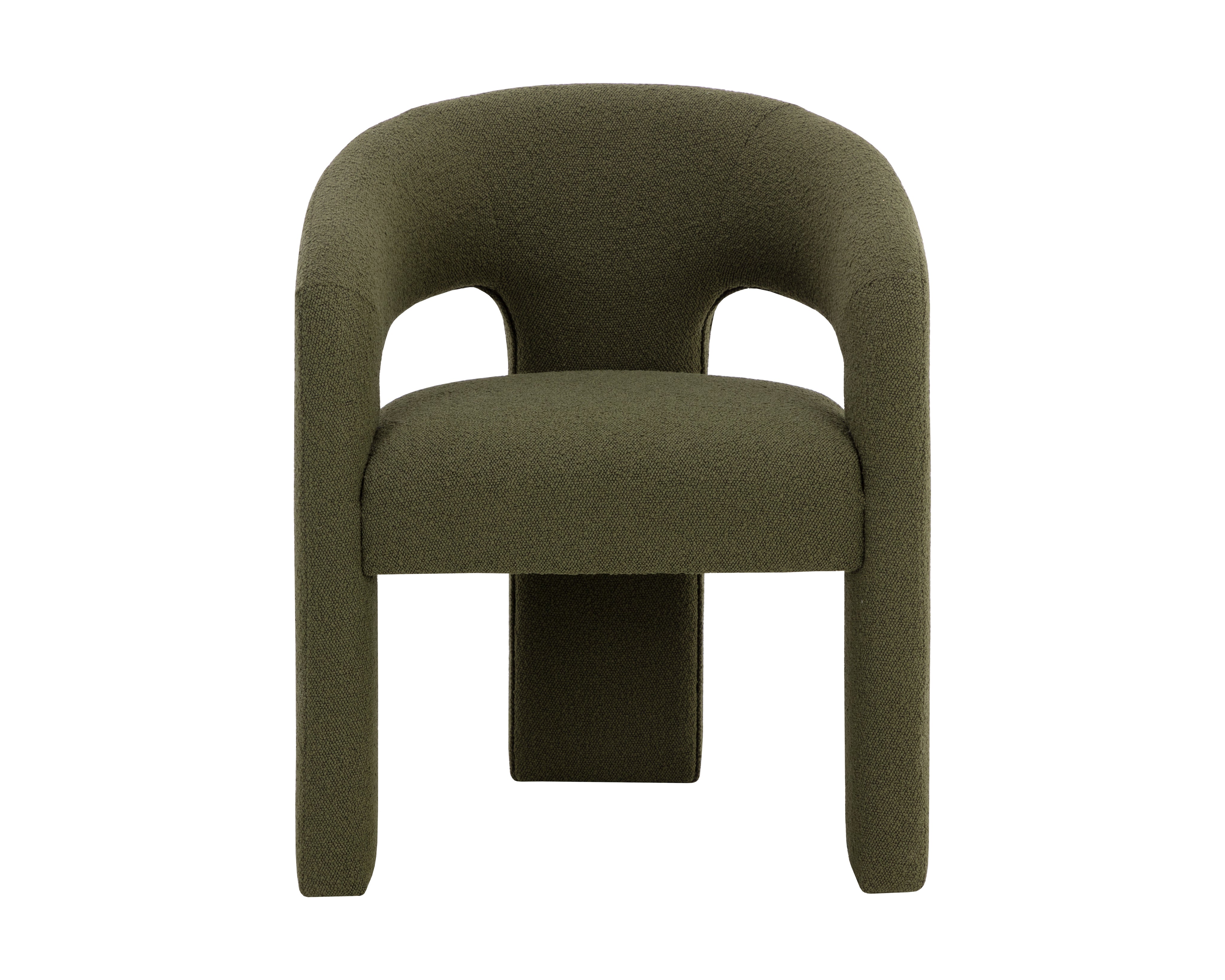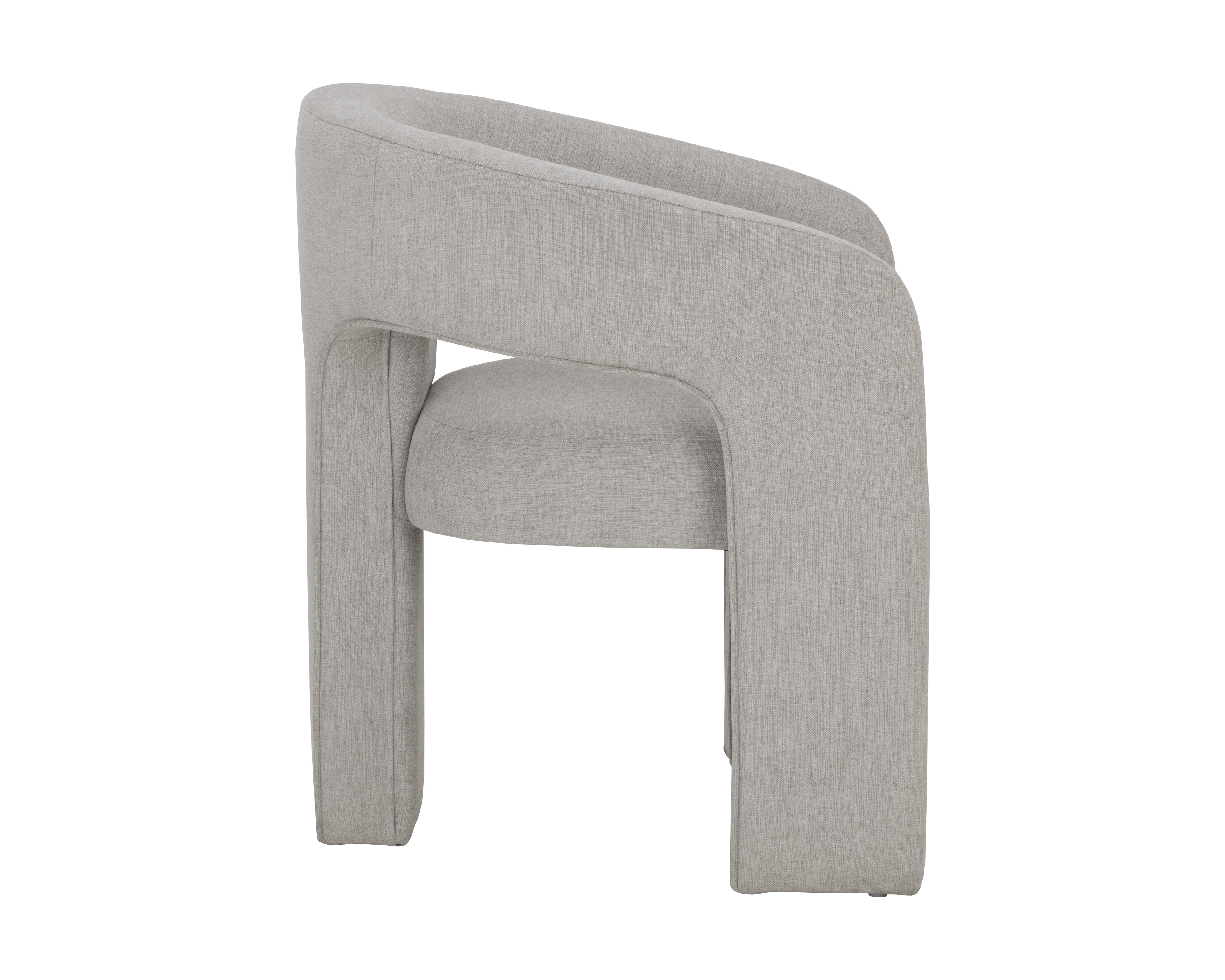 Clean lines and contoured arches add style and structure to this contemporary dining chair. Features a curved backrest and open back for optimal comfort. Eye-catching from all angles. Fully upholstered in our abbington back fabric.