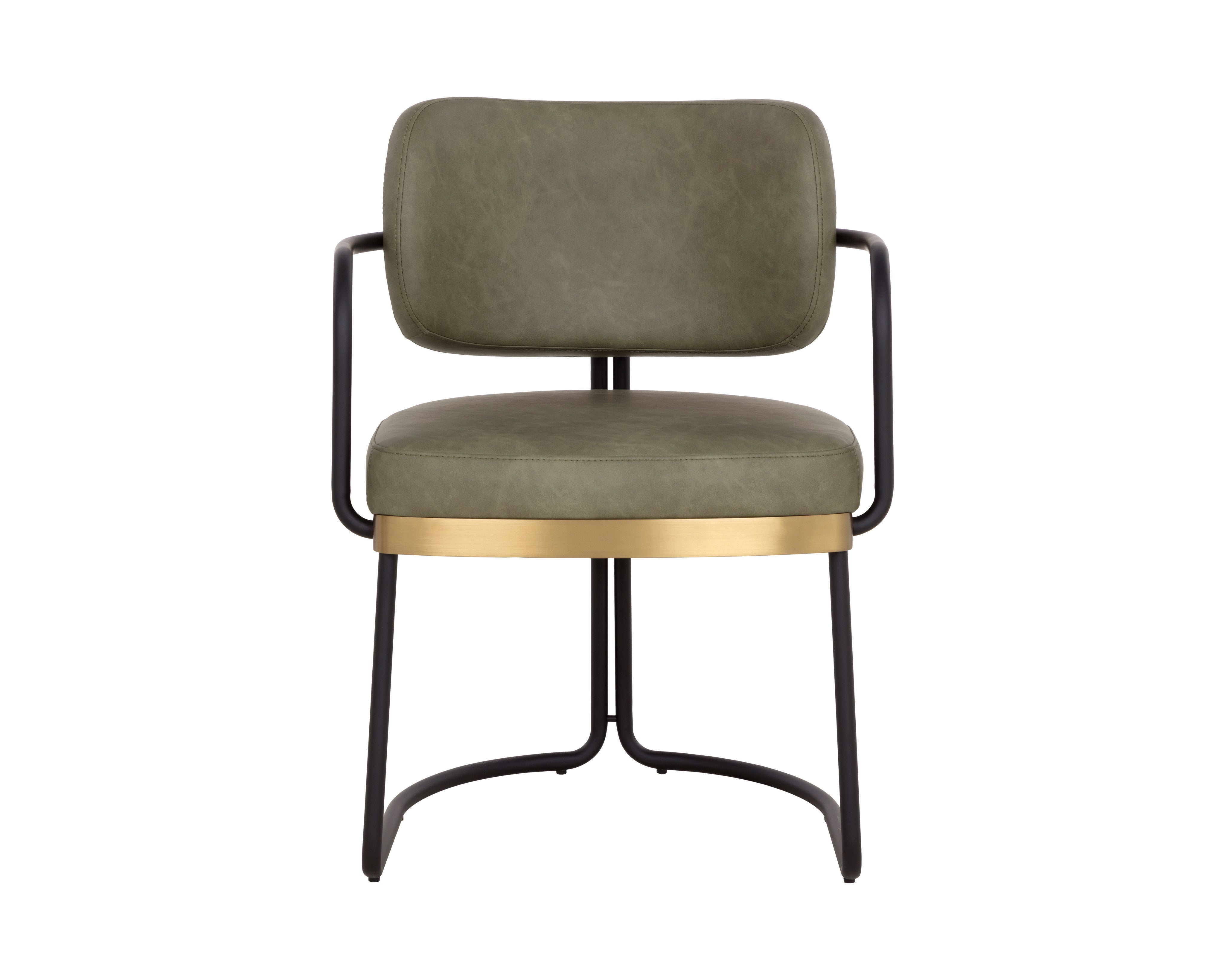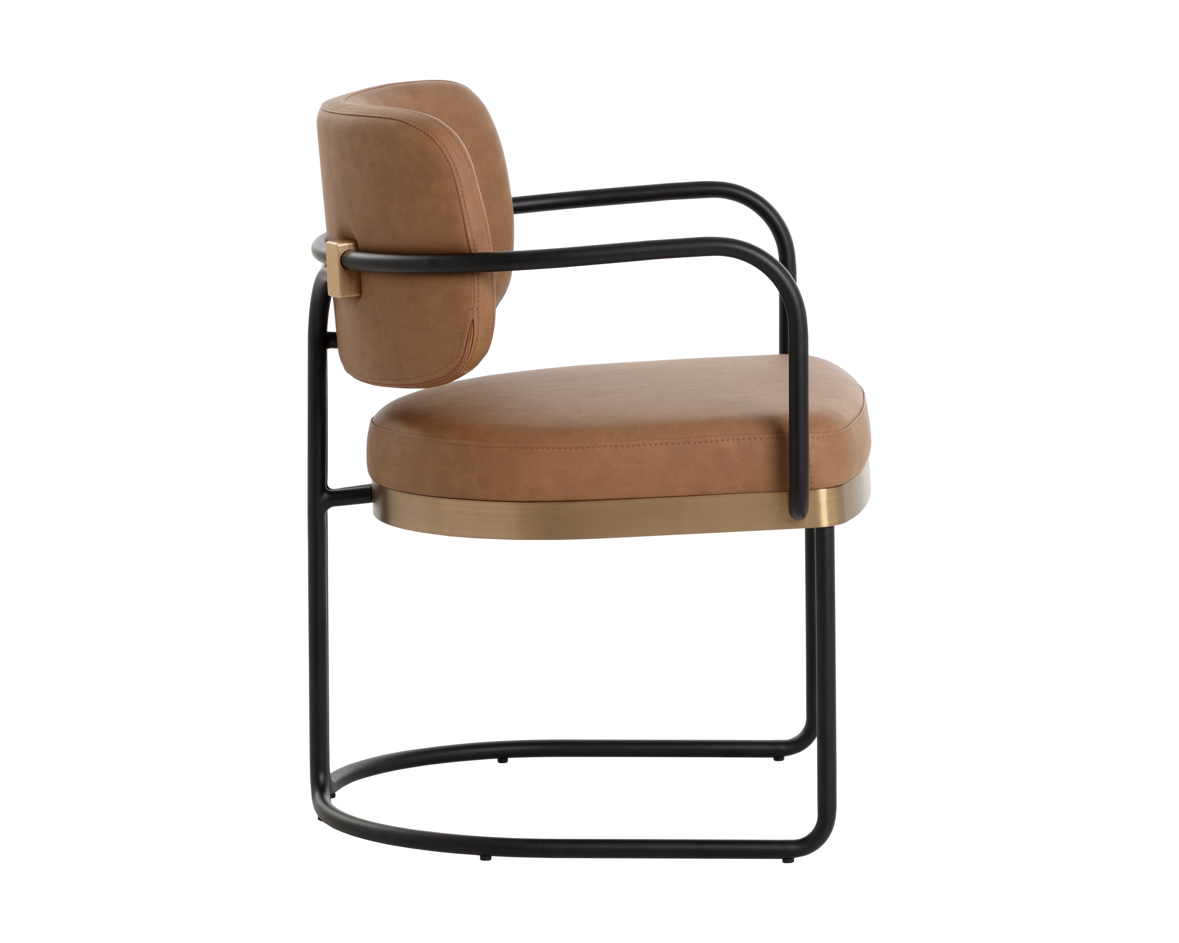 The Jalen Dining Armchair is poised to be a guest favourite thanks to its free flowing curves and gold stainless steel accents. Made from powder-coated iron with a supportive seat and back upholstered in smooth faux leather, this armchair will fit into any residential or commercial setting.
