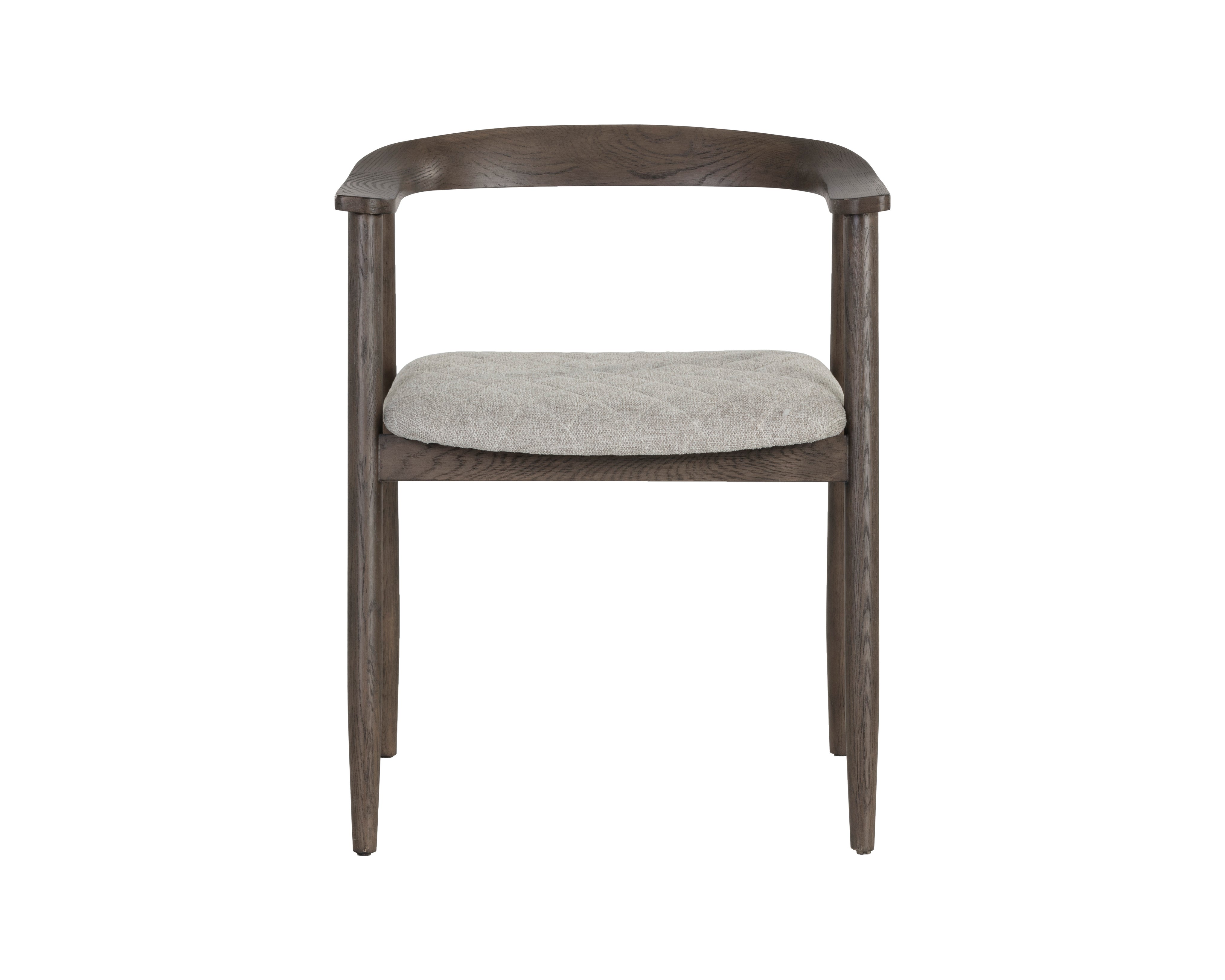 An alluring mid-century dining armchair that embraces the beauty of simplicity. Features a comfortable, quilted cushion in belfast heather grey fabric. Completed with a dark brown solid oak wood frame. As wood is an organic, porous material, these pieces will contain natural variation of texture and may also exhibit fine indentations and cracks. Wood pieces will also display a disparity of colour and grain, and visible knots and burls that add to the character of each piece.