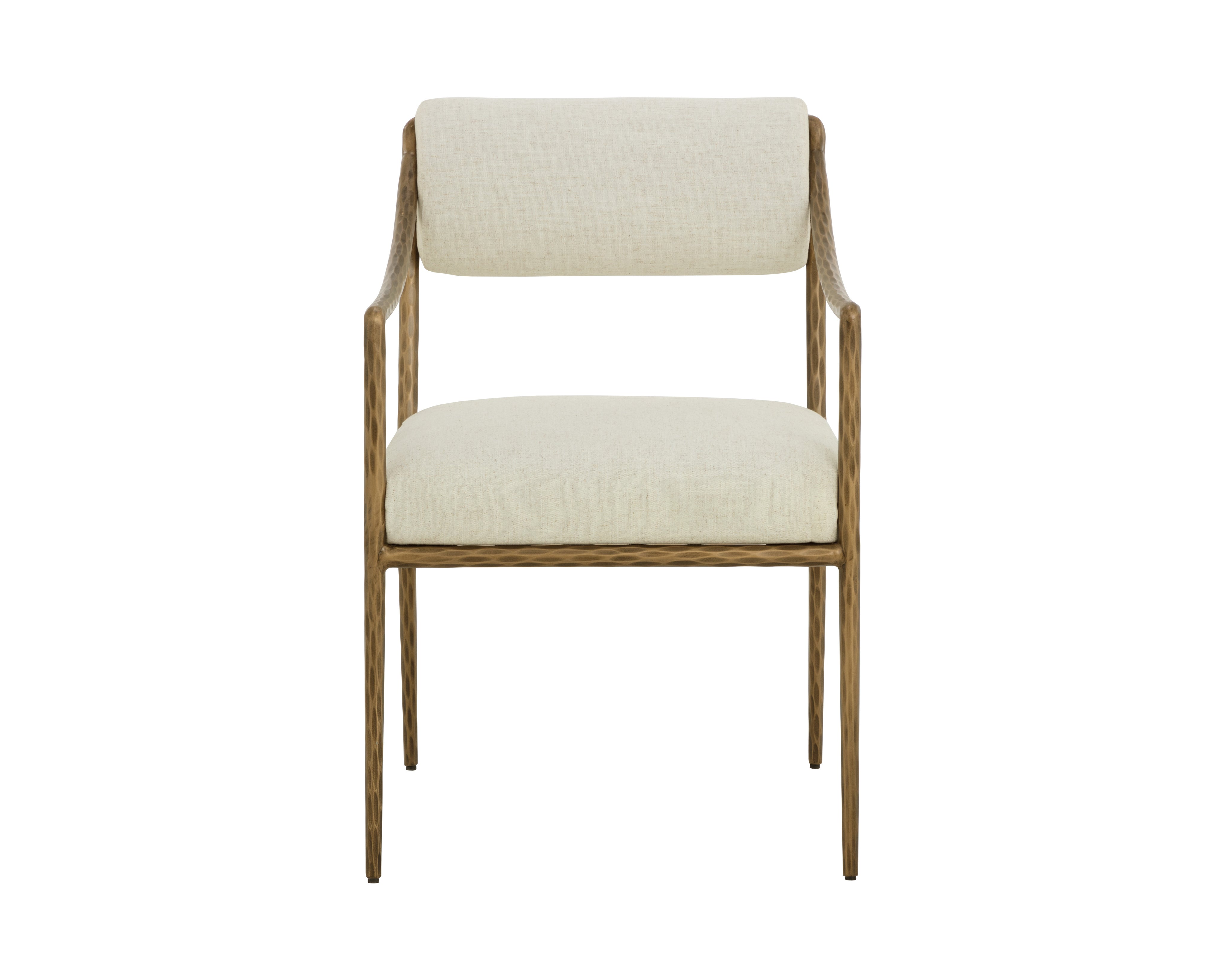 A timeless statement of expert craftsmanship, the Leticia Dining Armchair offers both beauty and resilience. Sloped arms invite ease, while hand-hammered detailing on the tapered metal frame lends an artisanal touch. Upholstered in geralt linen performance fabric, this versatile piece is equally at home at an elegant dinner party or styled as an accent chair.