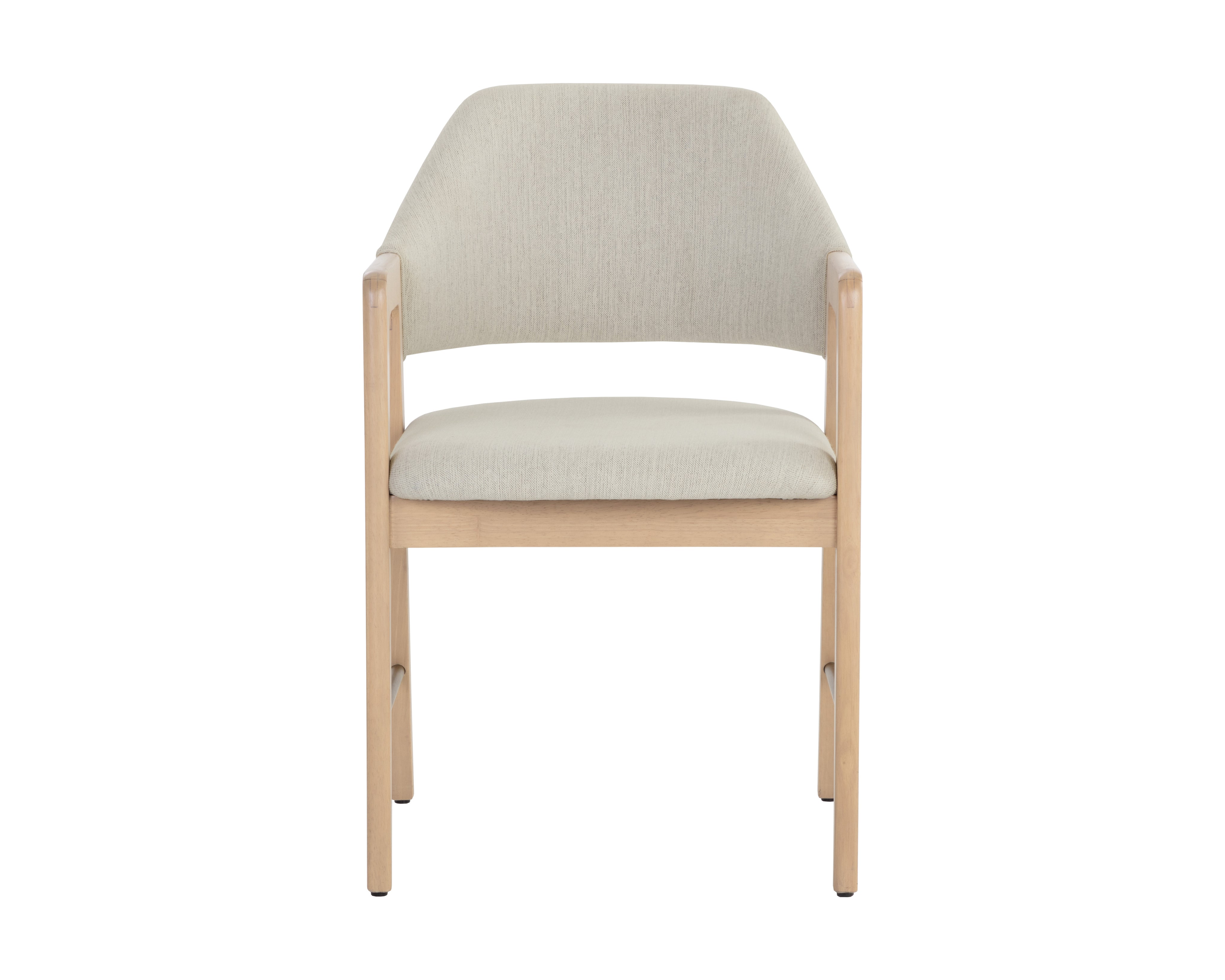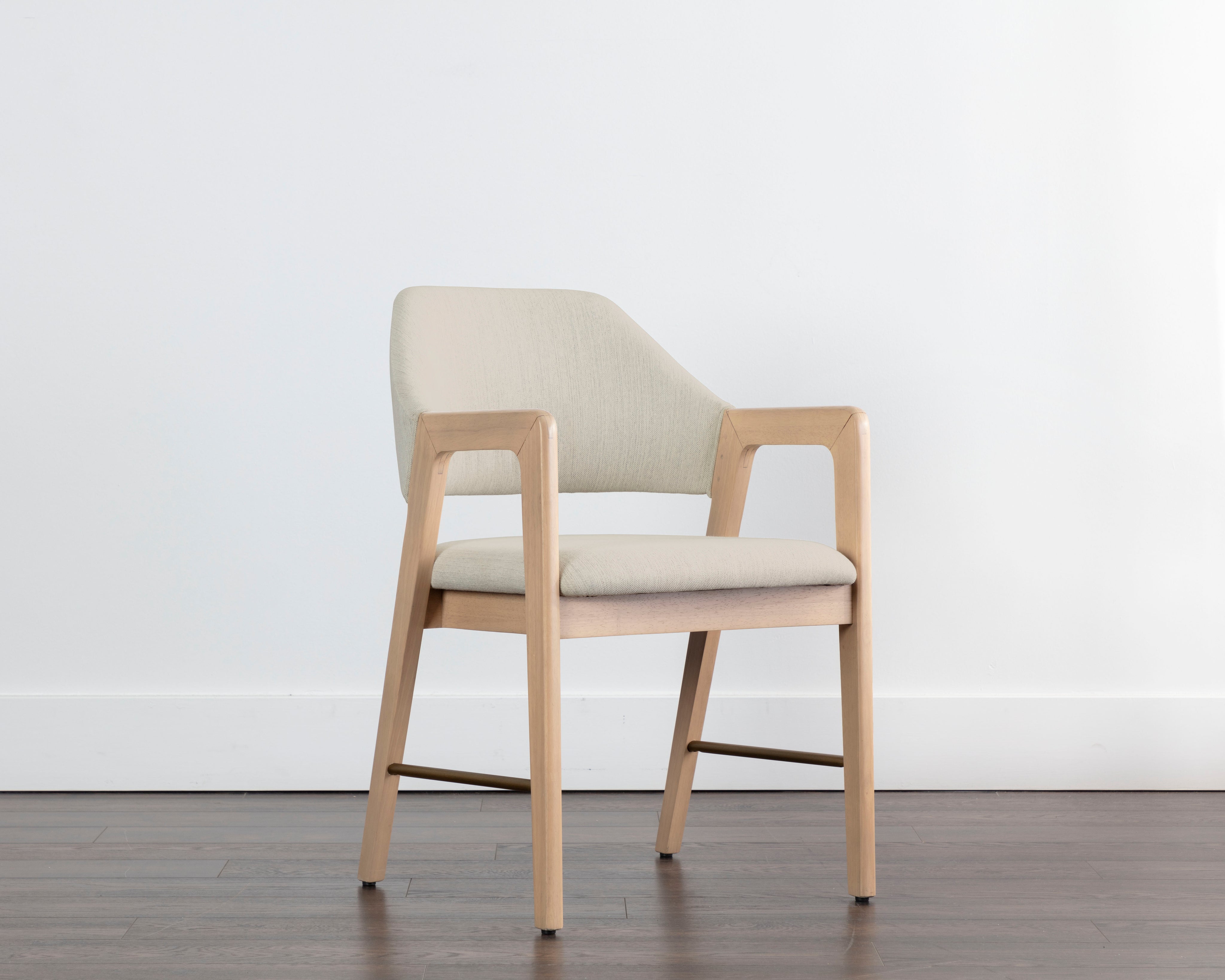 Chic and charming, this dining armchair has a blissful mid-century modern design with understated details. Stocked in mina ivory fabric with a solid rubberwood frame in a light wash finish. Completed with antique brass stretchers.