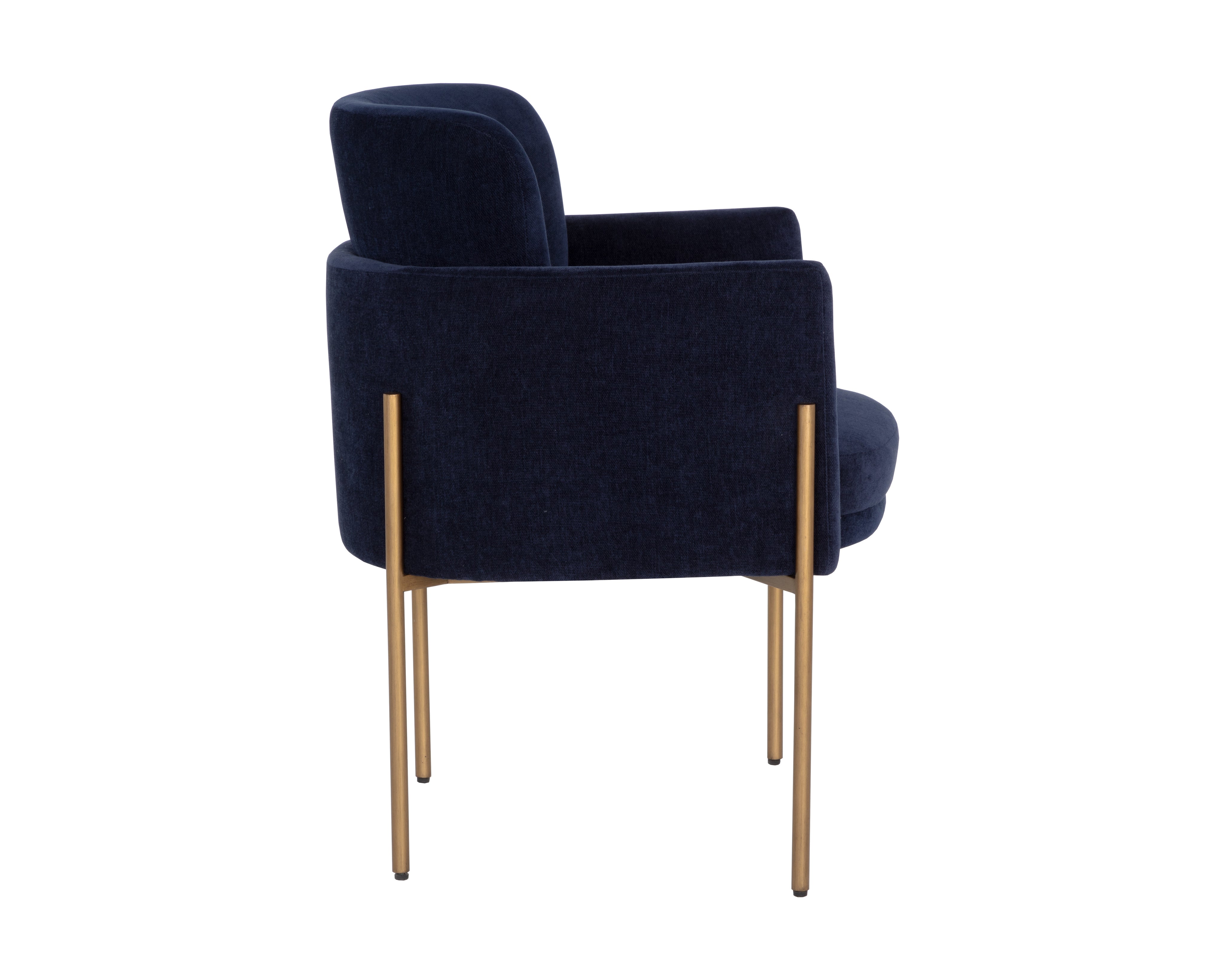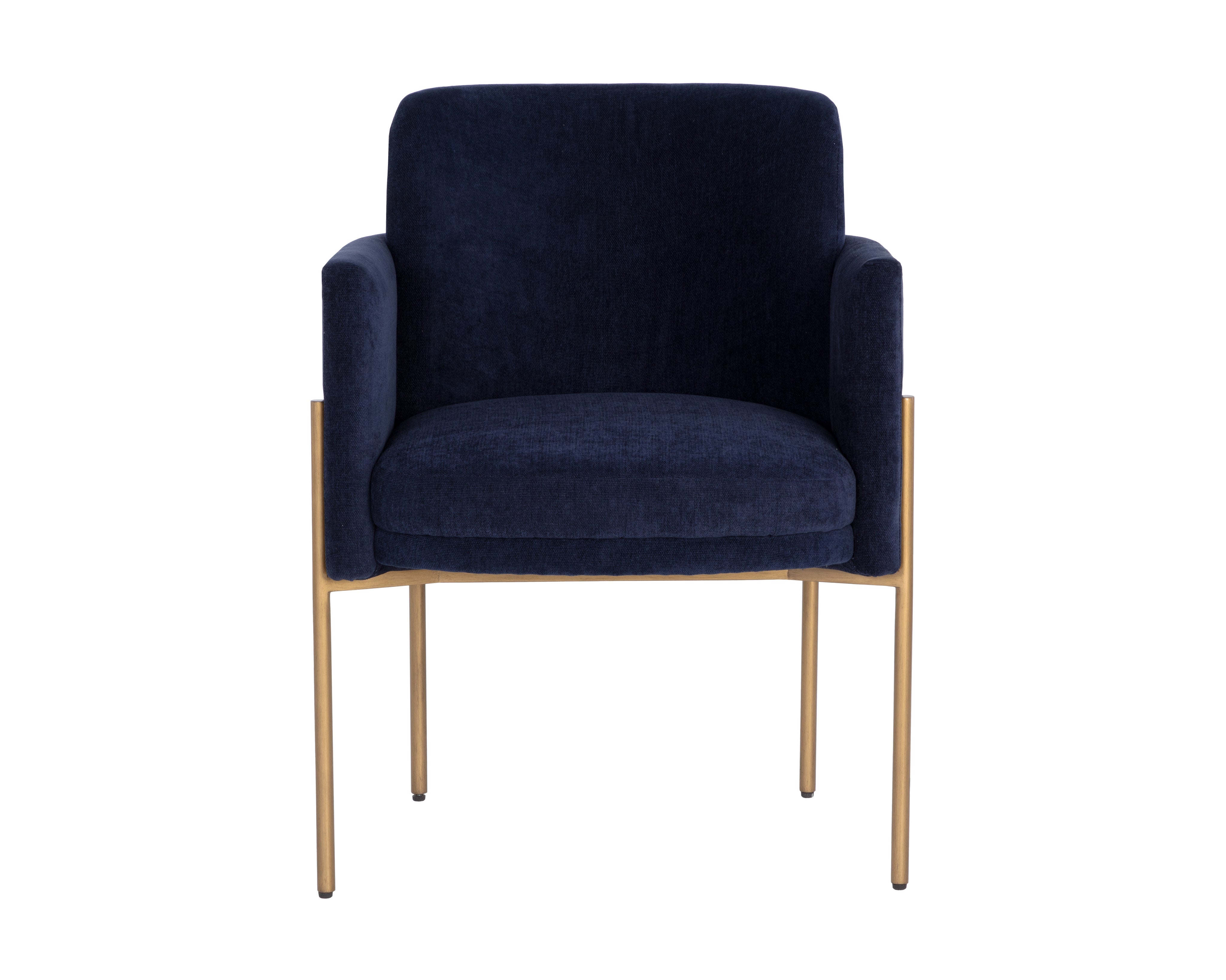 Invite guests to dine in style with this modern dining armchair. Designed with a comfortable seat in a softly textured danny navy fabric with exposed antique brass iron legs.