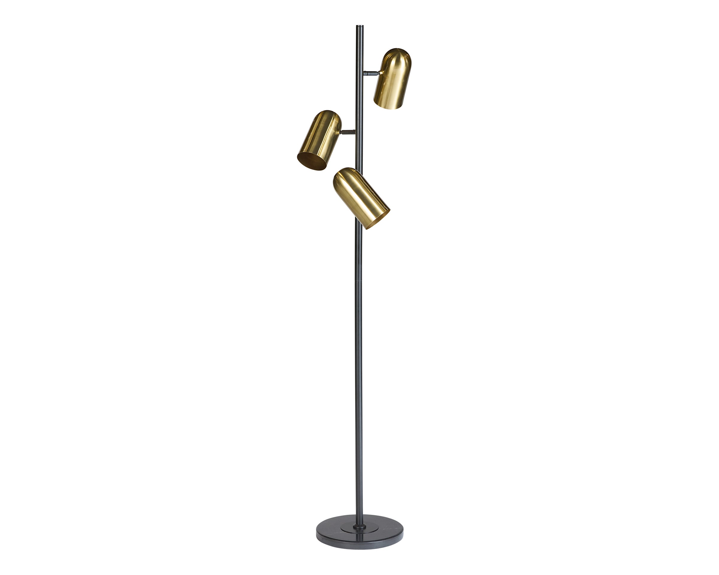 With a design inspired by mid-century style, this floor lamp is a timeless addition to any space. Features a black metal frame stand with three lamp shades in a brass finish.