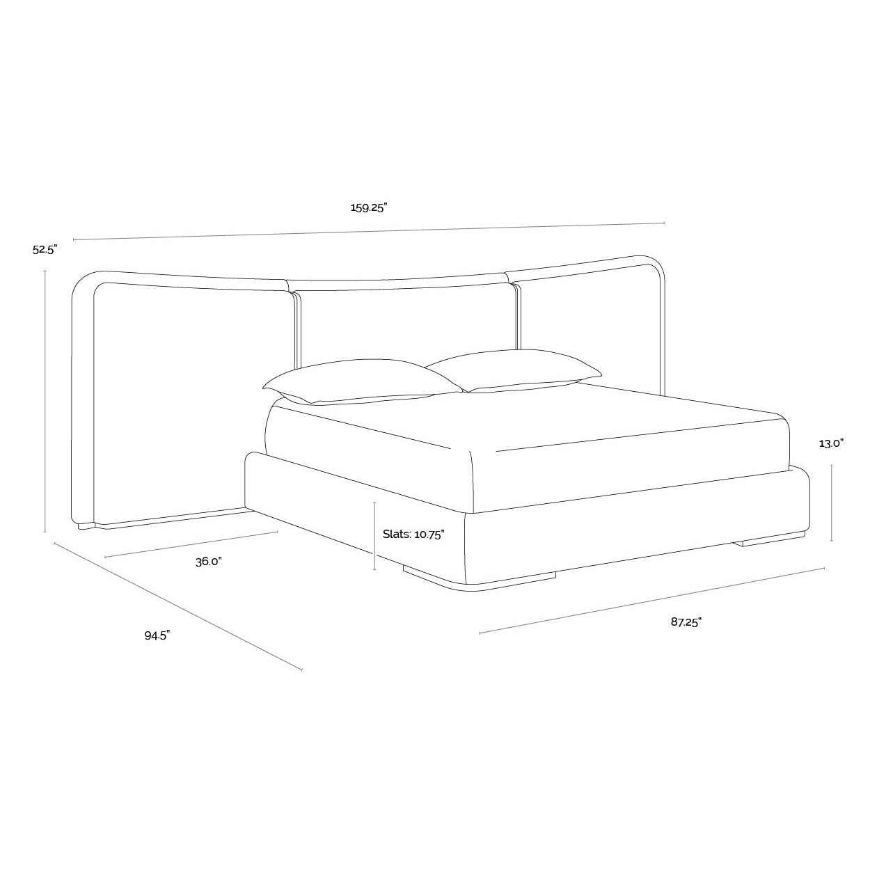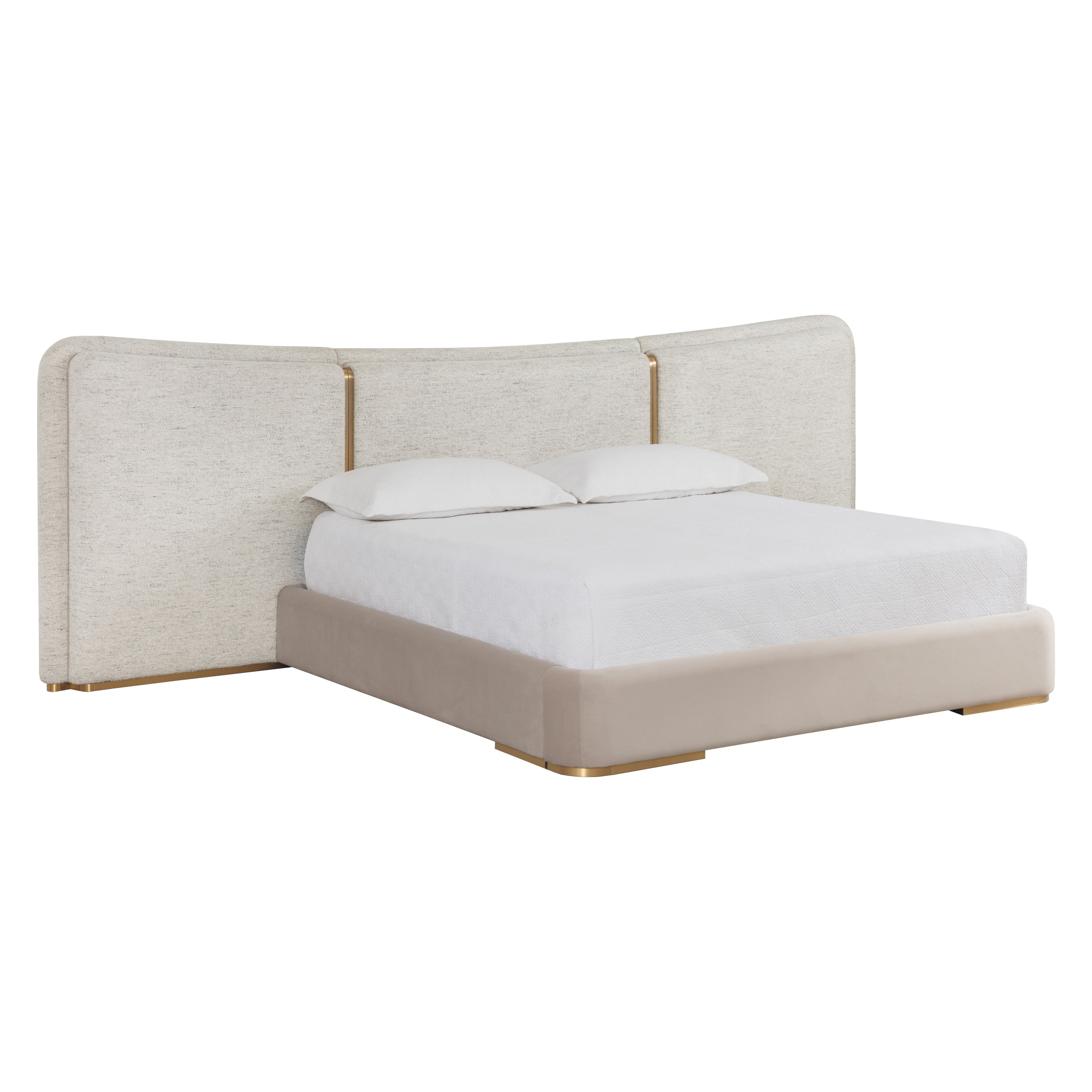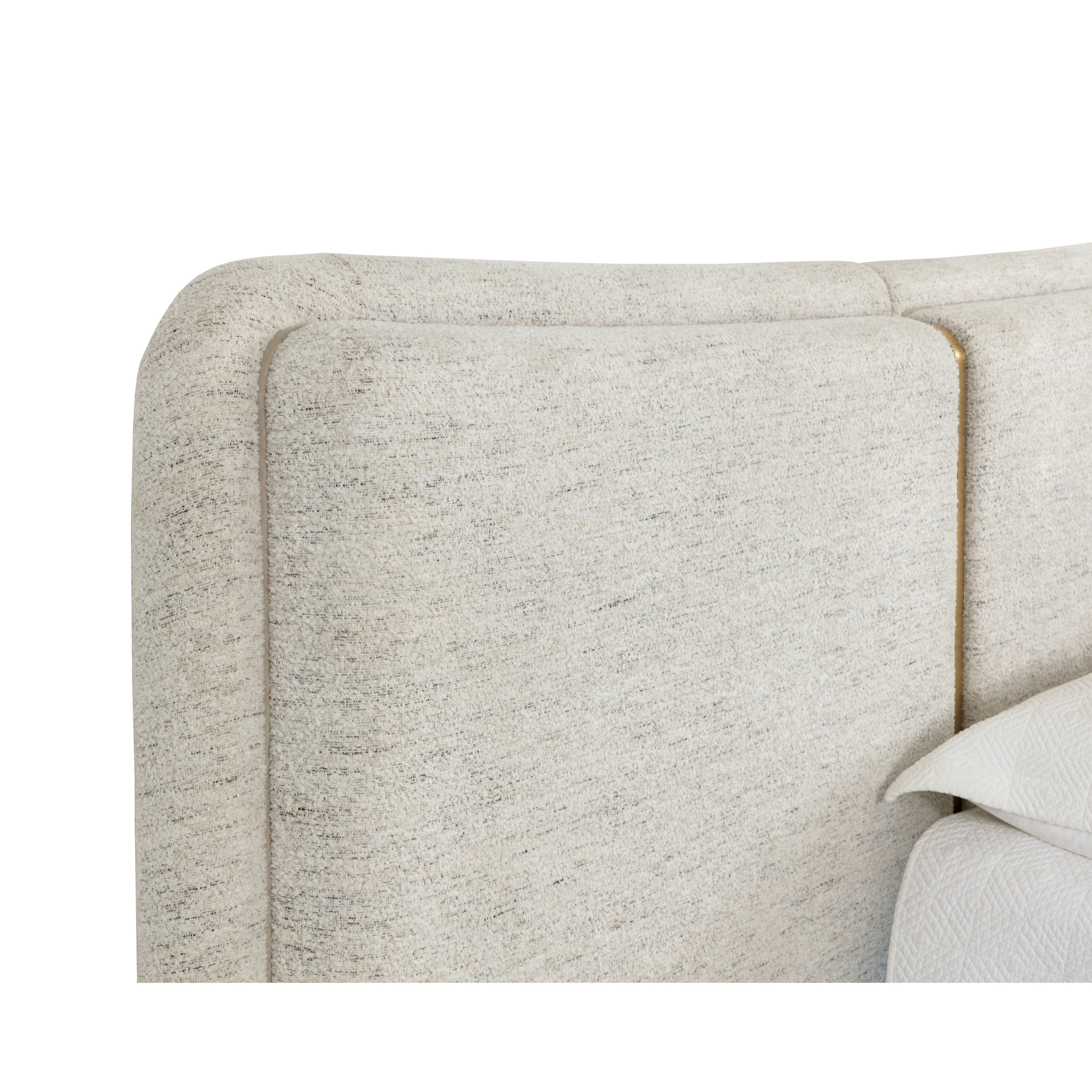 The Clarimond Bed is an interplay of texture and form. Its sweeping three-panel headboard is upholstered in richly textured boucle fabric, detailed with brushed gold stainless steel bands for a subtle shimmer. The low, rounded frame is upholstered in smooth fabric that contrasts beautifully with the tactile headboard.