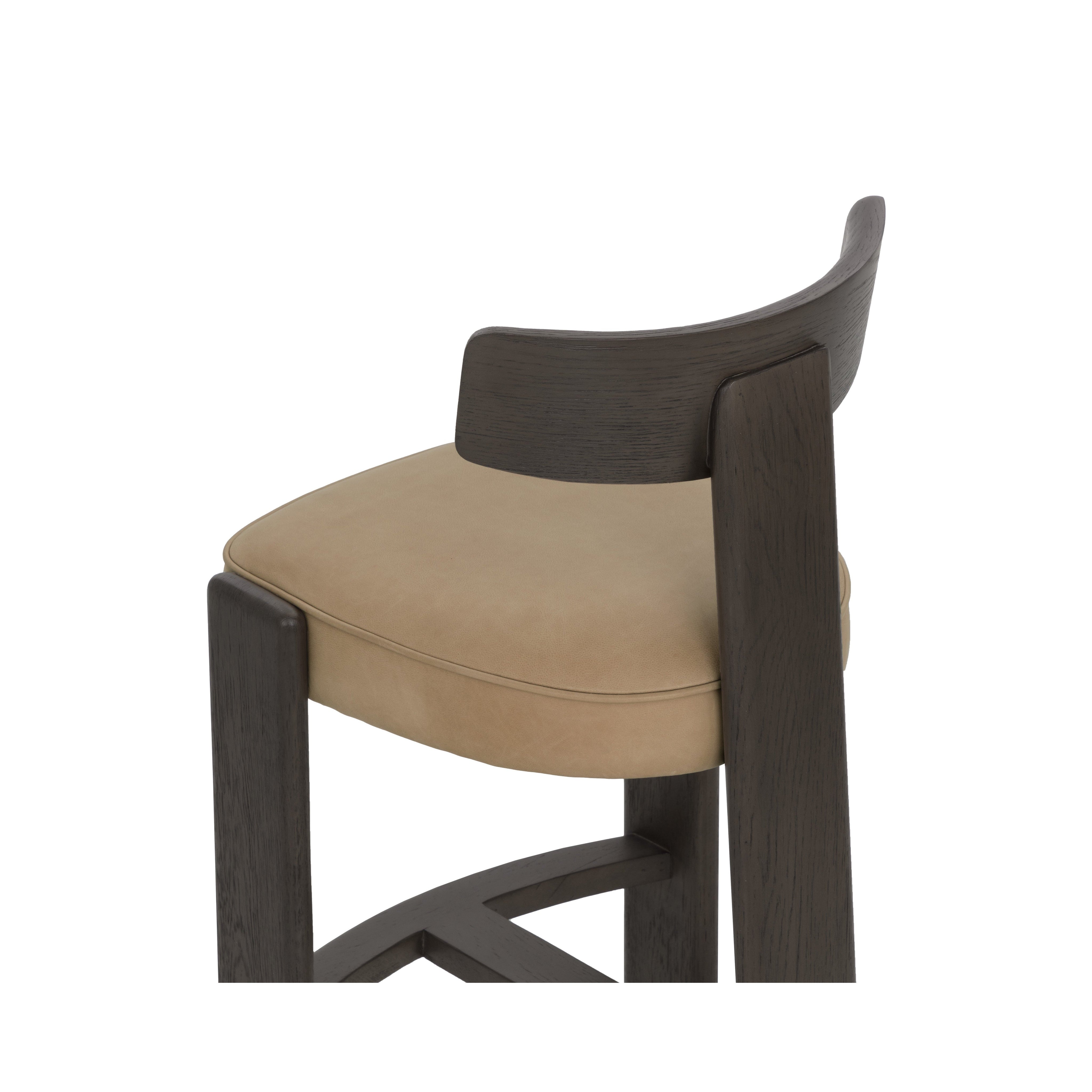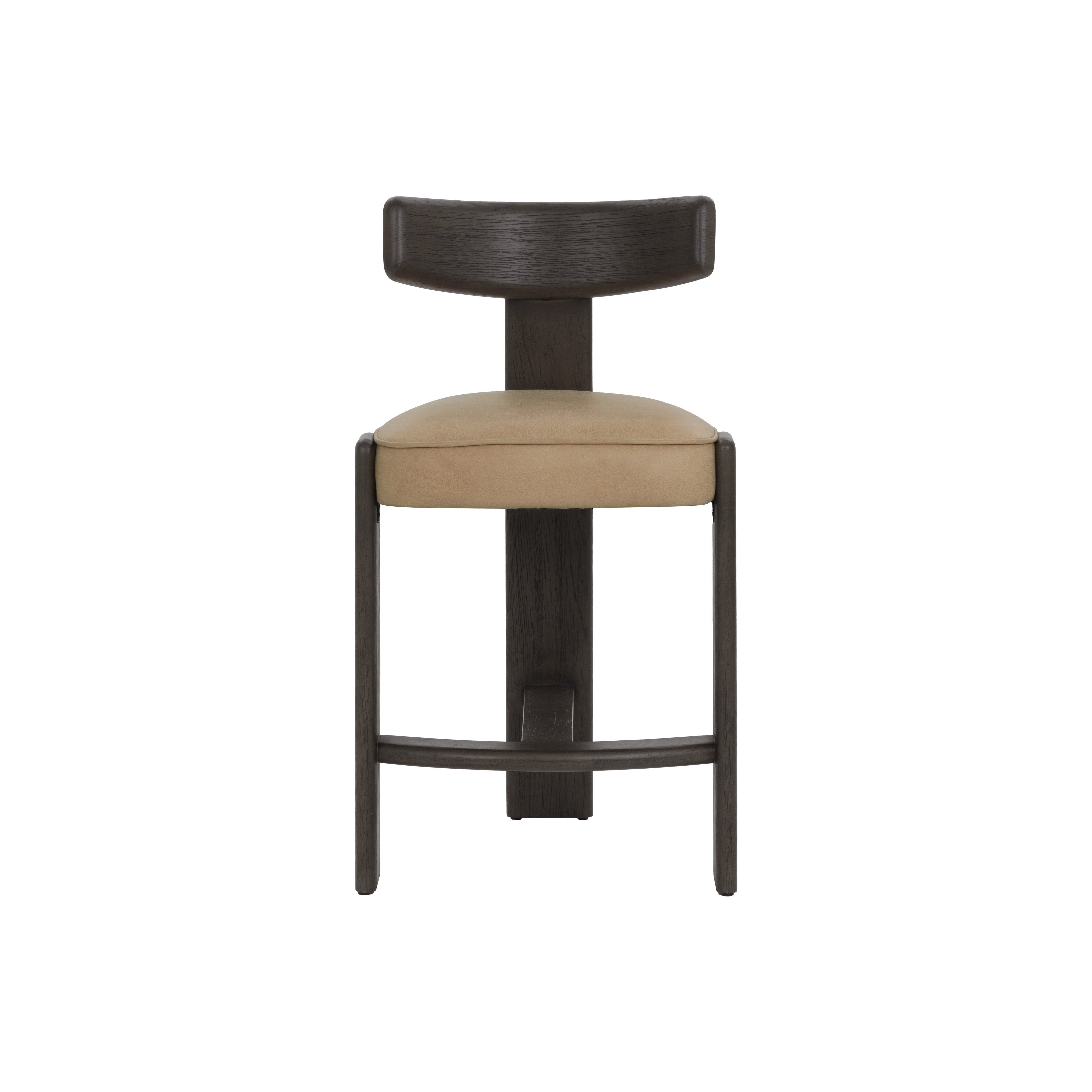 The Horton Counter Stool highlights the beauty of simplicity in contemporary design. A sculpted three-legged frame with a curved back constructed from dark brown oak wood embraces the comfort of a beautiful seat upholstered in our luxurious sahara sand top grain leather.