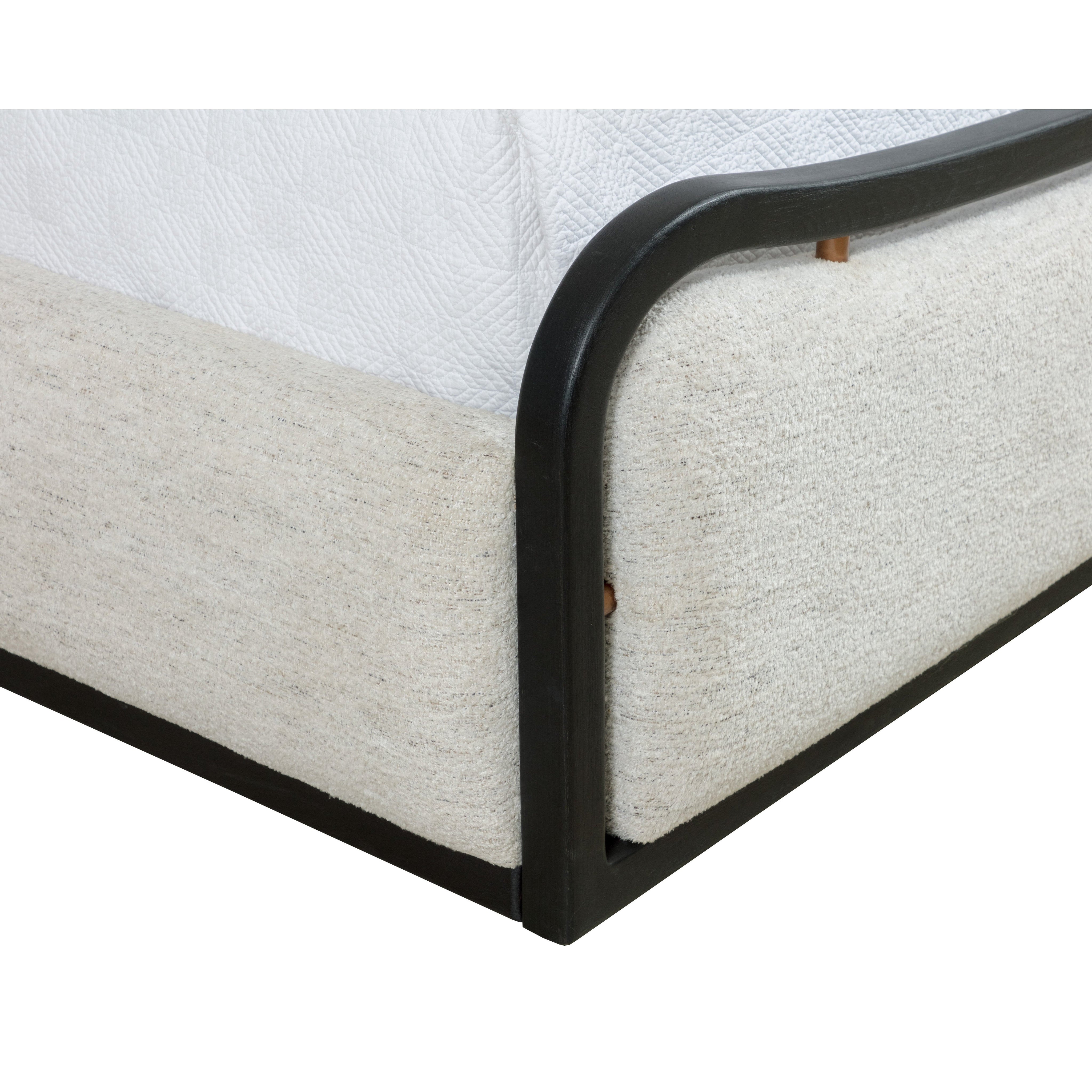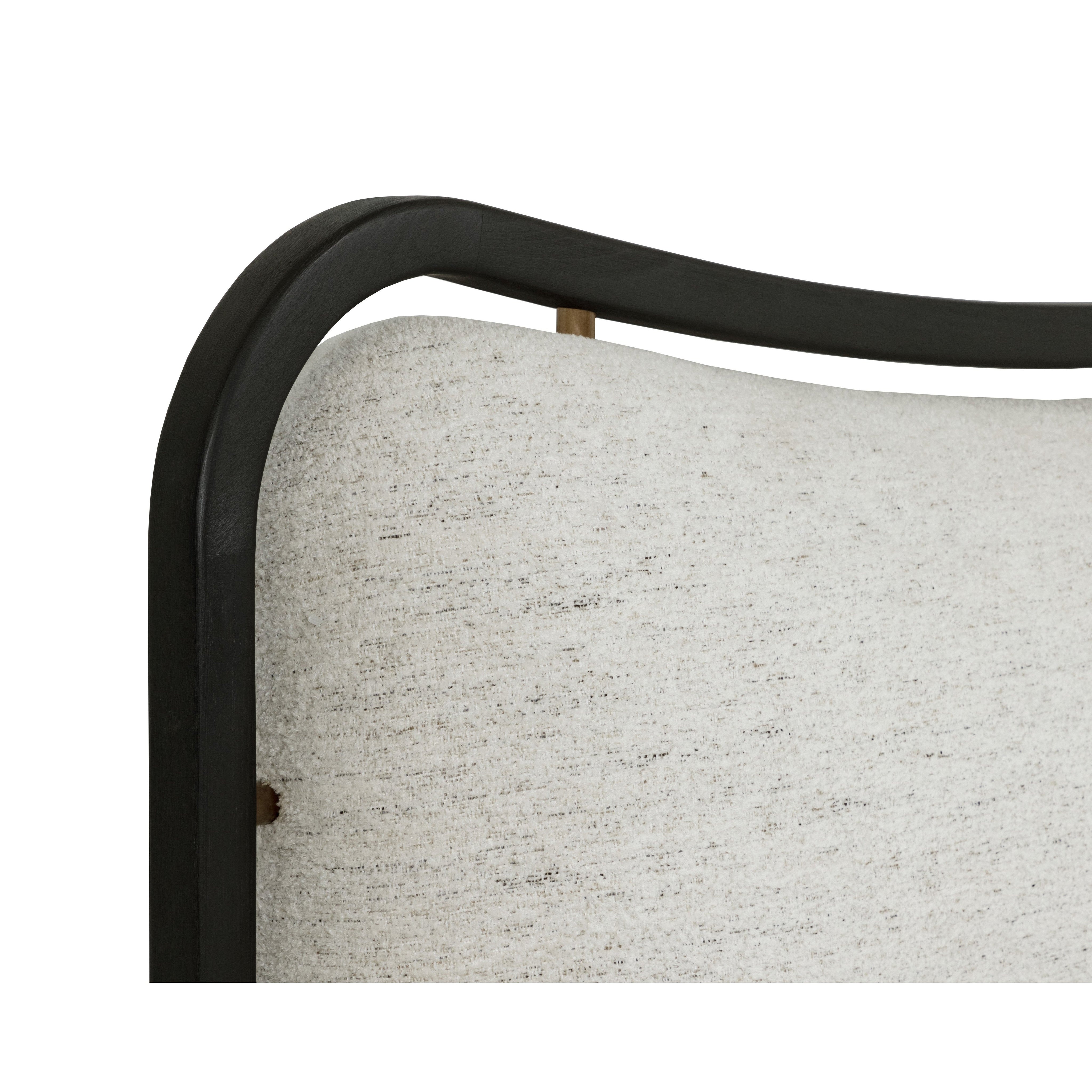 A subtle concave dip in both the headboard and footboard defines the sculptural profile of the Junia Bed. Upholstered in textured boucle, the frame is outlined in curved beech wood trim with decorative brushed gold metal connectors. This modern statement piece exudes versatile appeal for both residential and hospitality spaces.