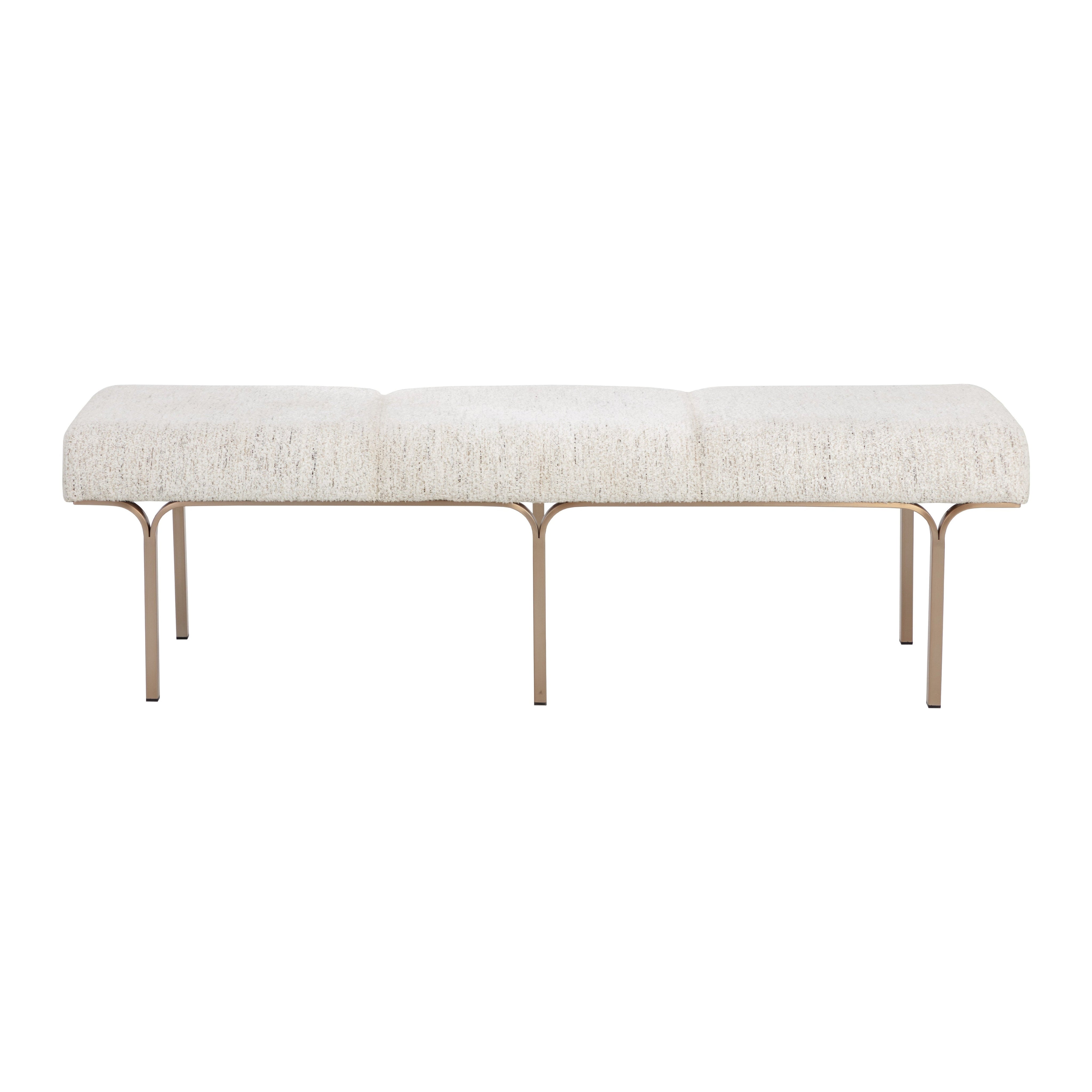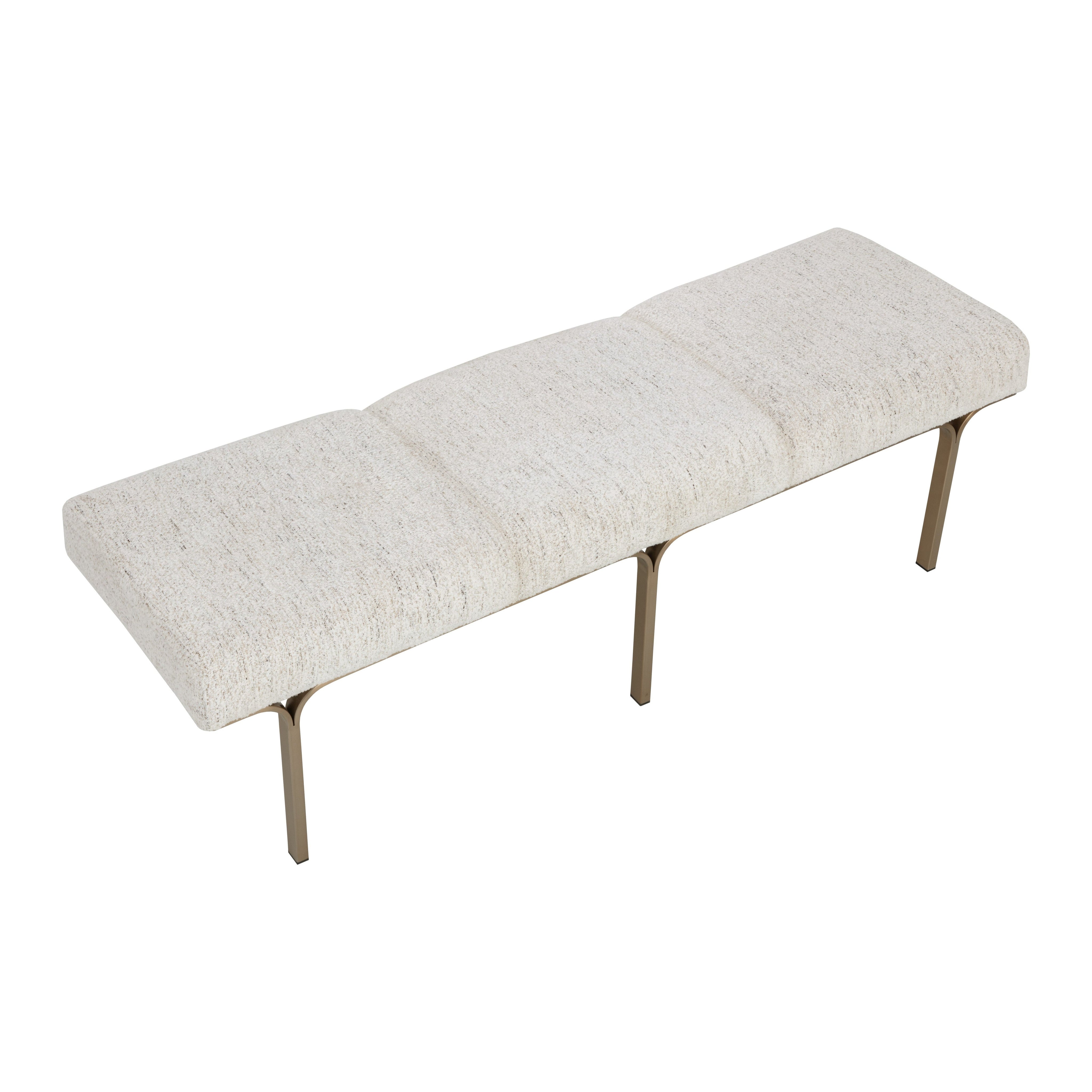 Defined by its slim metal frame and upholstered seat in textured hailey moon fabric, the Nuvella Bench offers a modern silhouette with subtle architectural influence. Its balanced design allows it to move easily between entryways, bedrooms, and dining areas, offering a stylish yet practical addition wherever it is placed.