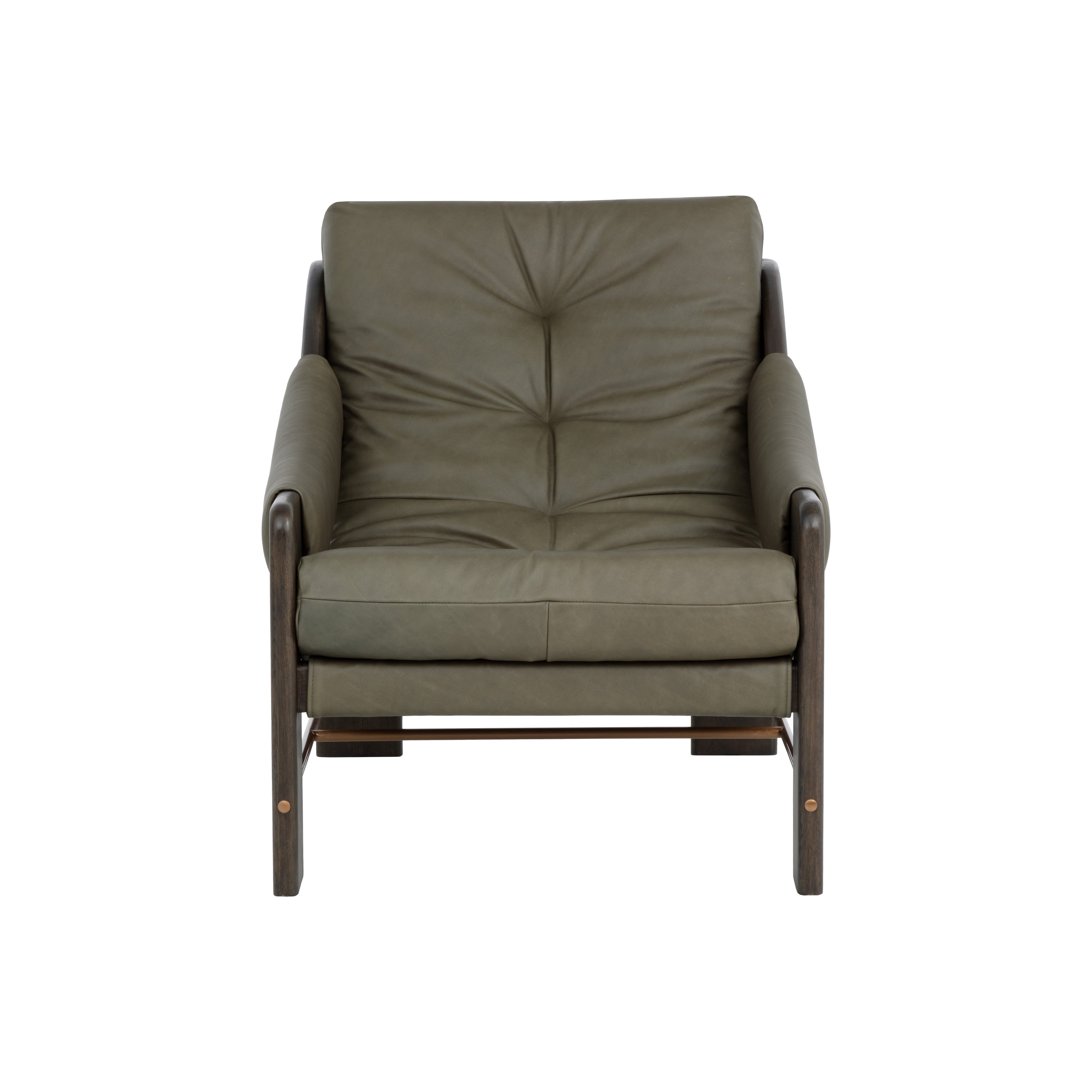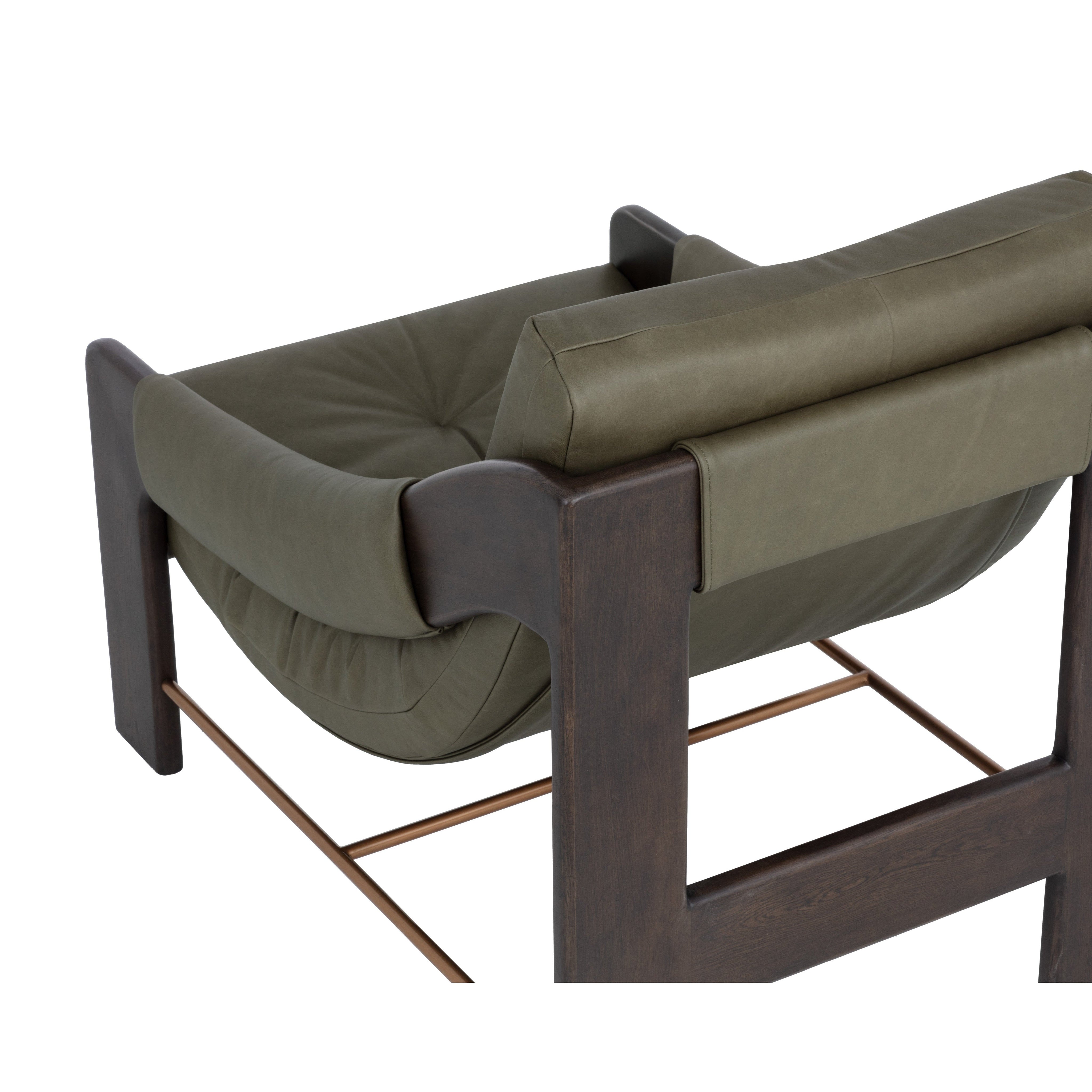 The Rafferty Lounge Chair is designed for unwinding. Draped in smooth ludlow dark olive leather, the reclined sling seat curves with gentle tufting that invites you to sink in. A solid oak wood frame provides structure, balanced by brushed gold steel stretchers below. Whether tucked into a quiet reading nook or placed beside a window, Rafferty becomes a natural companion for moments of pause.
