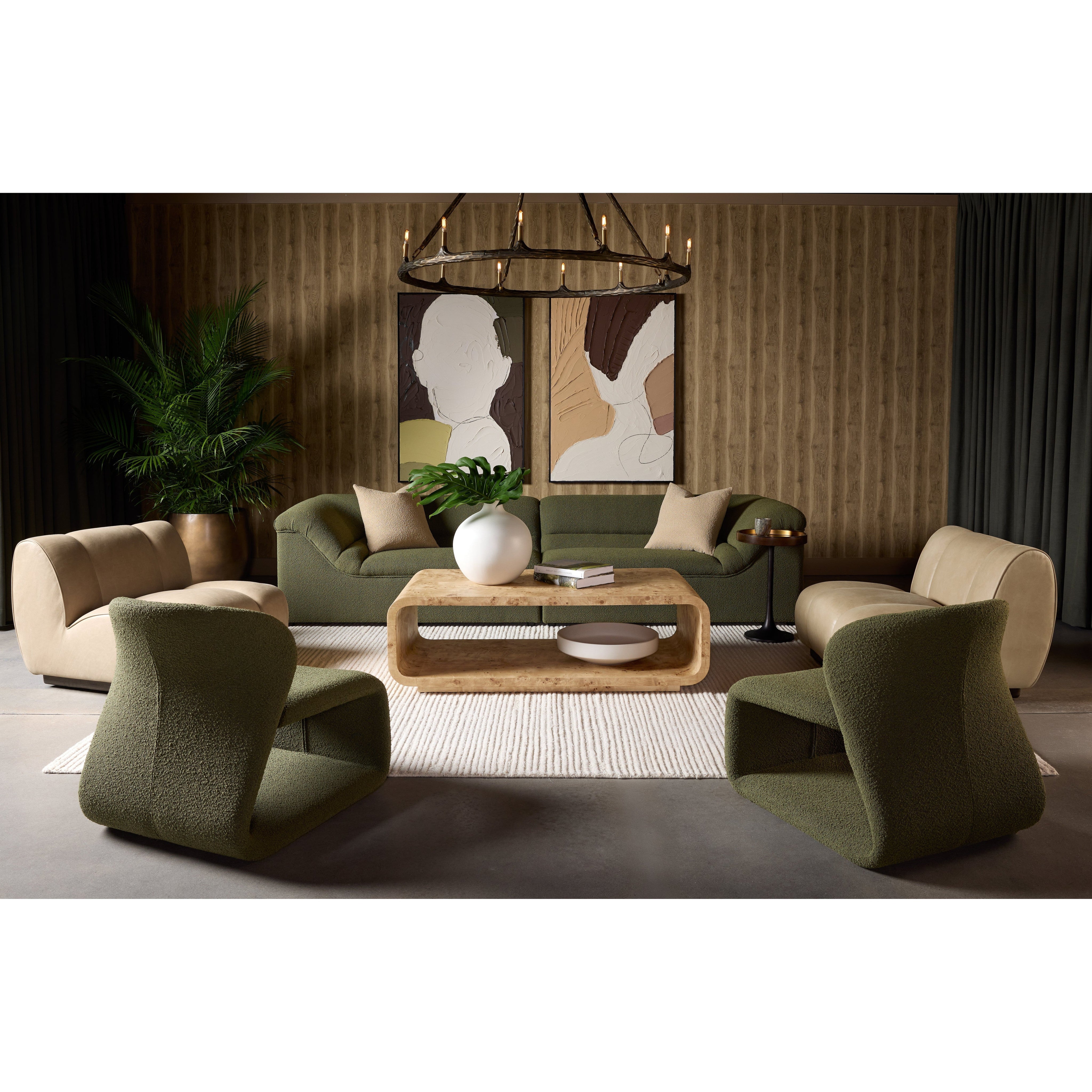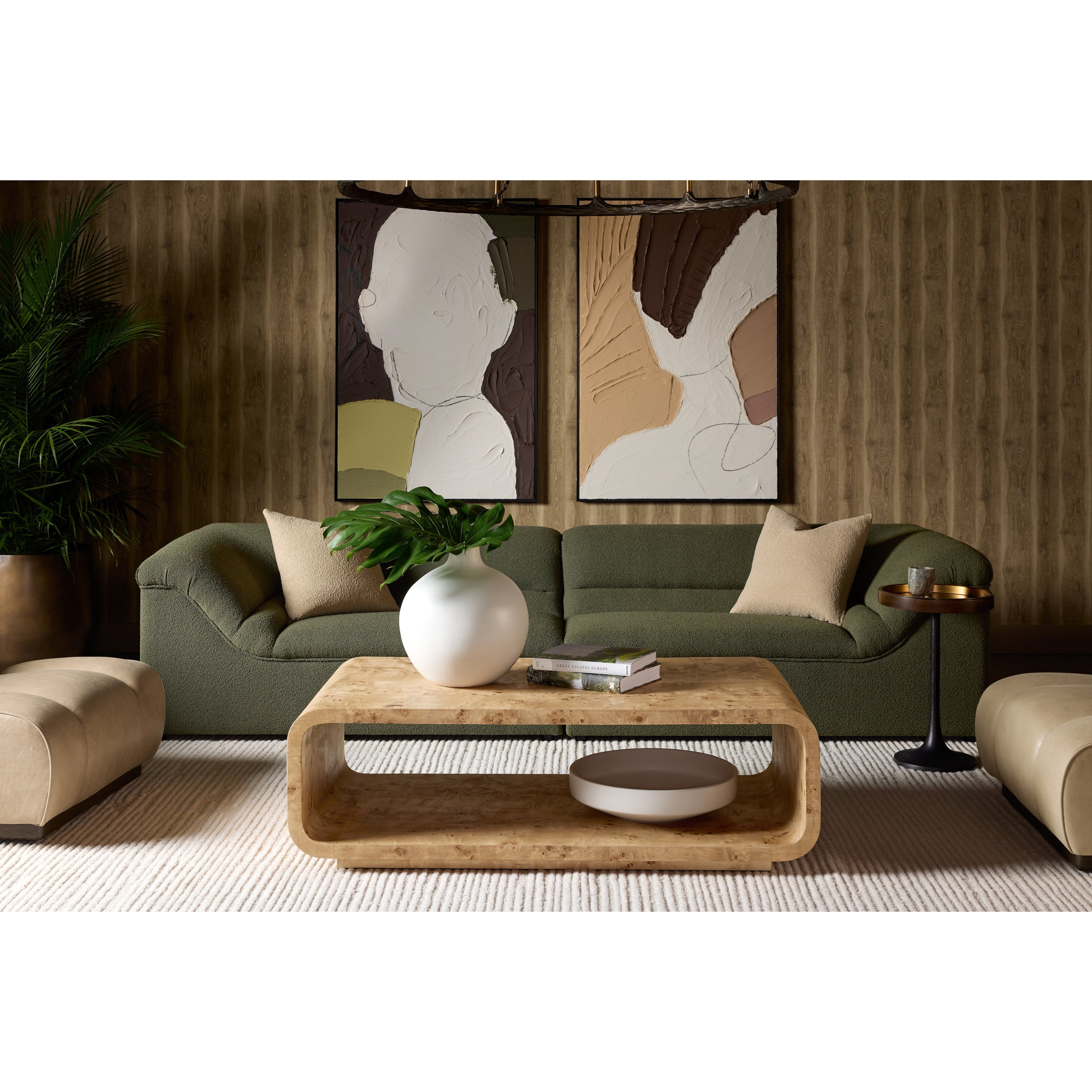 The Rowena Coffee Table is characterized by its smooth yet sculpted lines that are characteristic of modern design. Sleek and stylish, this burl veneer coffee table offers unique patterns that are inherent in burl veneer, providing an elevated shape and style.