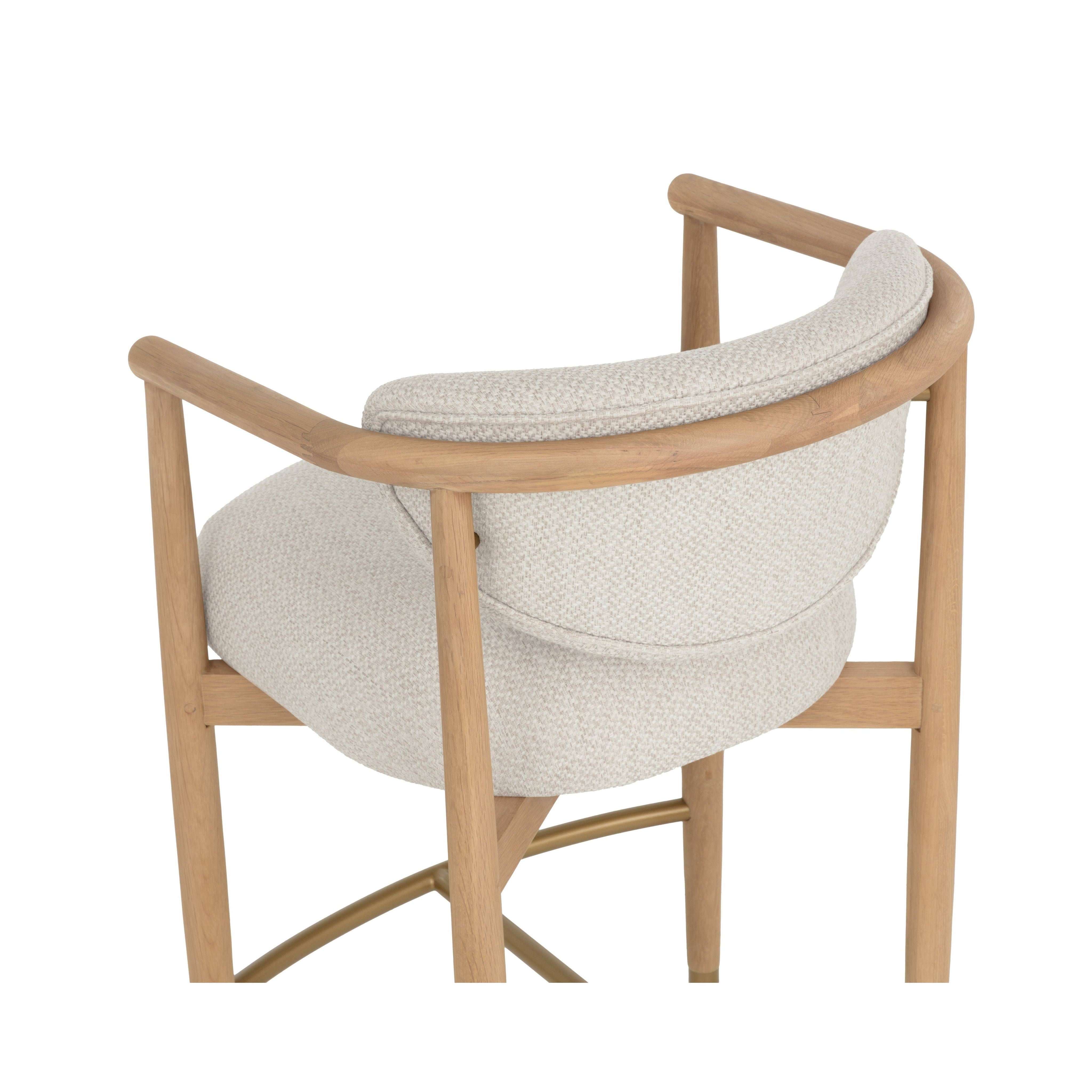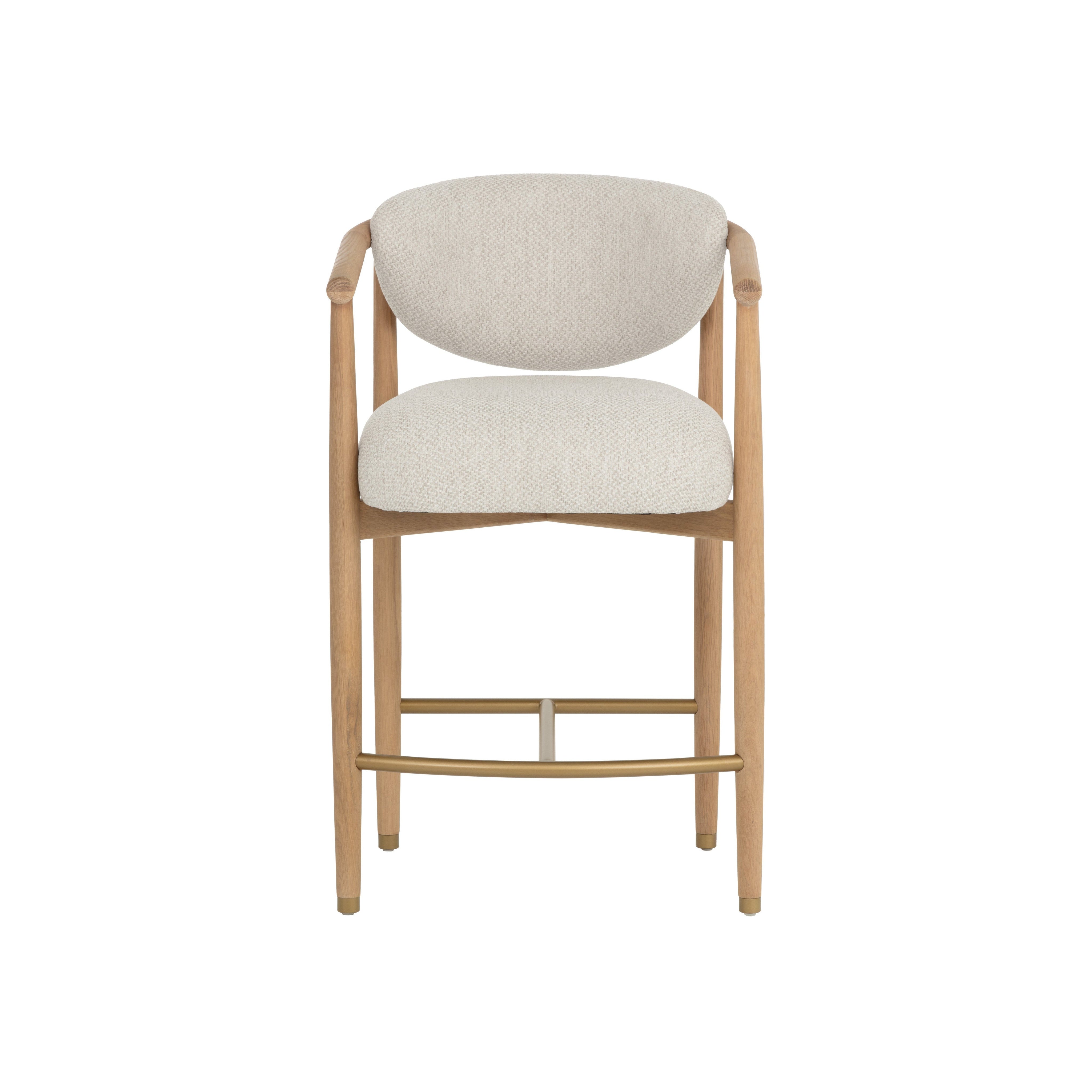 A study in poise and proportion, the Sigrid Counter Stool is designed for gathering in ease. Its rounded oak frame wraps gracefully around soft, stone-hued upholstery. A stainless steel stretcher and feet caps complete the frame, adding a beautiful contrast against the warmth of the oak.