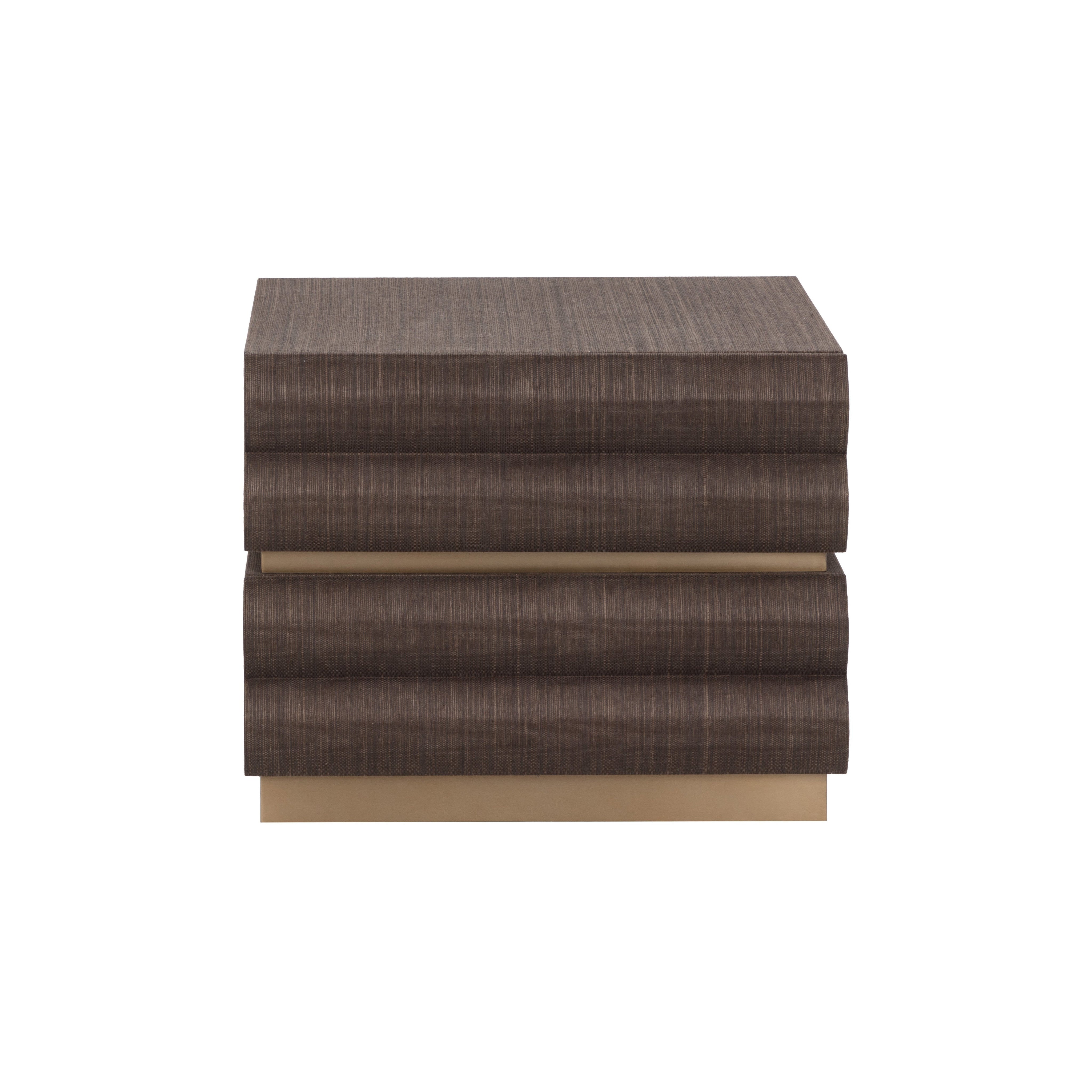 The Subira Nightstand brings sculptural detail to the bedroom with its tiered drawer fronts, crafted from rubberwood and wrapped in chocolate raffia for a textured finish. Resting on a golden stainless steel base, the design is elevated by a subtle metallic sheen. Its two spacious drawers open to reveal velvet-lined interiors, combining practicality with a tactile finish.
