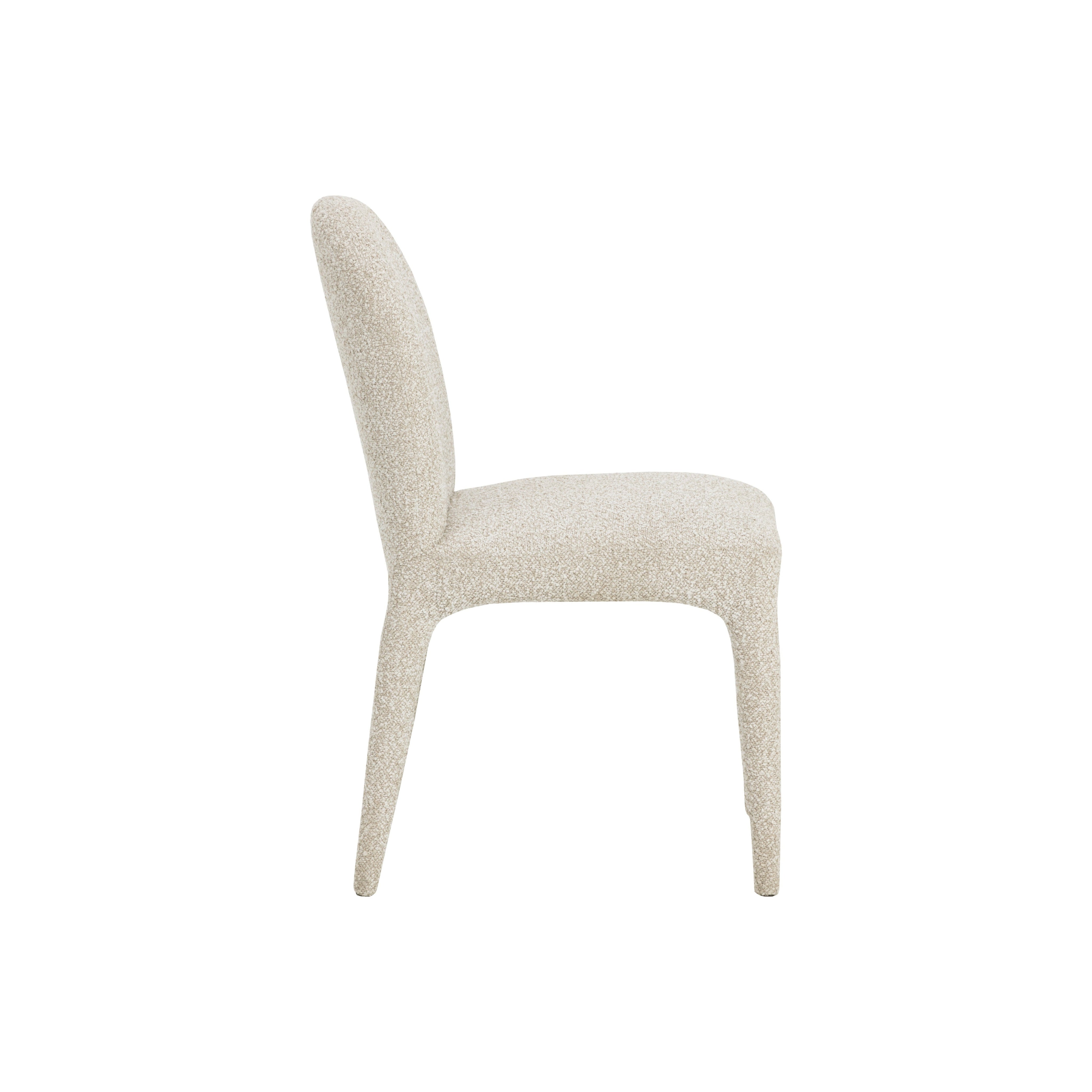 The Tamina Dining Chair is defined by its tonal silhouette, fully wrapped in textured santa cruz oatmeal fabric for a seamless, sculptural look. Its gently rounded back and smooth curves bring a sense of softness to the design, while the fabric introduces a distinct texture that enhances its contemporary appeal.