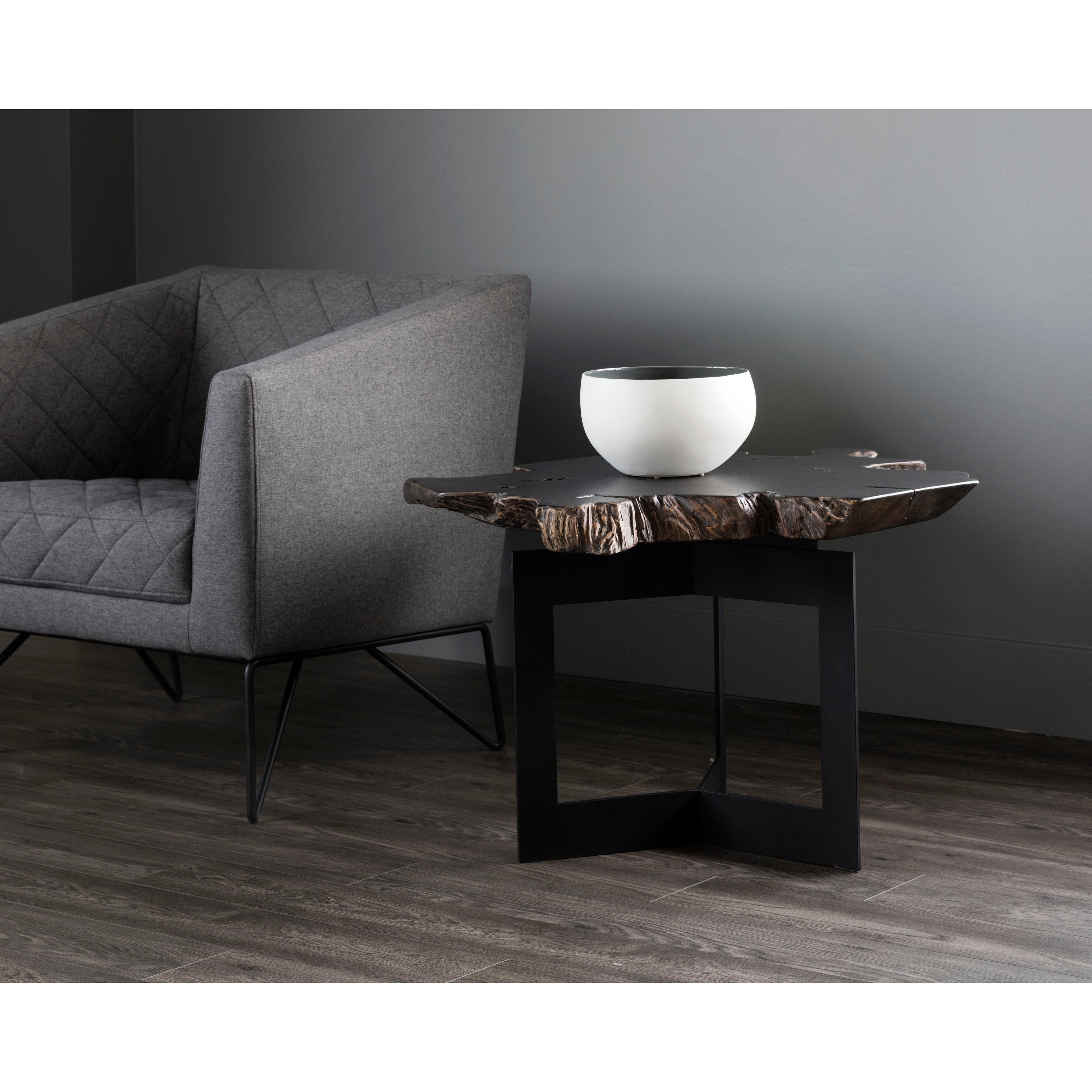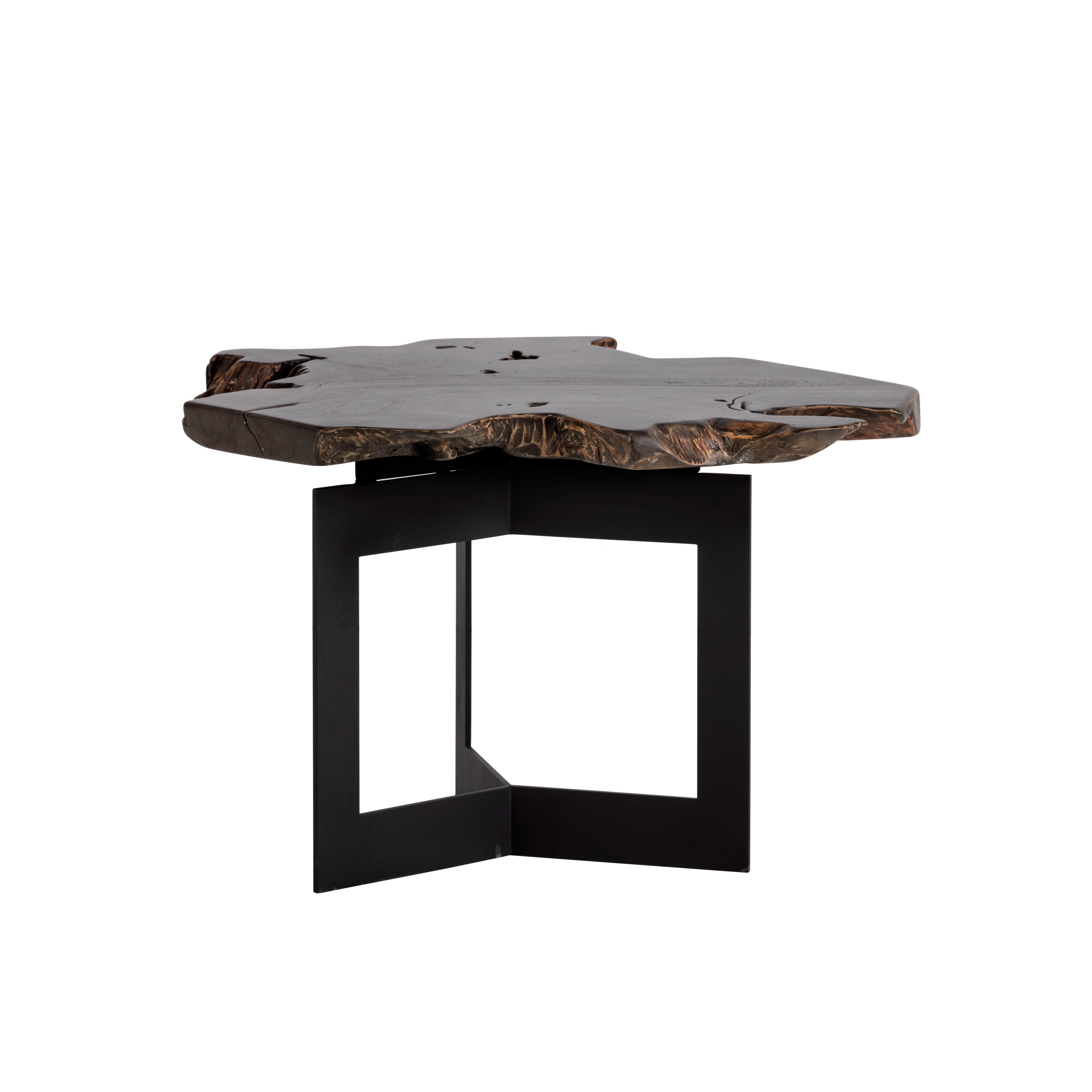 Bold and impressive, this end table will elevate the design of contract and residential spaces. Made in Indonesia from solid teak root wood painted black, with each piece uniquely varying in shape and size. Finished with a sturdy black steel frame. Can be grouped together with the Wyatt Coffee Table for added dimension. As wood is an organic, porous material, these pieces will contain natural variation of texture and may also exhibit fine indentations and cracks. Wood pieces will also display a disparity of colour and grain, and visible knots and burls that add to the character of each piece.