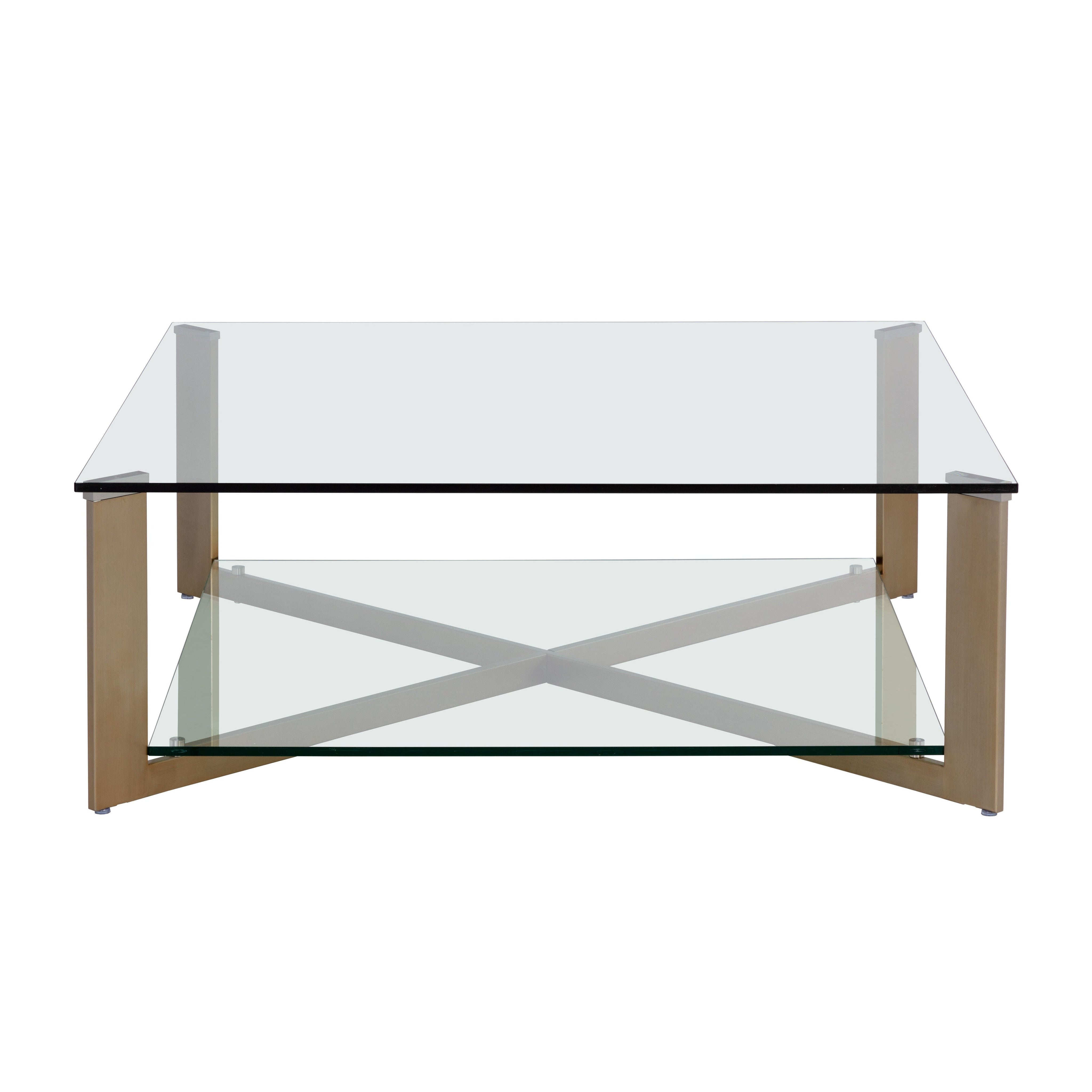A sleek and modern square coffee table. Made with a tempered glass top and bottom shelf perfect for displaying decor and accents. Finished with an antique brass stainless steel frame. Also available in a rectangle shape, along with coordinating end table.