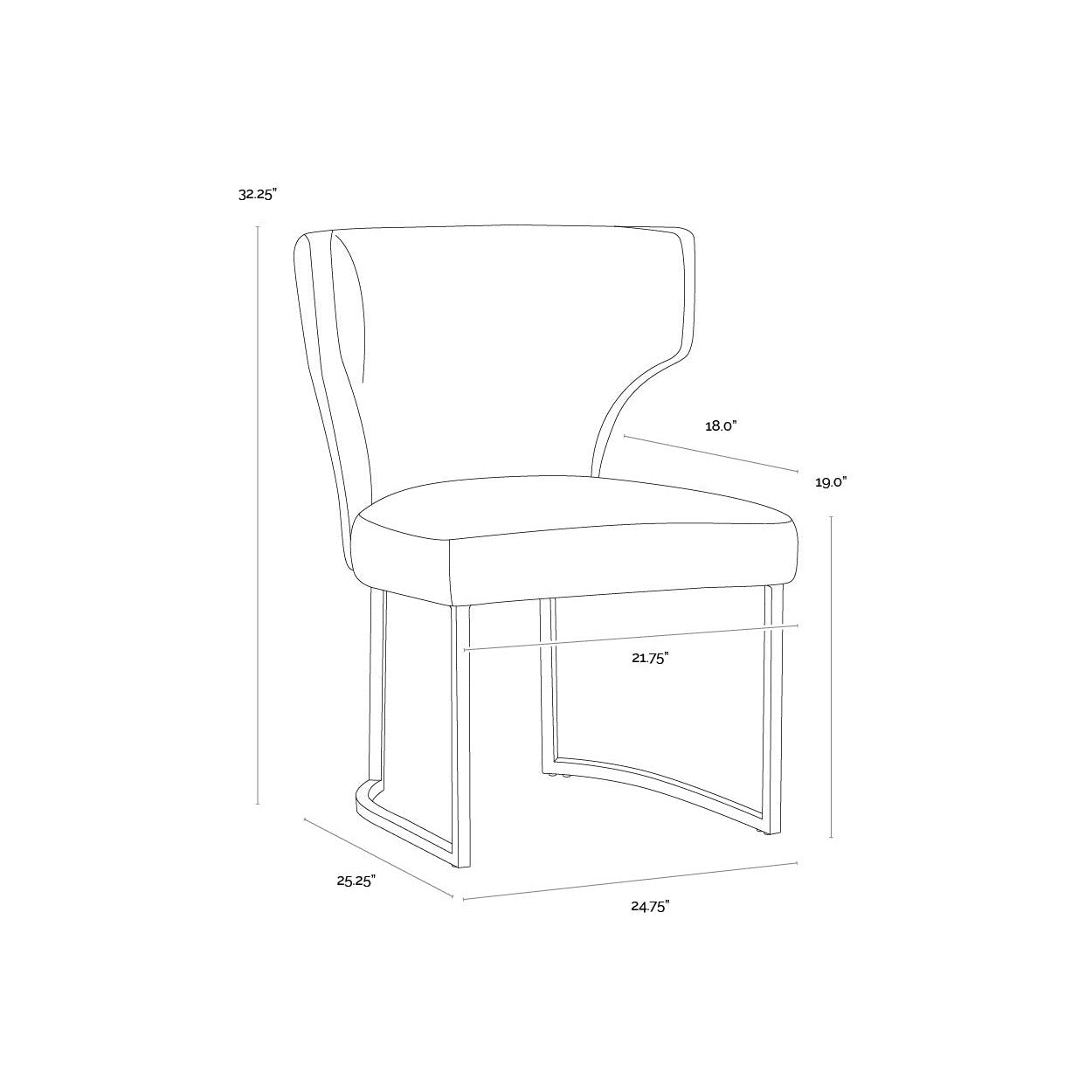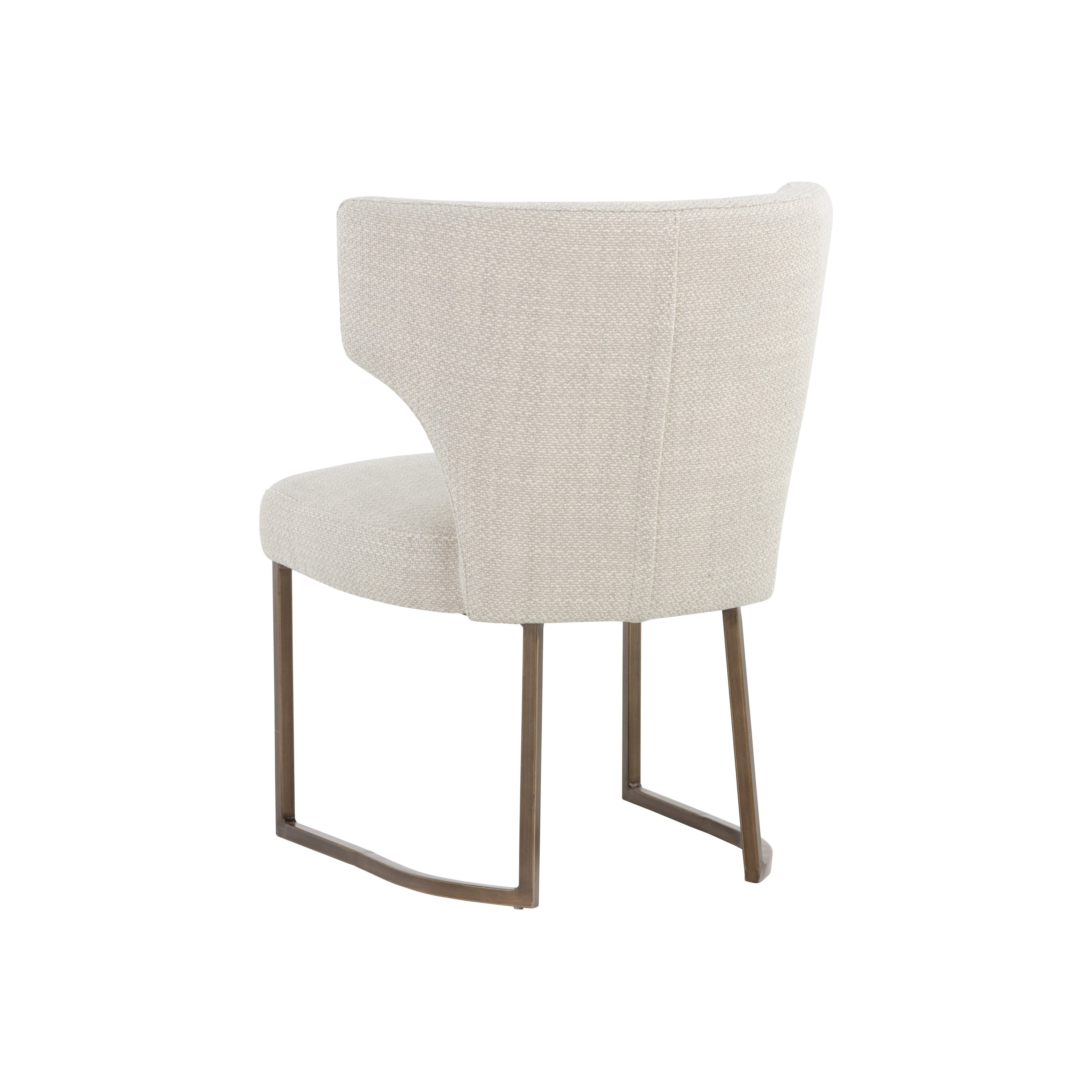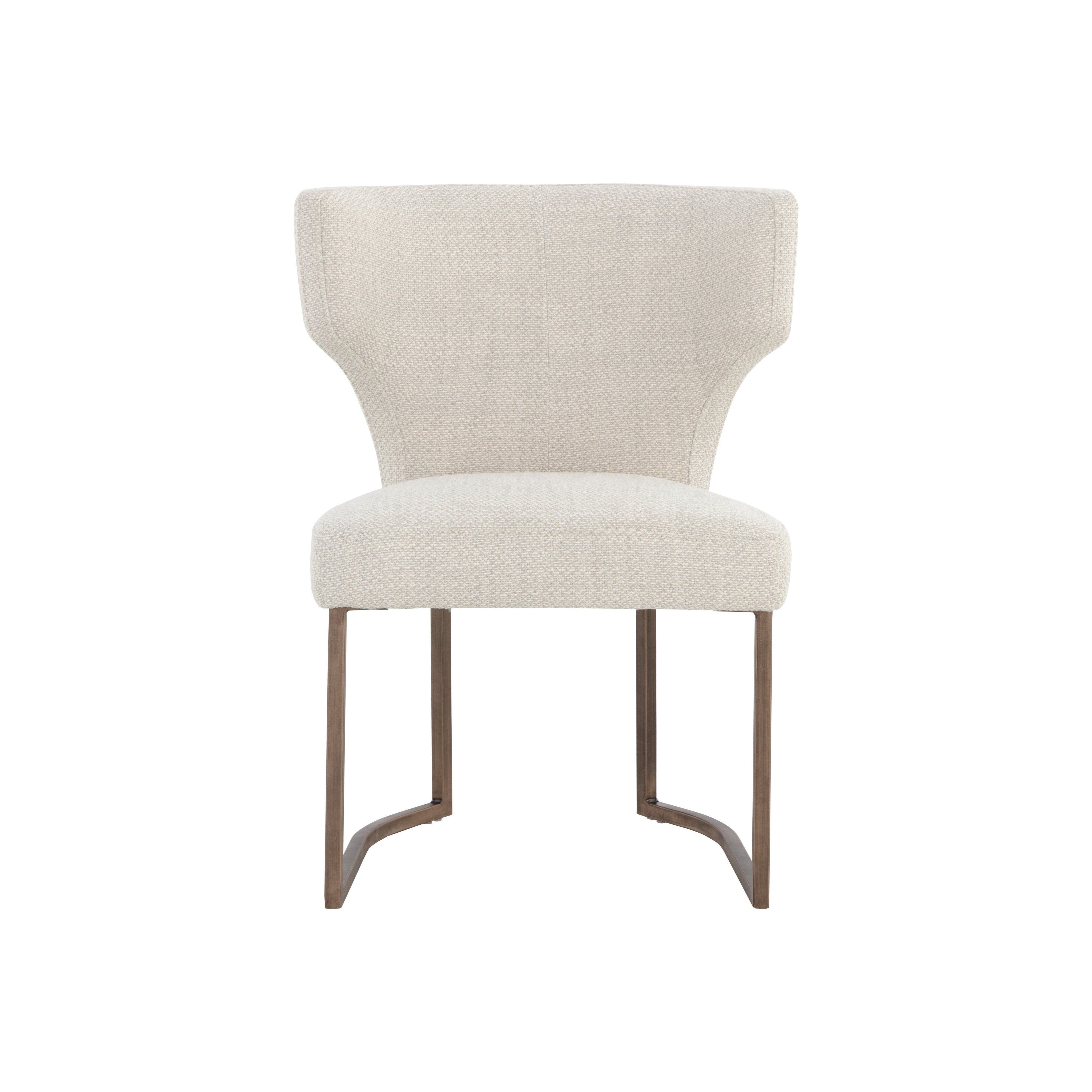 This unique take on a wingback dining chair is elegant and stylish. Curved antique brass stainless steel legs create additional glamour. Stocked in moto stucco performance fabric. Performance fabric is moisture repellent, durable and easy to clean.