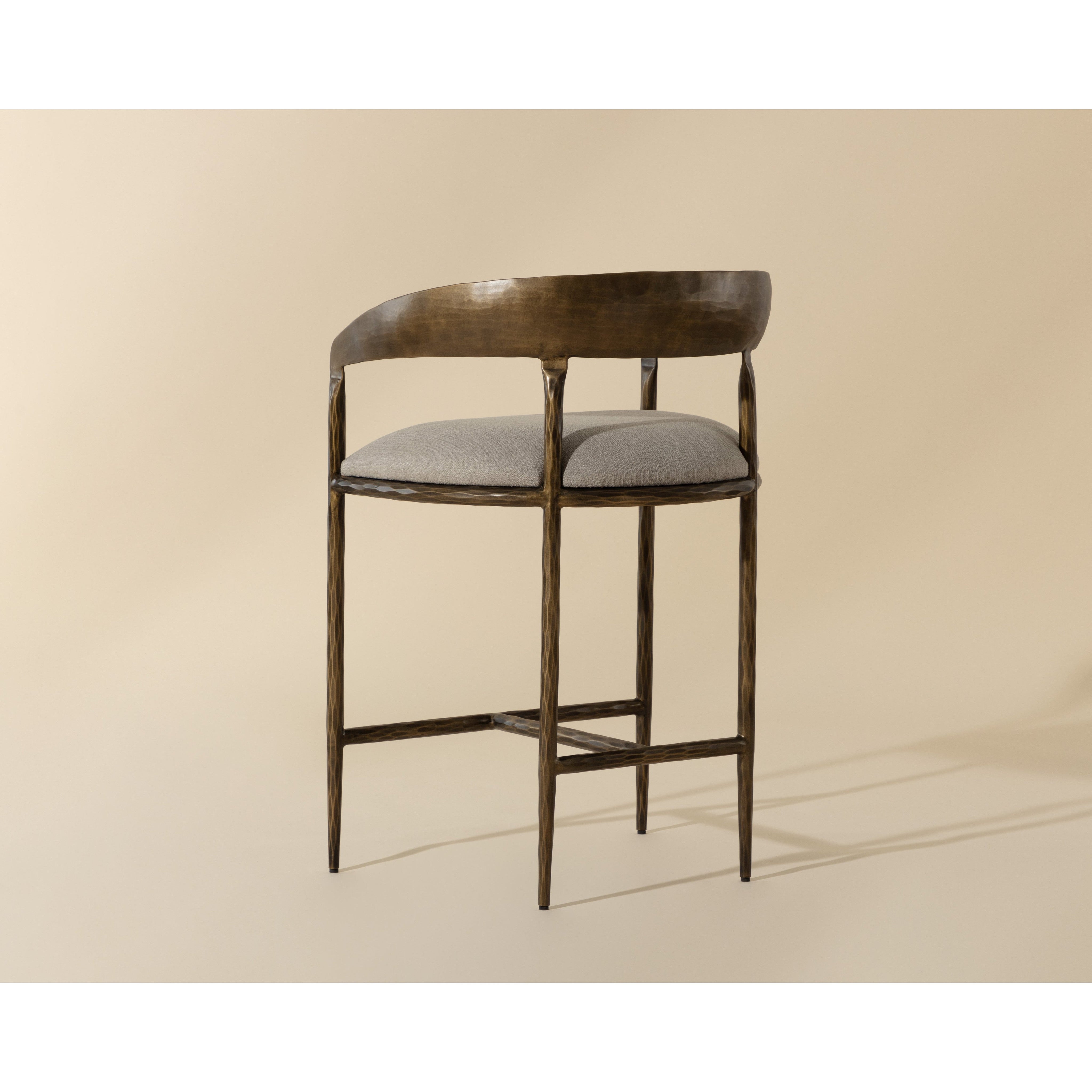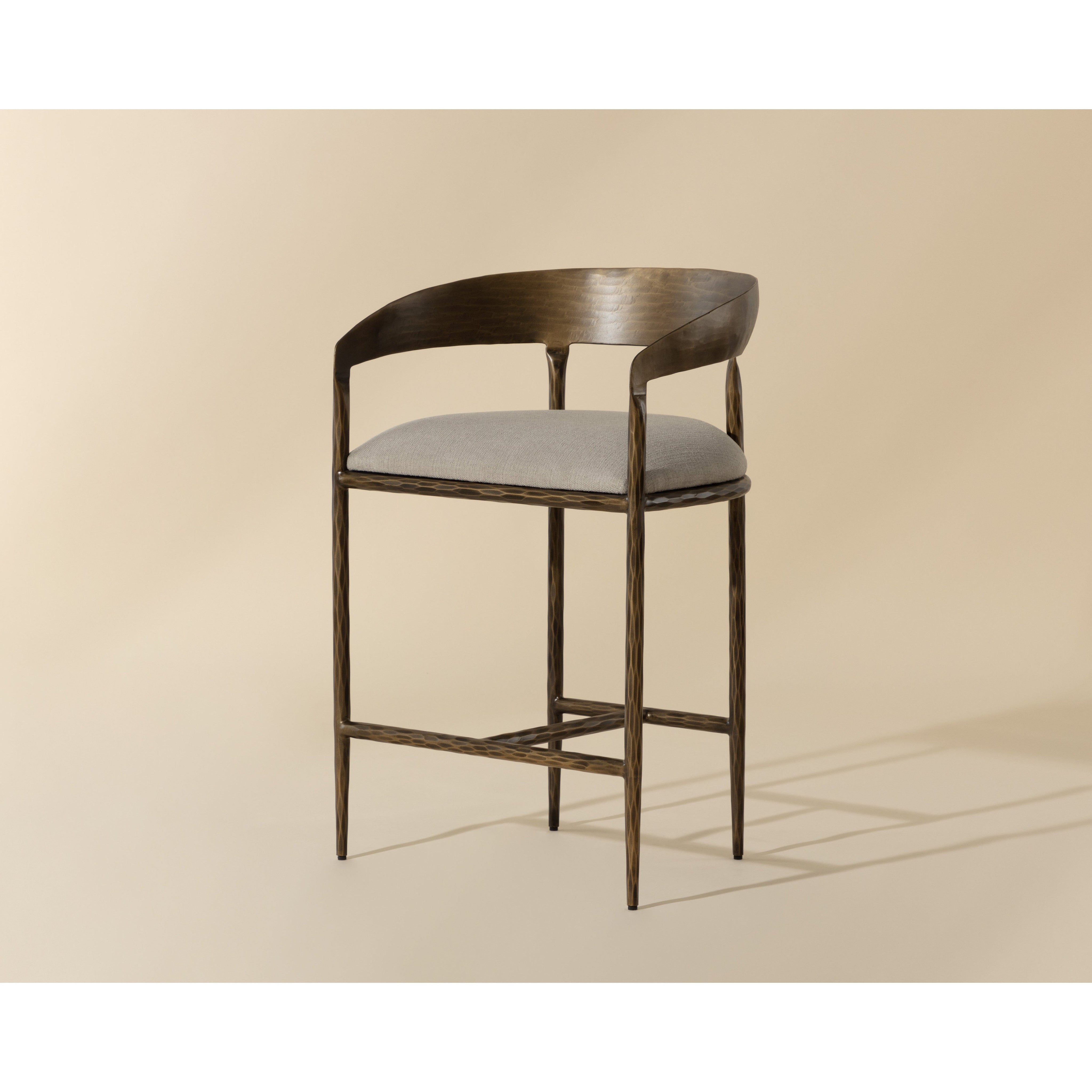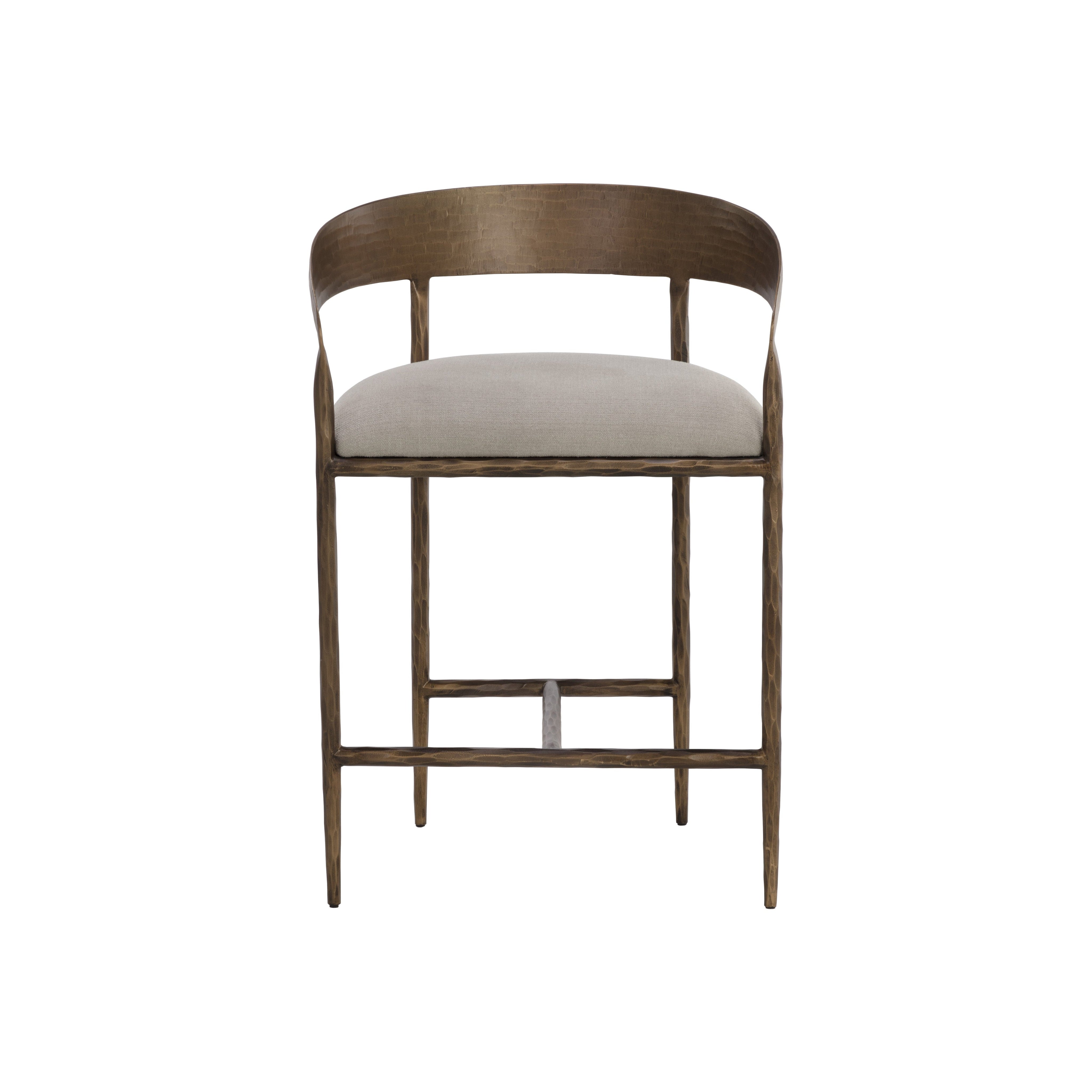 The Zanatta Counter Stool is all about the subtle details. The hammered metal detailing in the antique brass curved frame provides visual interest that will stand out in any dining space. A comfortable seat upholstered in our zenith taupe grey performance fabric completes the look. Performance fabric is moisture repellent, durable and easy to clean. Made in India. With refined craftsmanship, this design was brought to life by skilled local artisans. Due to the nature of handcraftsmanship, unique imperfections such as fissures, markings and variations in colour and shape are welcomed and appreciated characteristics for a truly one-of-a-kind piece.