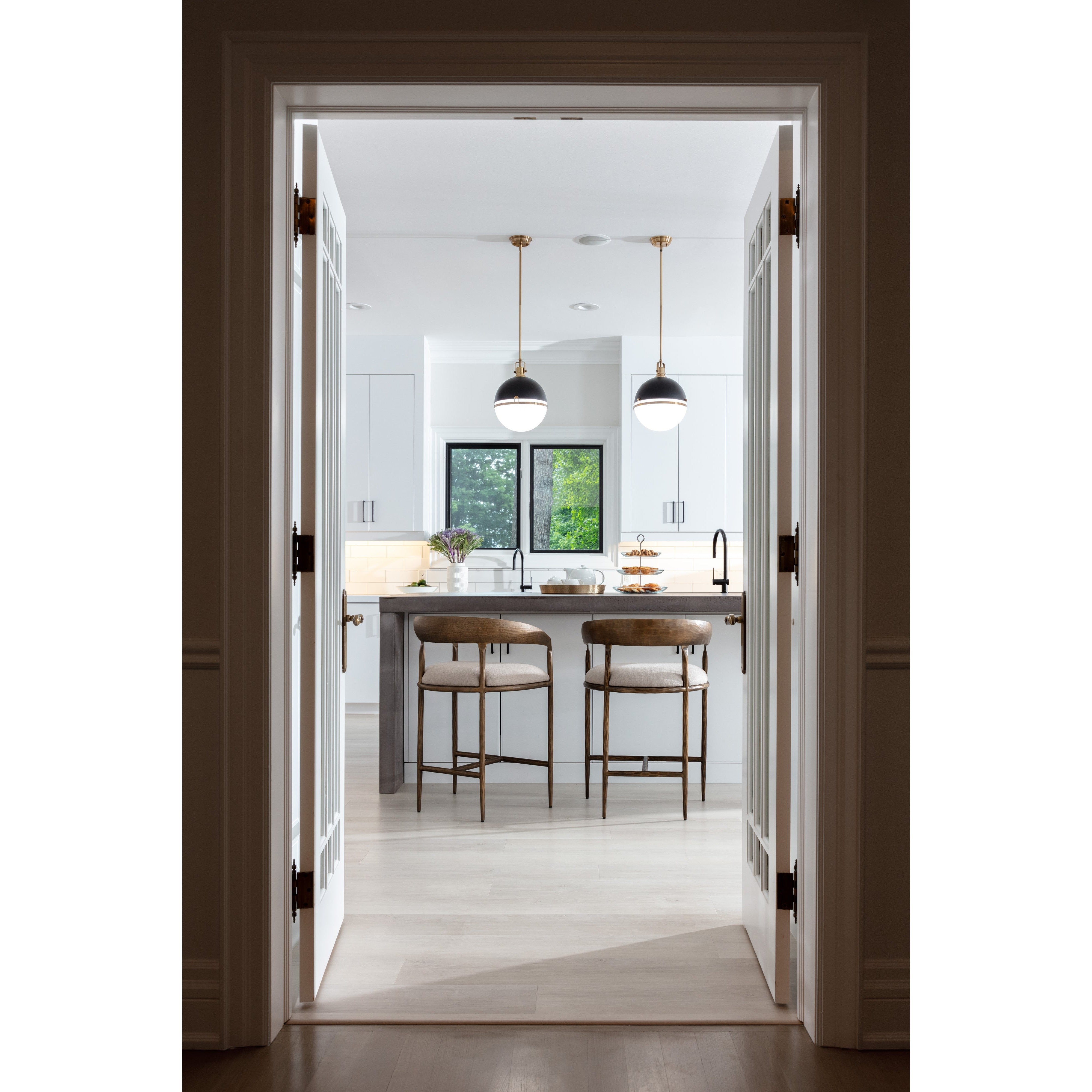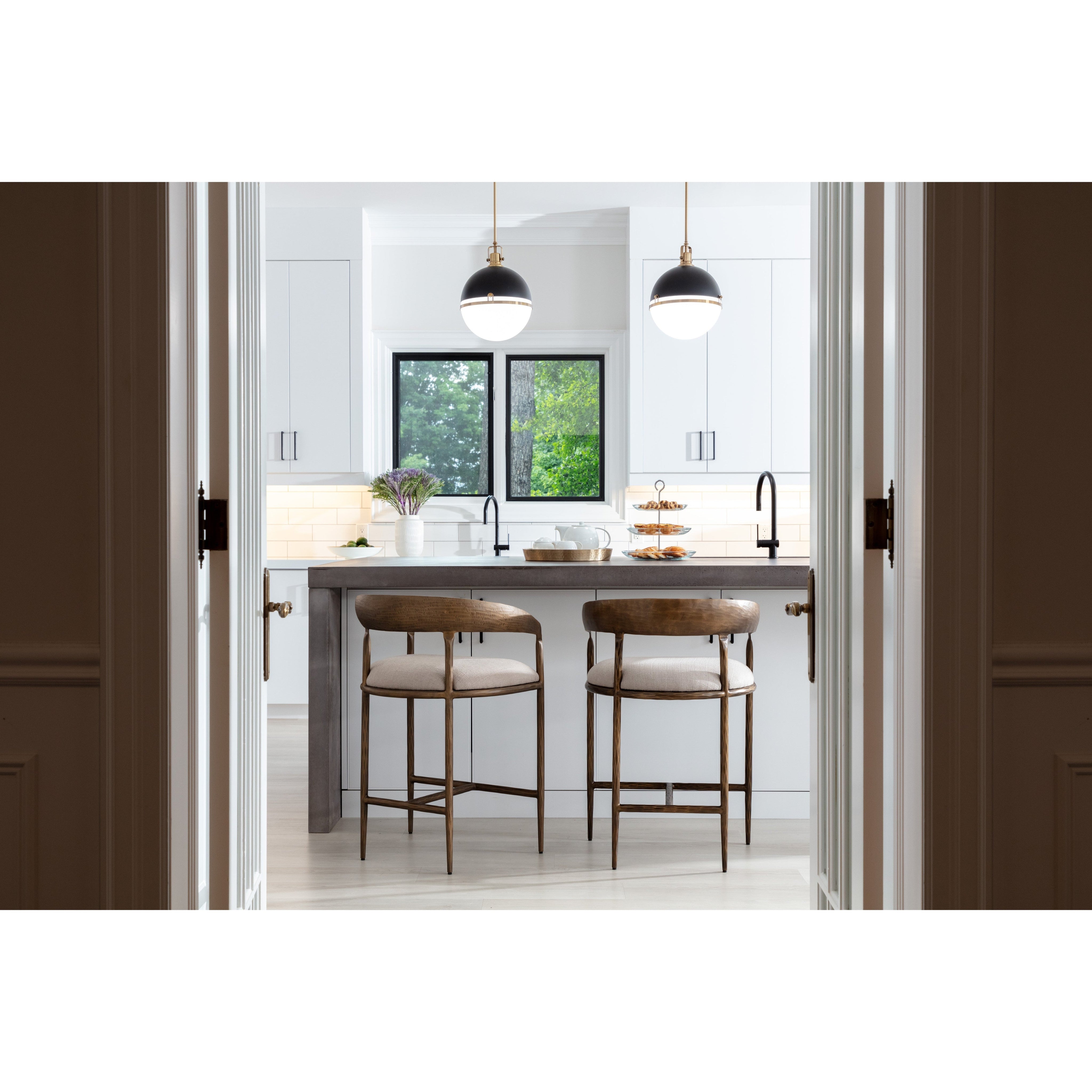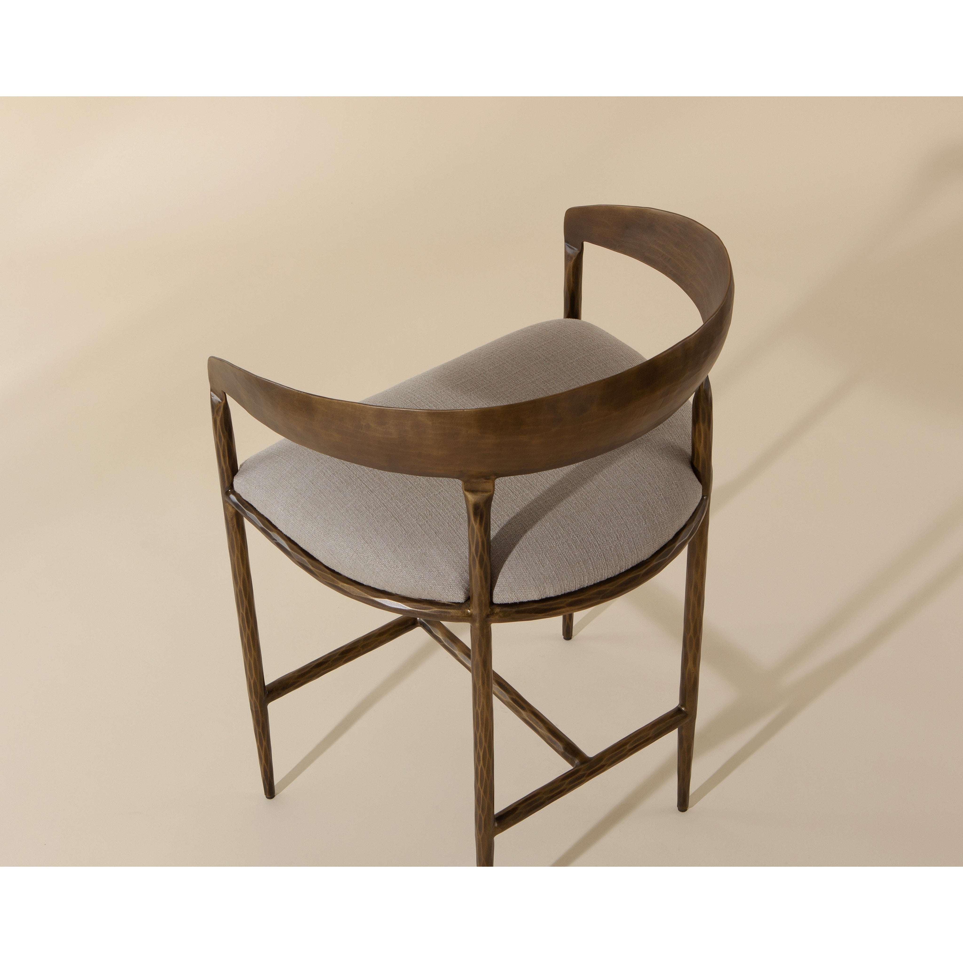 The Zanatta Counter Stool is all about the subtle details. The hammered metal detailing in the antique brass curved frame provides visual interest that will stand out in any dining space. A comfortable seat upholstered in our zenith taupe grey performance fabric completes the look. Performance fabric is moisture repellent, durable and easy to clean. Made in India. With refined craftsmanship, this design was brought to life by skilled local artisans. Due to the nature of handcraftsmanship, unique imperfections such as fissures, markings and variations in colour and shape are welcomed and appreciated characteristics for a truly one-of-a-kind piece.