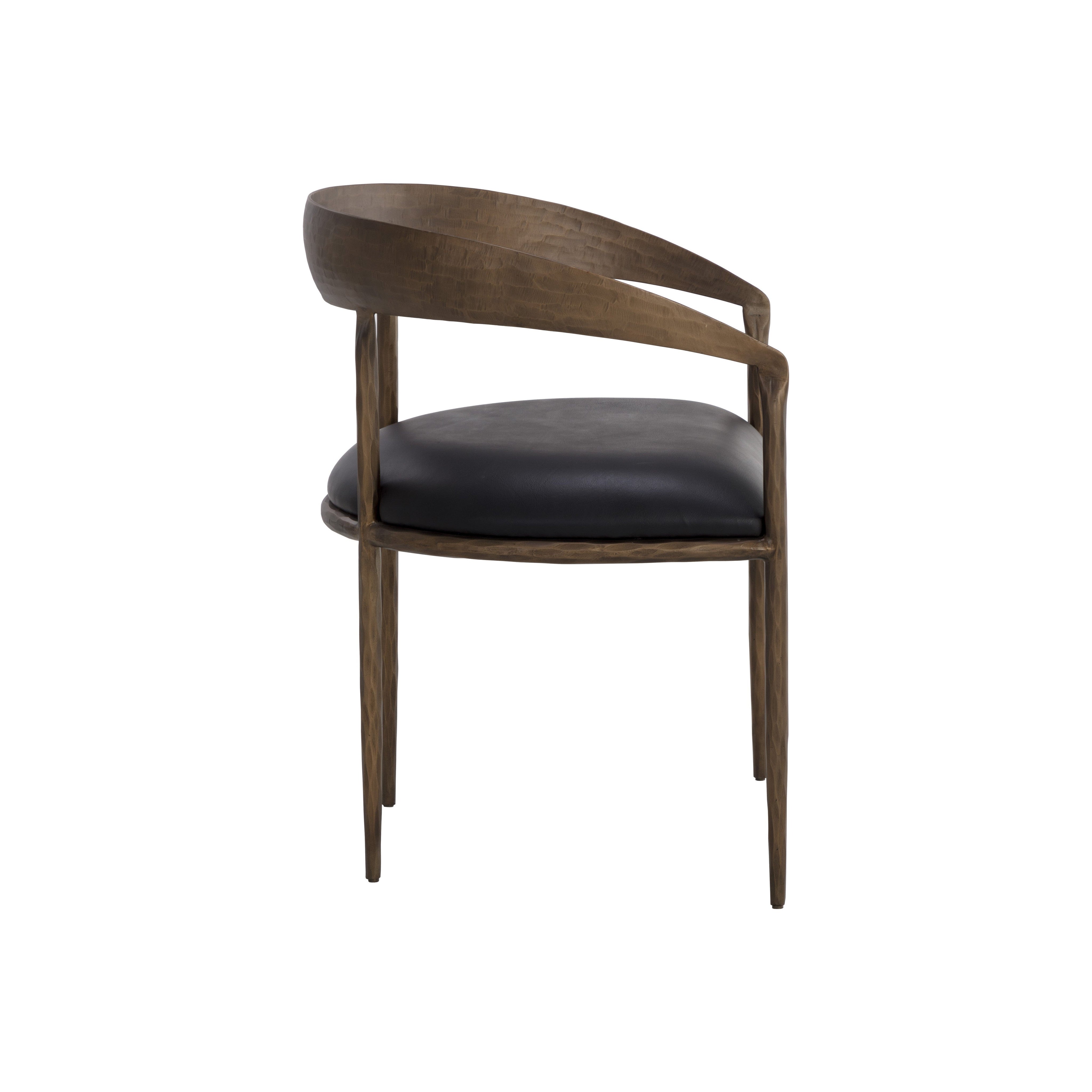 The Zanatta Dining Armchair is all about the subtle details. The hammered metal detailing in the antique brass curved frame provides visual interest that will stand out in any dining space. A charcoal black leather seat completes the look. Handle with Care: This design has been crafted with 100% leather. Leather is a natural material; as such, colour variations, markings, wrinkles, grooves and light scratches are acceptable and appreciated characteristics. No two pieces are alike. Visit our Product Care page for more information on how to ensure the lasting beauty of this piece. Made in India. With refined craftsmanship, this design was brought to life by skilled local artisans. Due to the nature of handcraftsmanship, unique imperfections such as fissures, markings and variations in colour and shape are welcomed and appreciated characteristics for a truly one-of-a-kind piece.