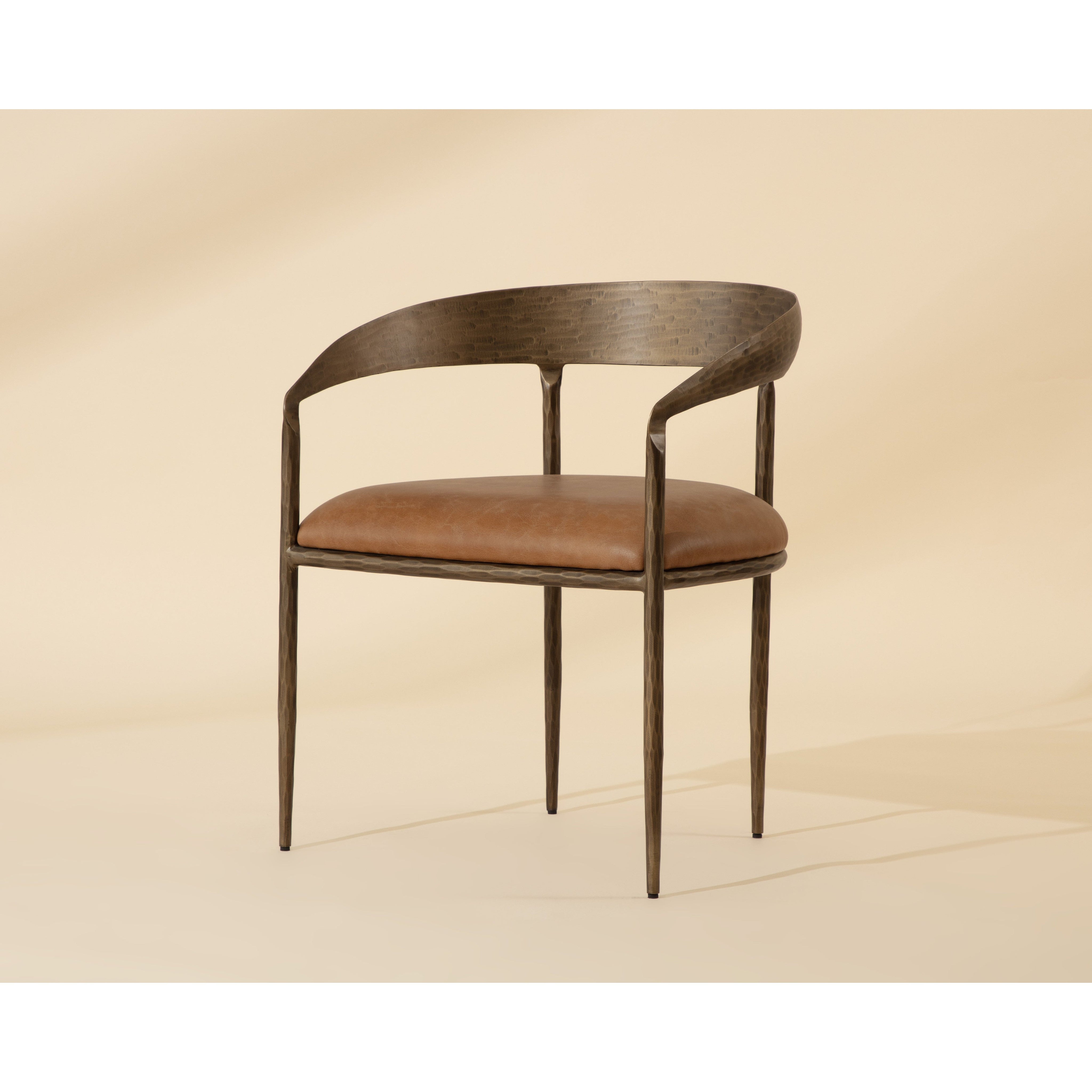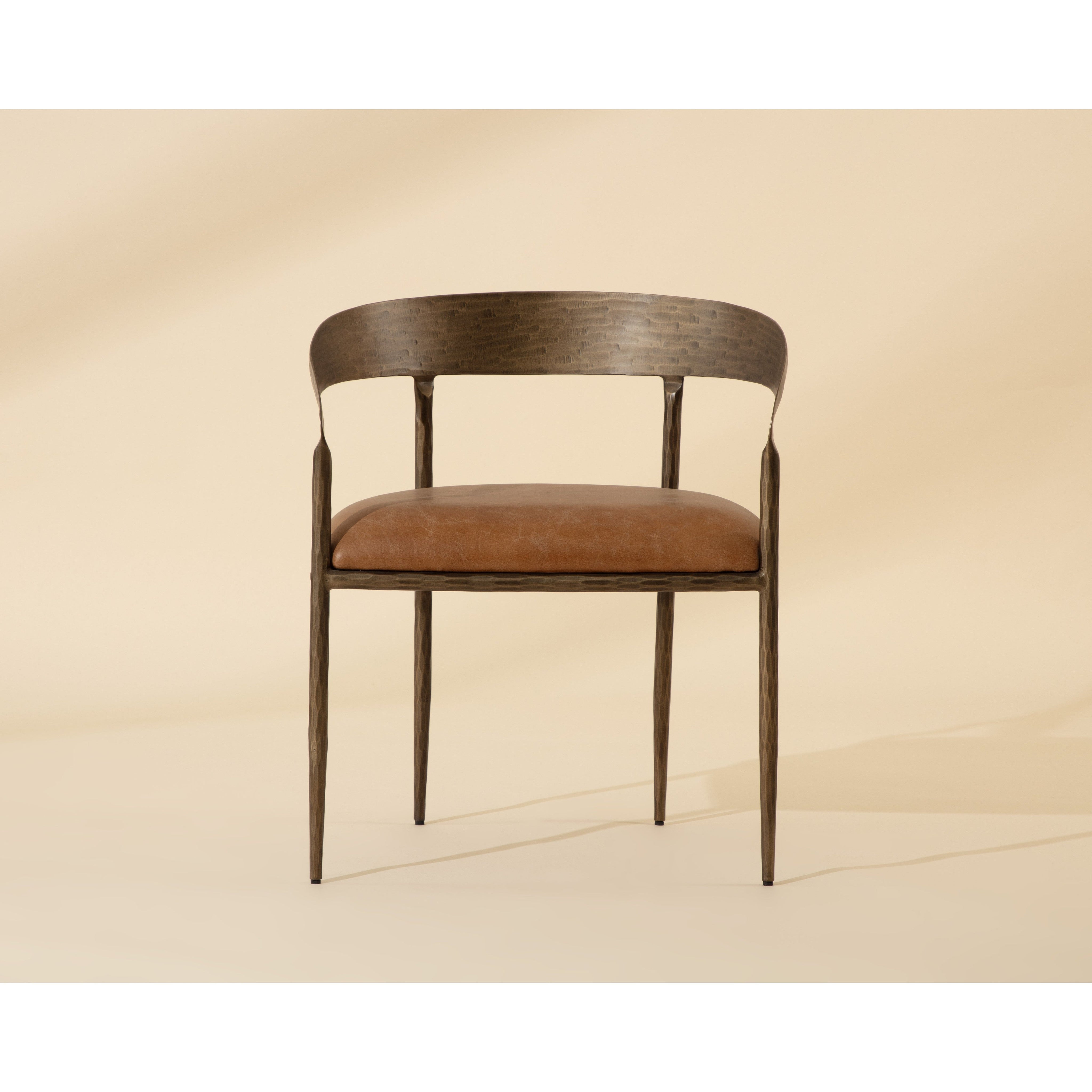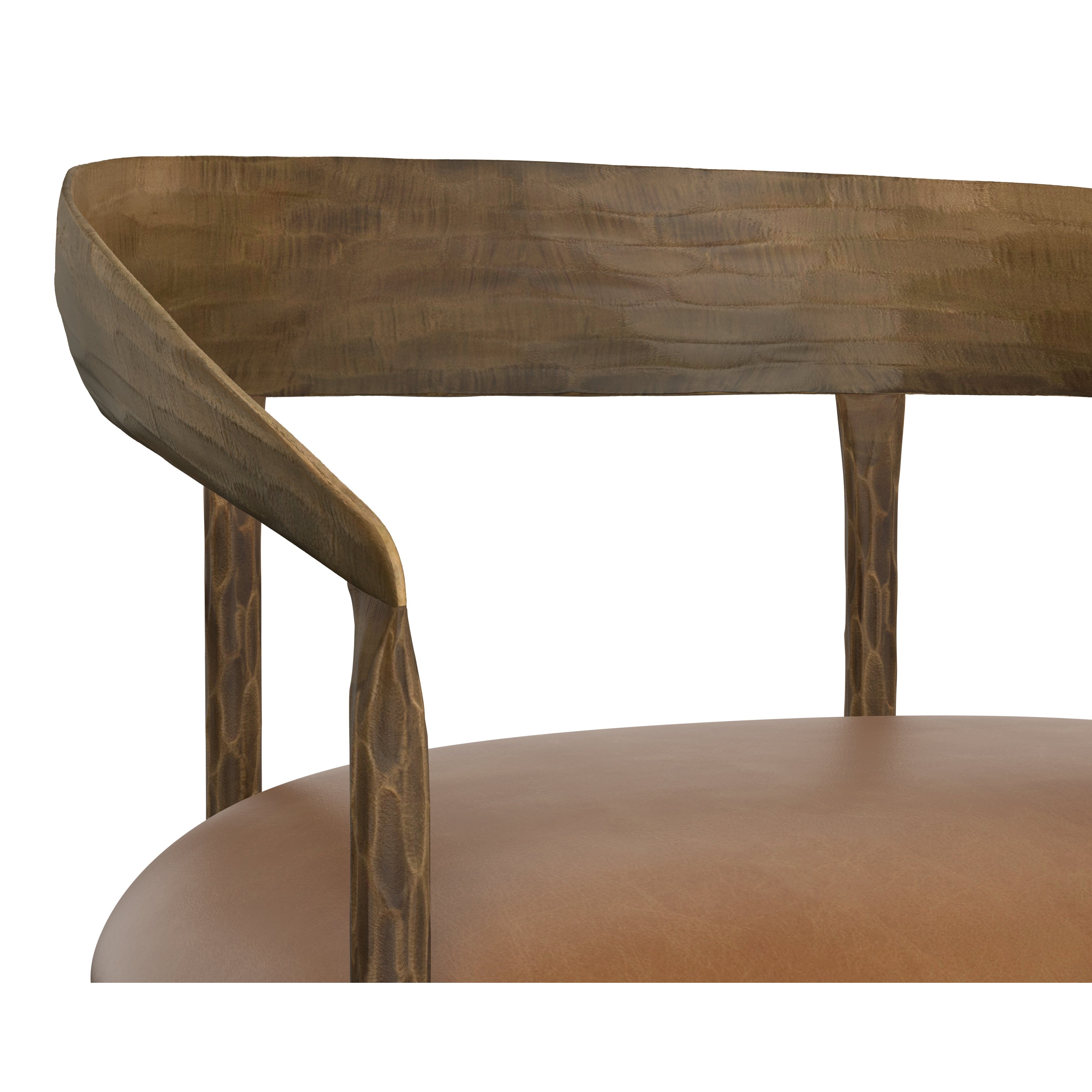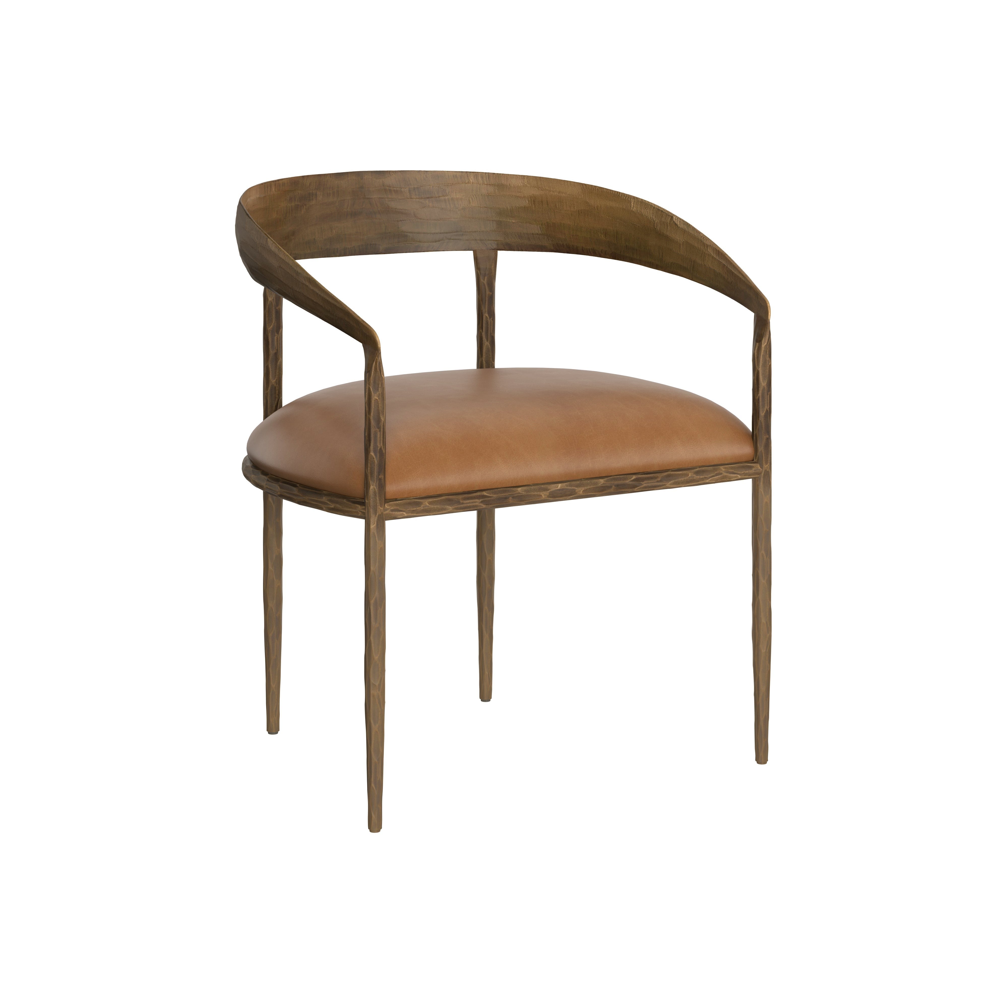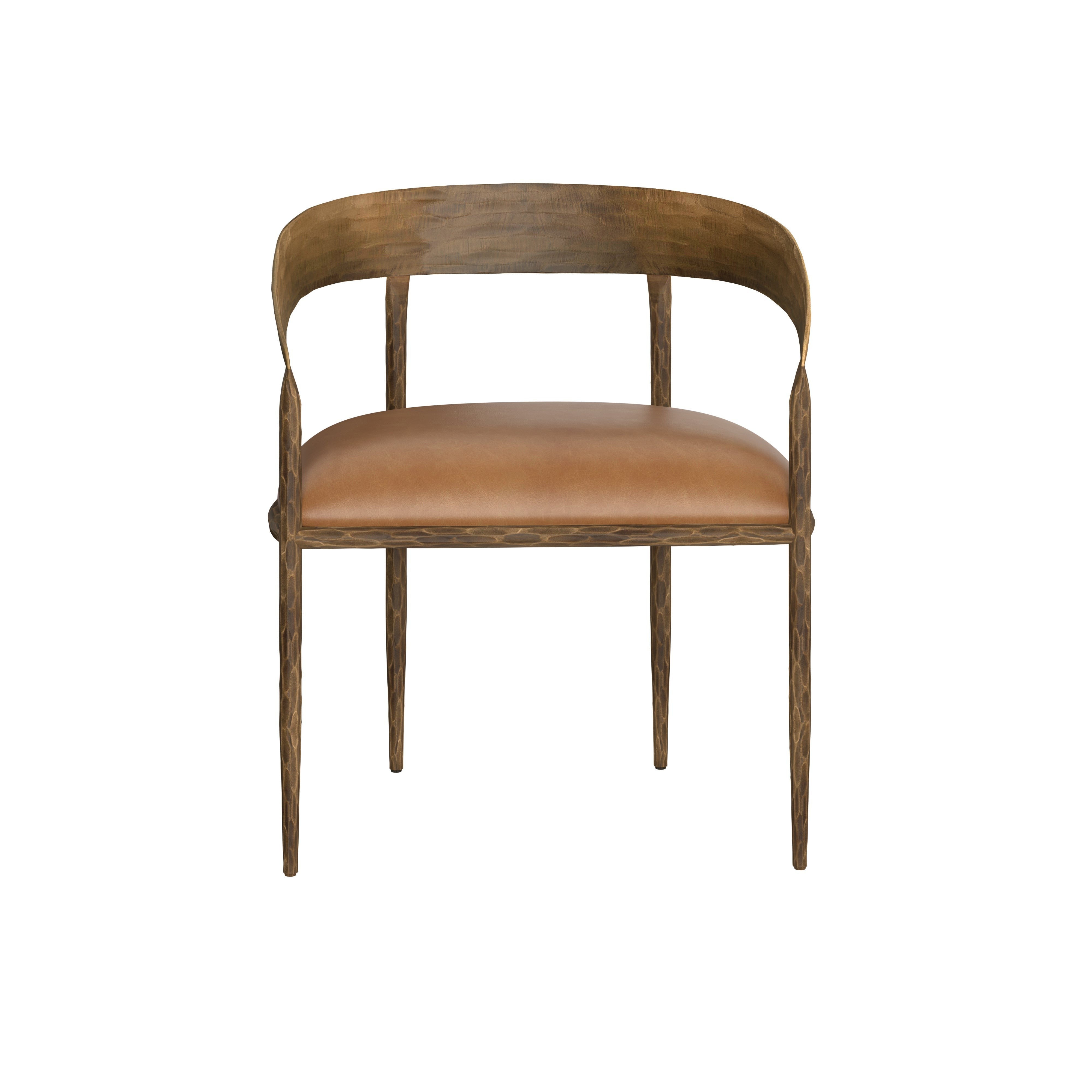 The Zanatta Dining Armchair is all about the subtle details. The hammered metal detailing in the antique brass curved frame provides visual interest that will stand out in any dining space. A tan leather seat completes the look. Handle with Care: This design has been crafted with aniline leather. Leather is a natural material; as such, colour variations, markings, wrinkles, grooves and light scratches are acceptable and appreciated characteristics. No two pieces are alike. Visit our Product Care page for more information on how to ensure the lasting beauty of this piece. Made in India. With refined craftsmanship, this design was brought to life by skilled local artisans. Due to the nature of handcraftsmanship, unique imperfections such as fissures, markings and variations in colour and shape are welcomed and appreciated characteristics for a truly one-of-a-kind piece.