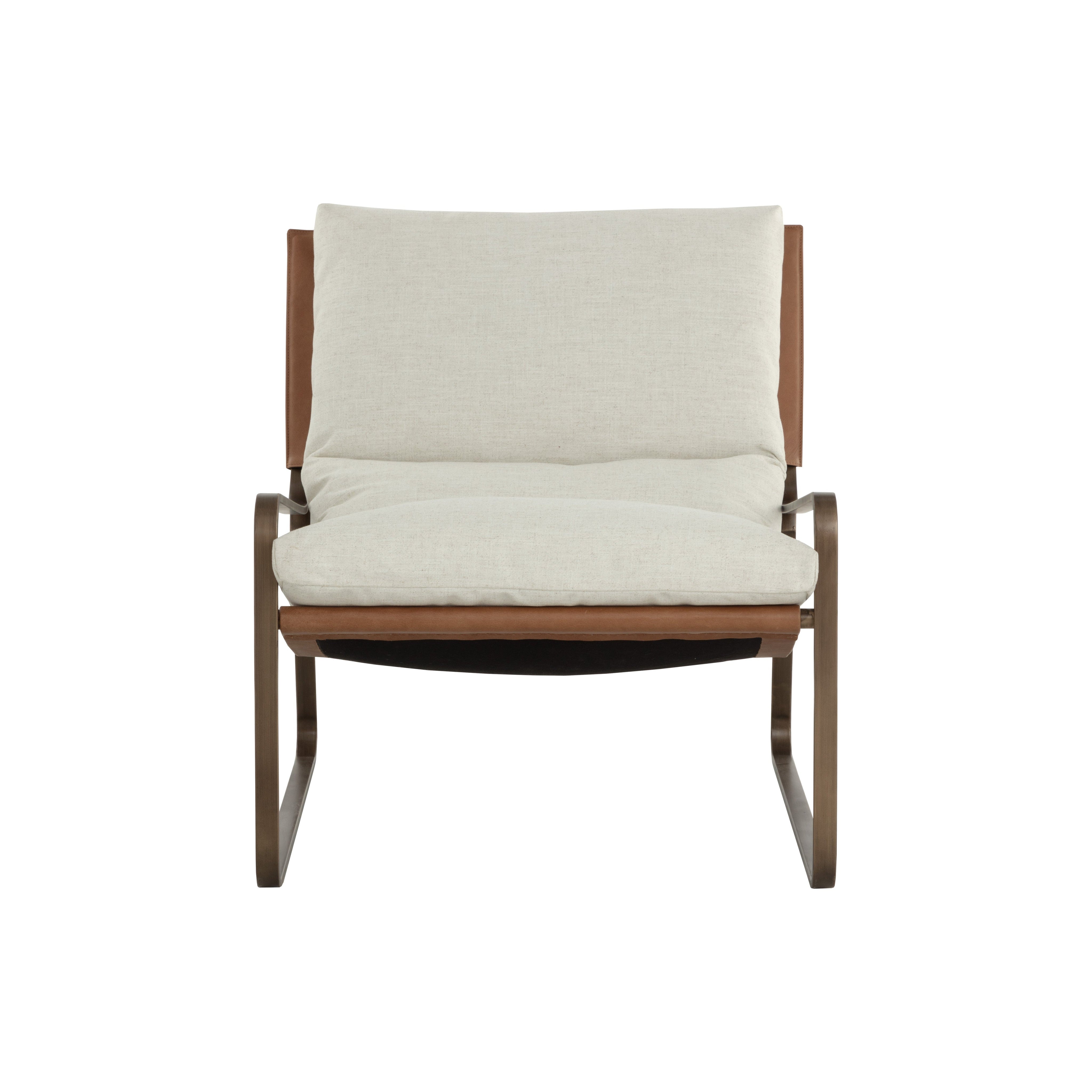 Unwind in comfort with this incredible lounge chair that features a stylish scooped seatback. Soft cushions are upholstered in geralt linen performance fabric with a contrasting tan leather back and completed with an antique brass frame